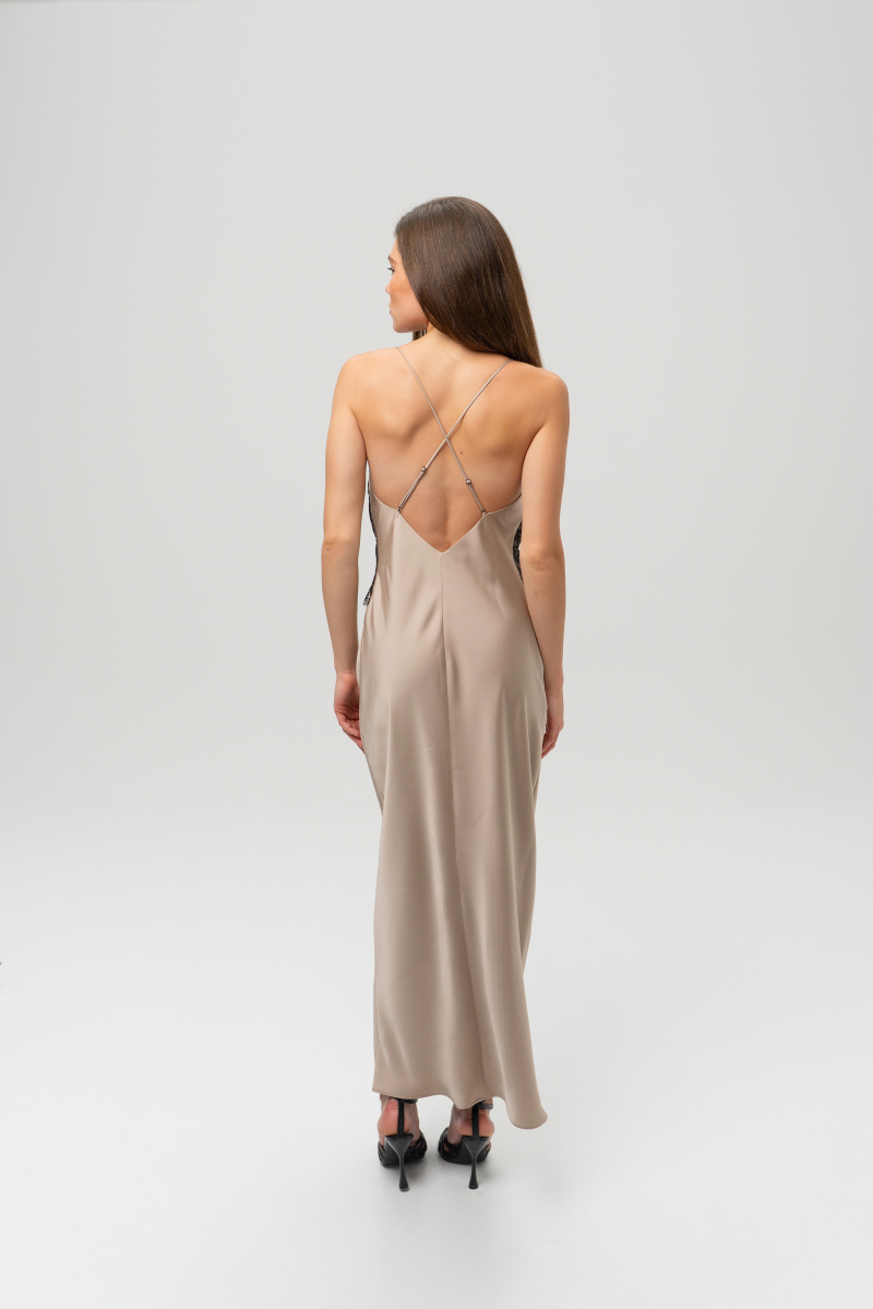 Лаконичное платье-комбинация с отделкой кружевом длины макси мягко подчеркивает силуэт. Легкий и дышащий материал подарит комфорт.