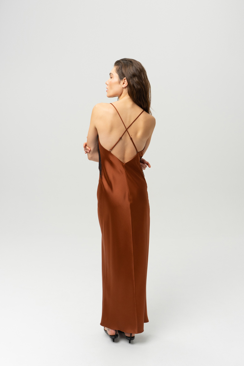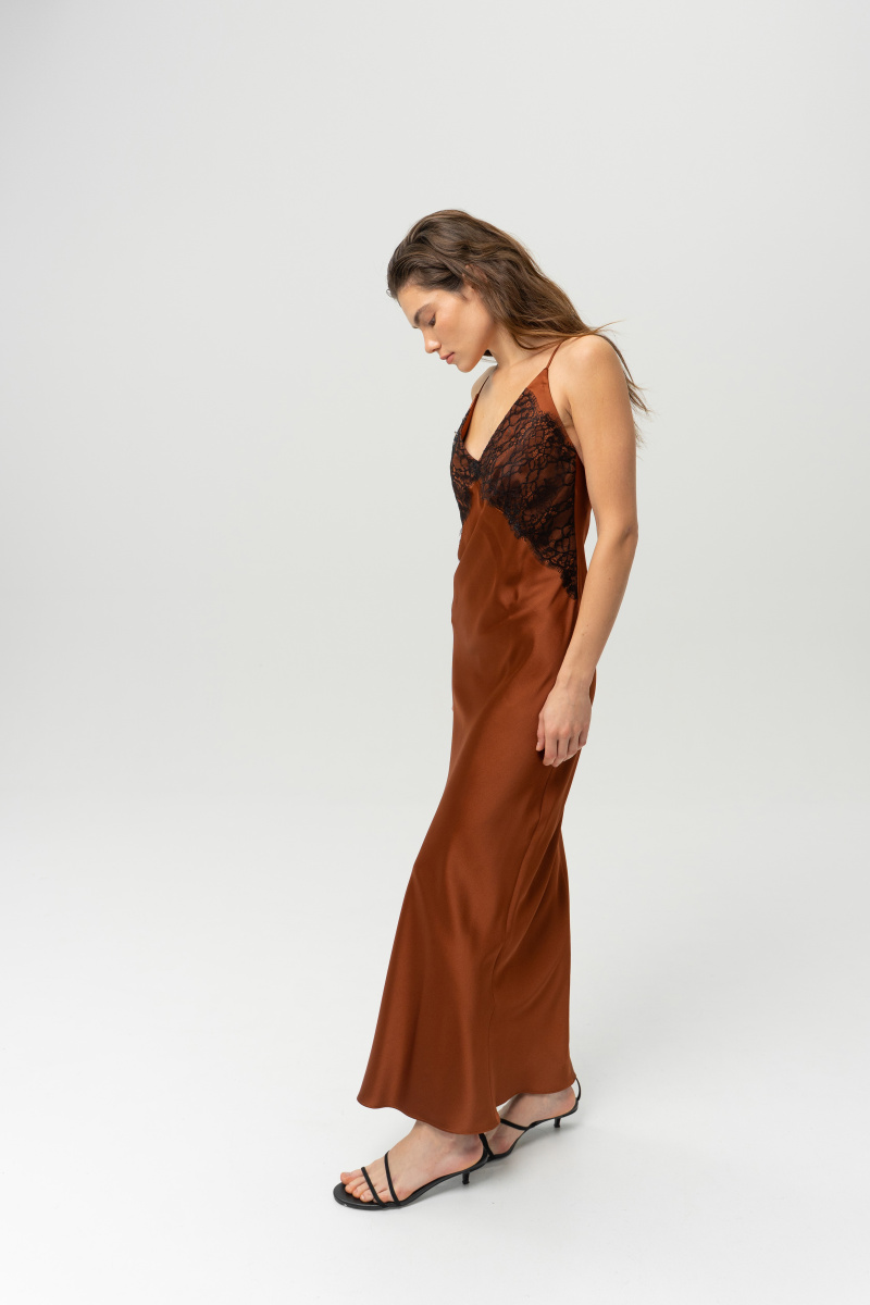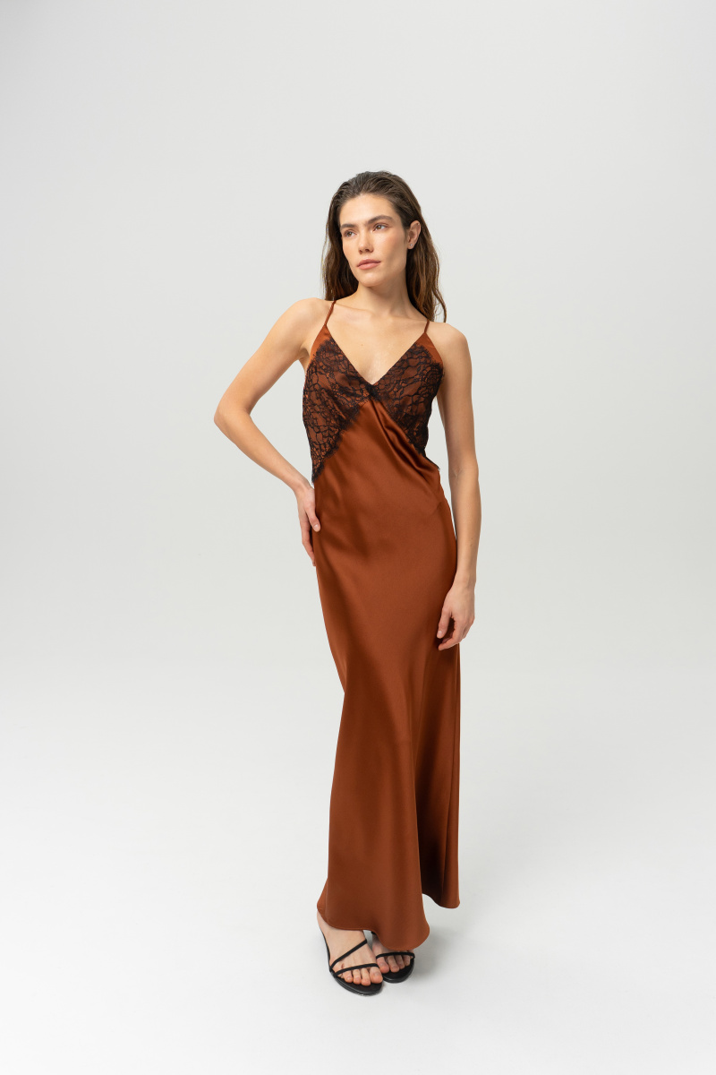 Лаконичное платье-комбинация с отделкой кружевом длины макси мягко подчеркивает силуэт. Легкий и дышащий материал подарит комфорт.