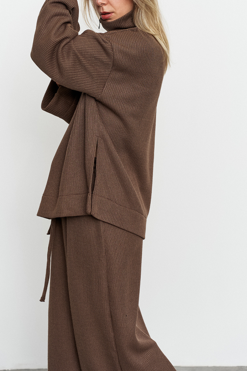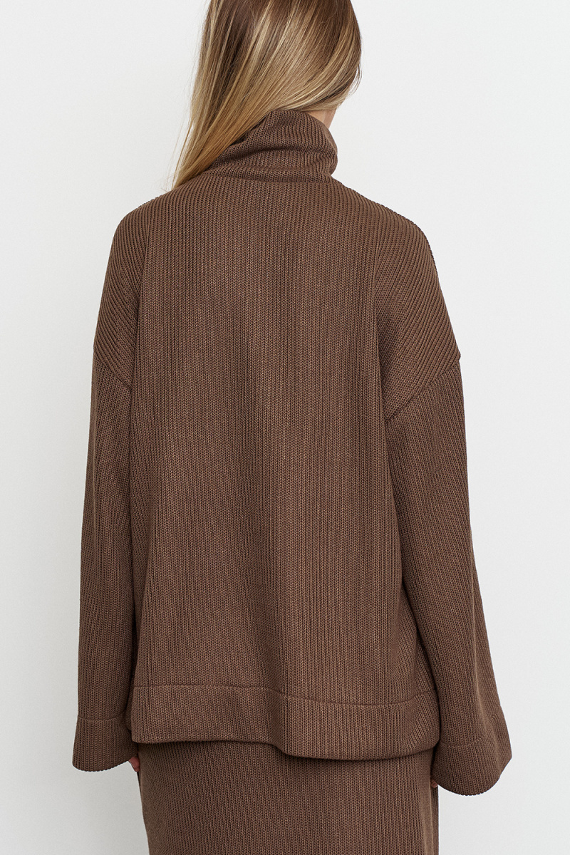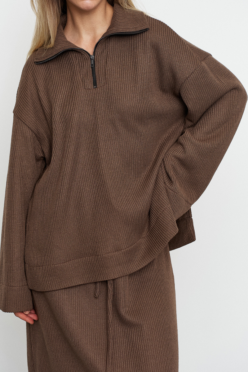 Джемпер в едином размере, выполненный в уютном и свободном крое с длинными рукавами и высокой горловиной на молнии. Модель отличается текстурной вязкой и боковыми разрезами, что добавляет комфорта и современного вида.