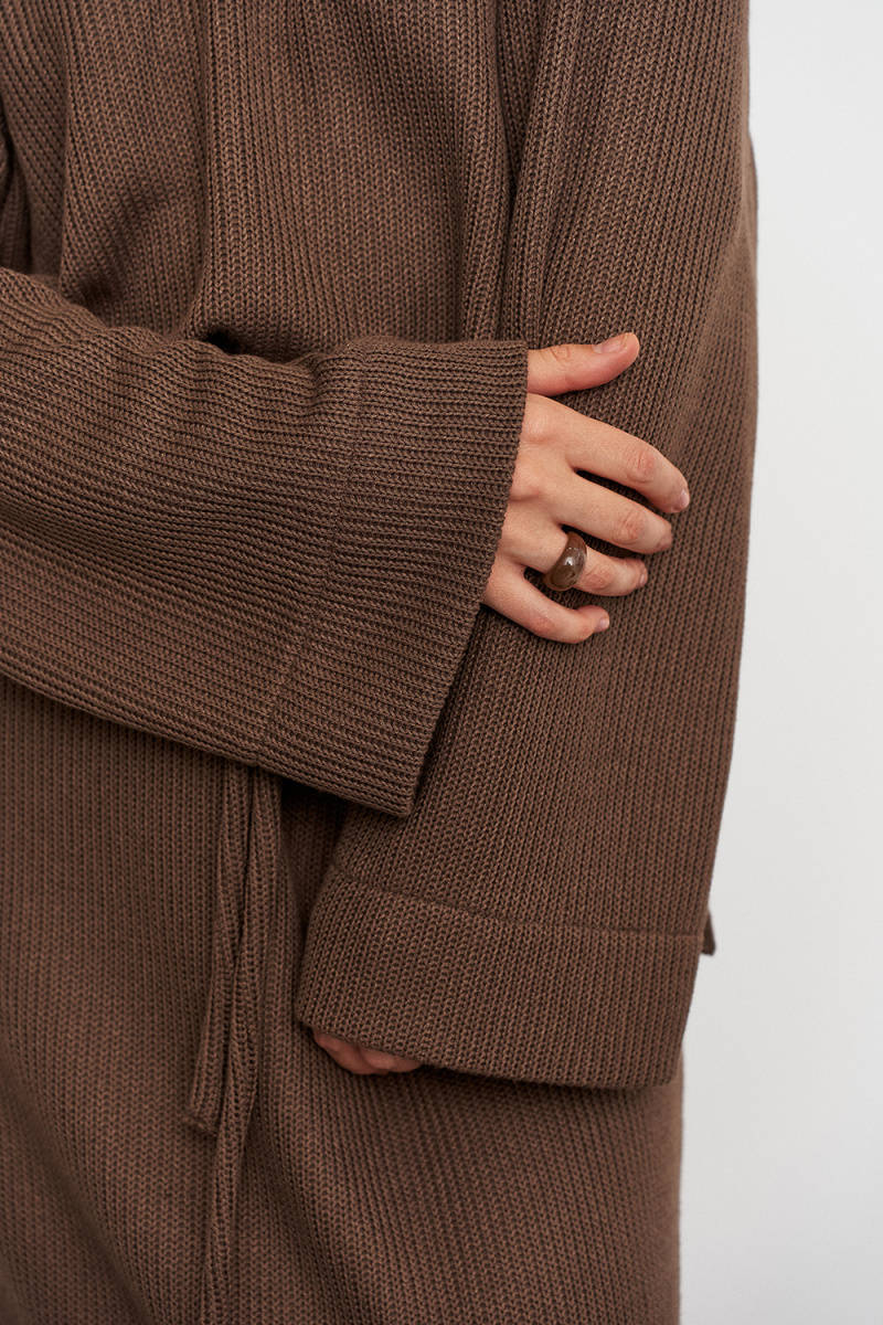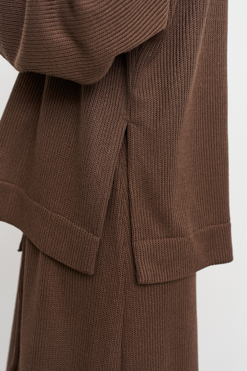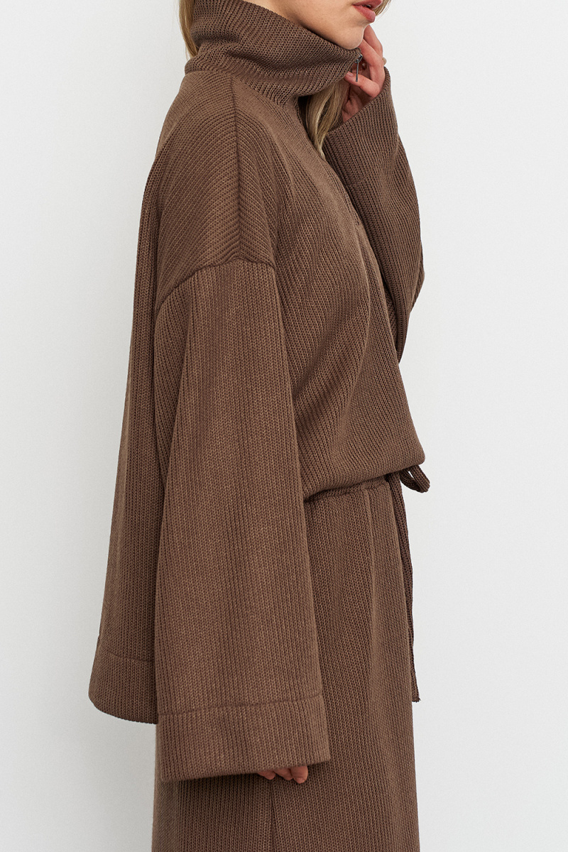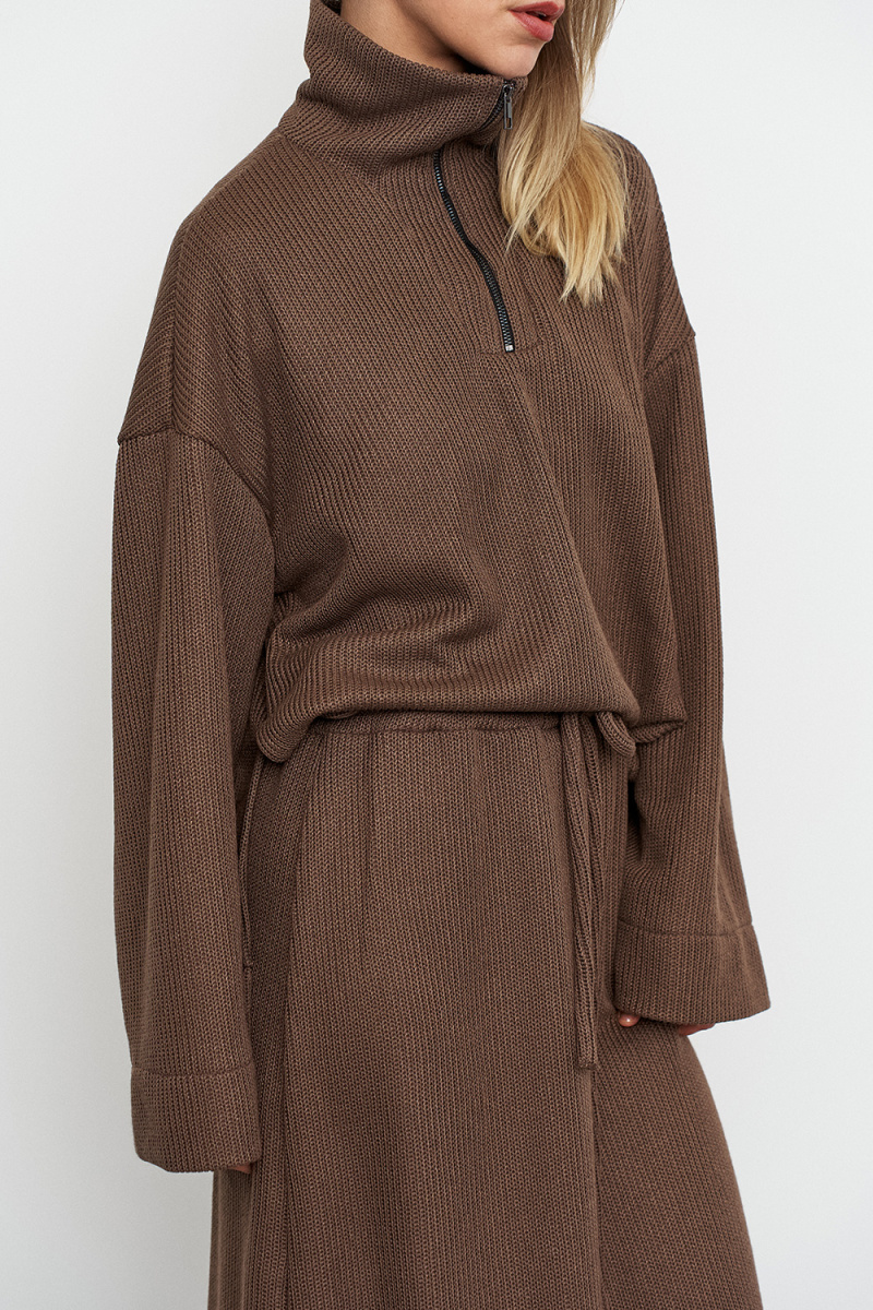 Джемпер в едином размере, выполненный в уютном и свободном крое с длинными рукавами и высокой горловиной на молнии. Модель отличается текстурной вязкой и боковыми разрезами, что добавляет комфорта и современного вида.