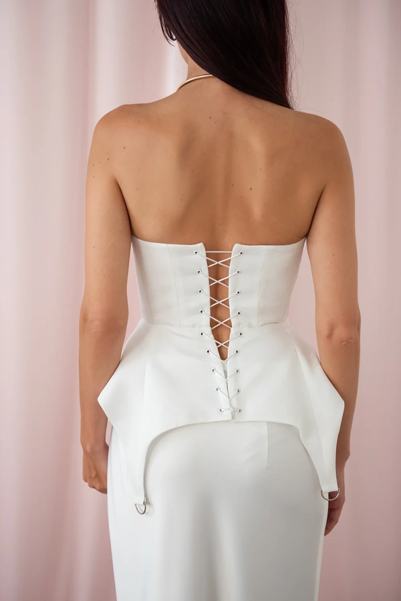 Корсет с блестящим отливом и декоративной баской в черном и белом цвете. Универсальная вещь, сочетающаяся с любым низом — от брюк до пышных юбок.