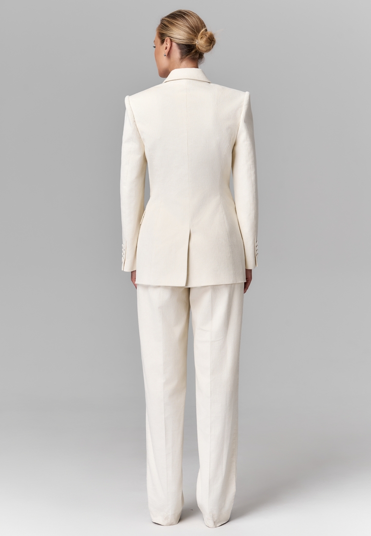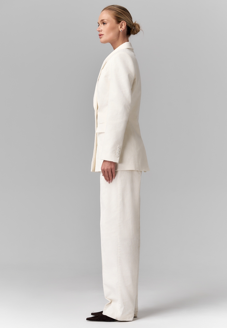 Вельветовый двубортный молочный жакет с чёткой линией плеча и классическими лацканами. У жакета прямой крой, длина до середины бедра, два функциональных кармана с клапанами. Вельветовая фактура придаёт изделию уют и небольшую текстурную глубину, создавая современный и стильный образ, который легко сочетать и с деловой, и с повседневной одеждой.