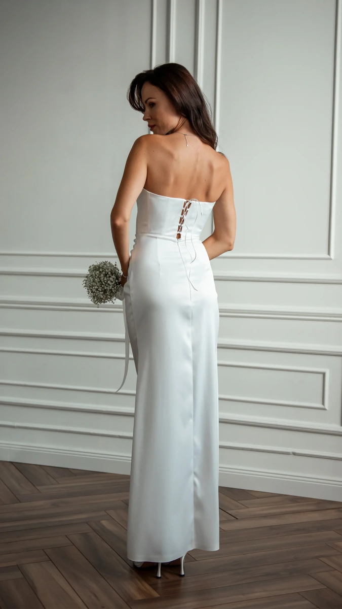 Белое платье в длине макси с корсетным верхом и юбкой с драпированным разрезом. Игра объемов и линий создает гармоничный баланс образа.