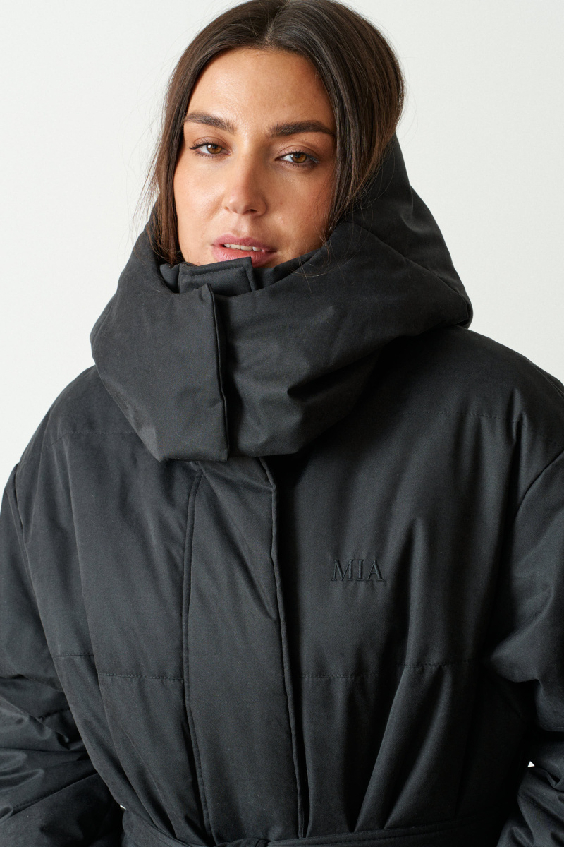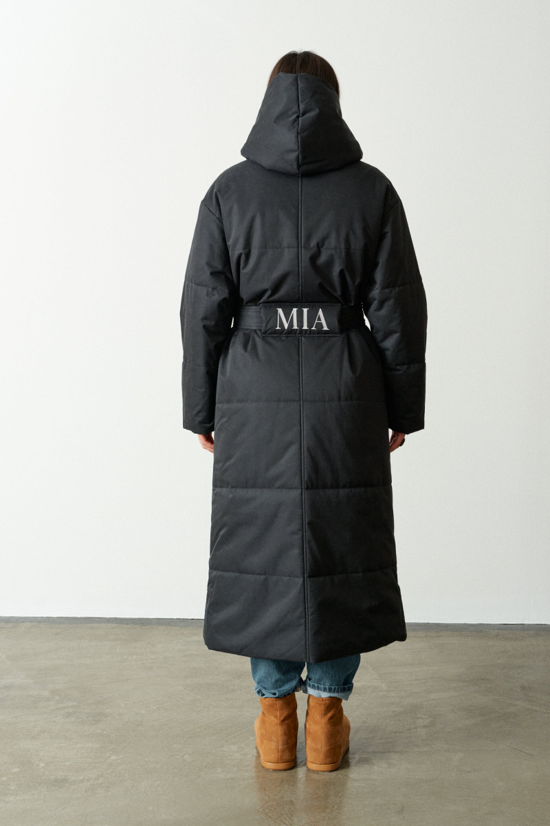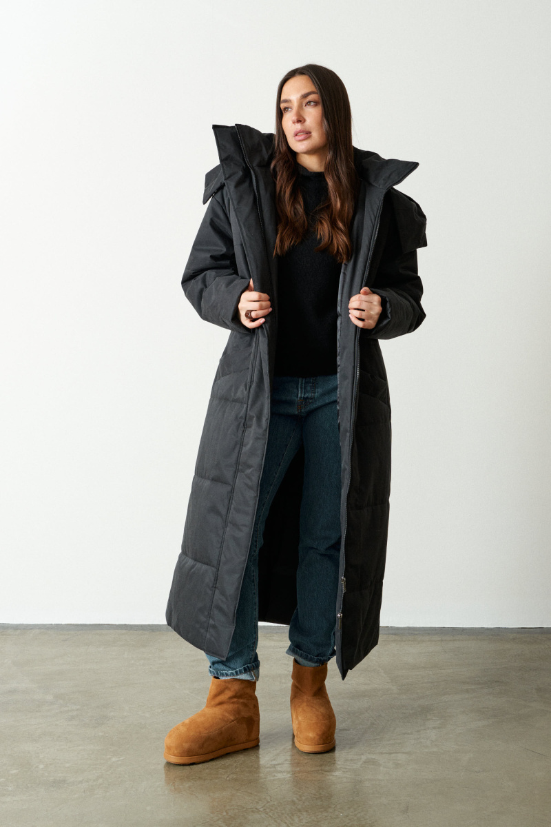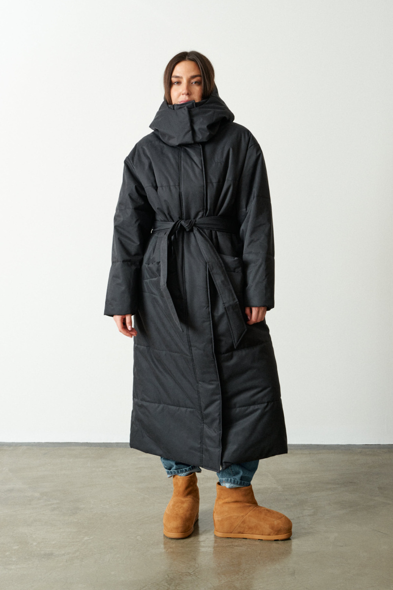 Пальто прямого кроя, со спущеным плечом. Выполнено из водоотталкивающей непродуваемой, но обладающей высоким воздухообменом мембраны и бельгийского наполнителя isosoft. Подходит до - 20°С.