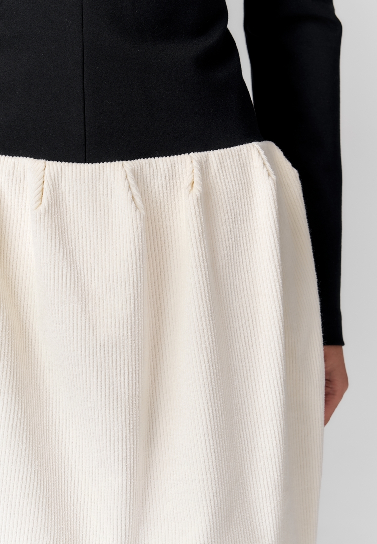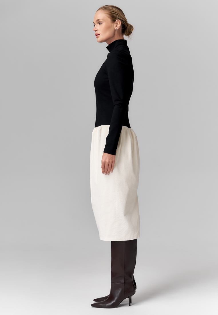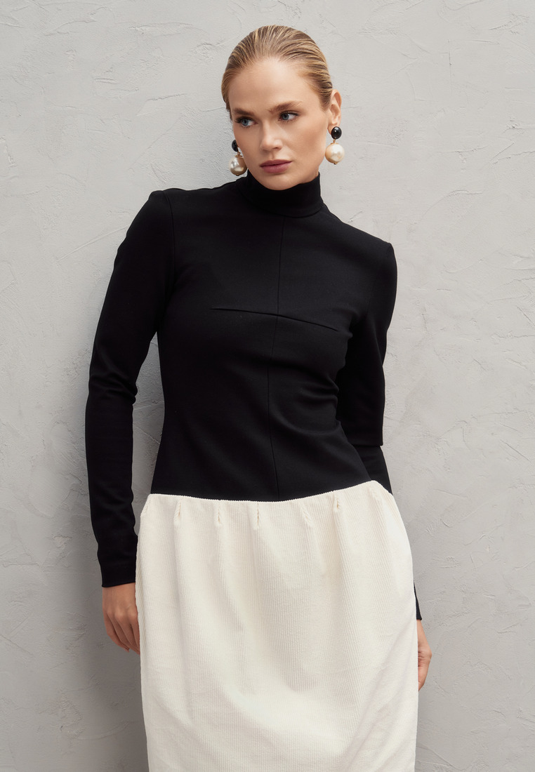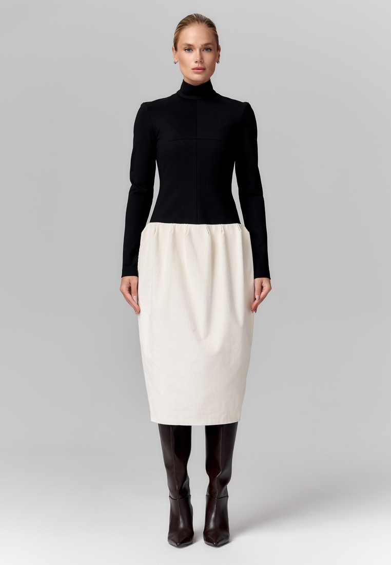 Комбинированное платье миди с облегающим чёрным трикотажным верхом и мягкой молочной вельветовой юбкой. Высокий воротник и длинные рукава формируют строгий и изящный силуэт, а контраст текстур и тонов придаёт образу современную элегантность и стильную выразительность. Отличный выбор для тех, кто ценит сочетание комфорта и утончённого дизайна.
