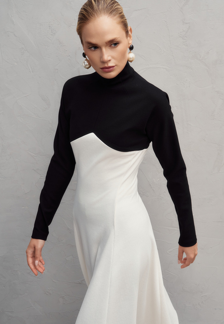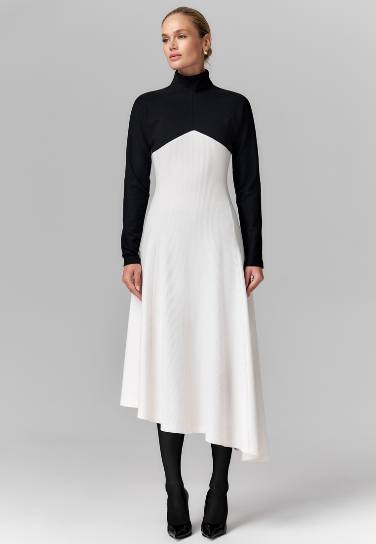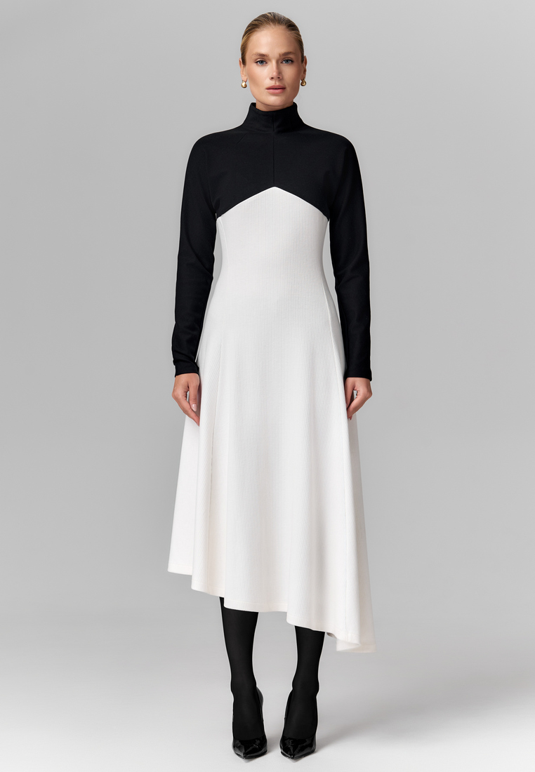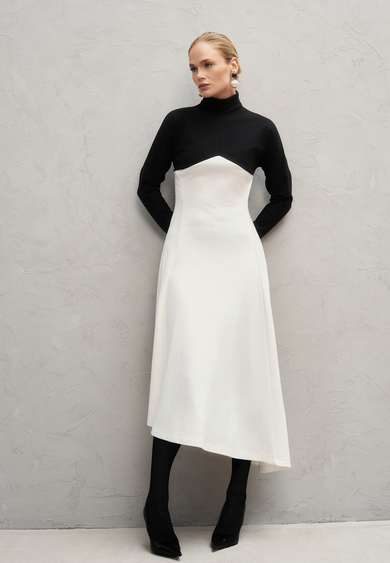 Именно это платье — идеальный пример элегантного контраста, где строгий чёрный верх с высоким воротом и длинными рукавами плавно переходит в свободный белый низ с асимметричным подолом. Такое сочетание чёрного и белого подчёркивает изящество силуэта и создаёт эффектный визуальный баланс между сдержанностью и лёгкостью. Материалы: плотный, отлично держит форму, и мягкий трикотаж, который добавляет комфорт.