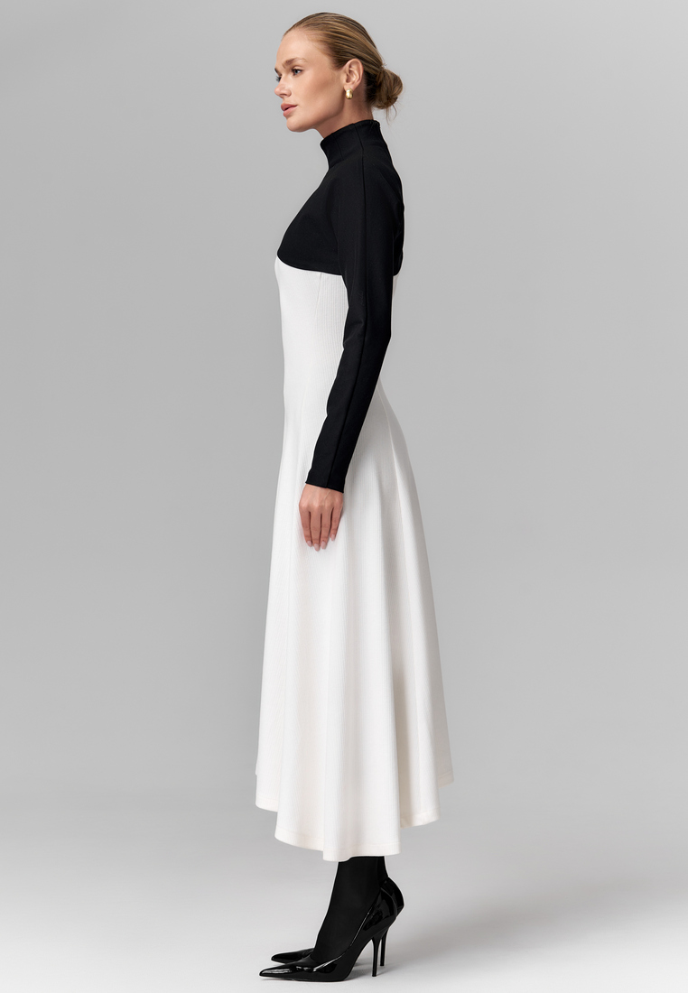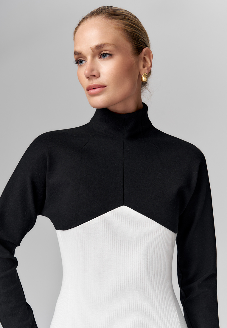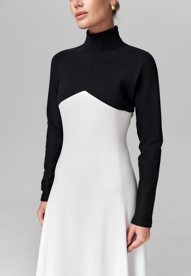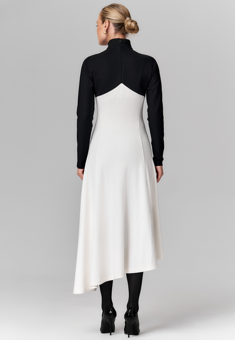 Именно это платье — идеальный пример элегантного контраста, где строгий чёрный верх с высоким воротом и длинными рукавами плавно переходит в свободный белый низ с асимметричным подолом. Такое сочетание чёрного и белого подчёркивает изящество силуэта и создаёт эффектный визуальный баланс между сдержанностью и лёгкостью. Материалы: плотный, отлично держит форму, и мягкий трикотаж, который добавляет комфорт.