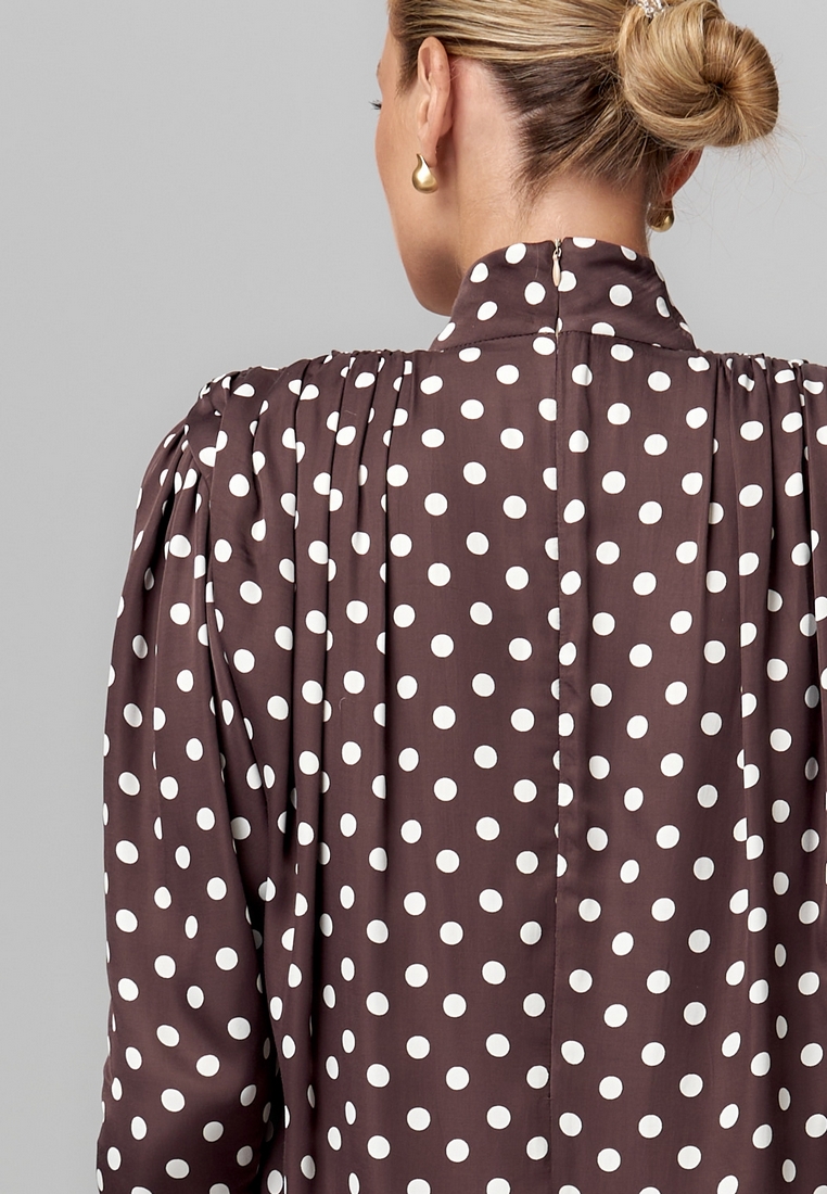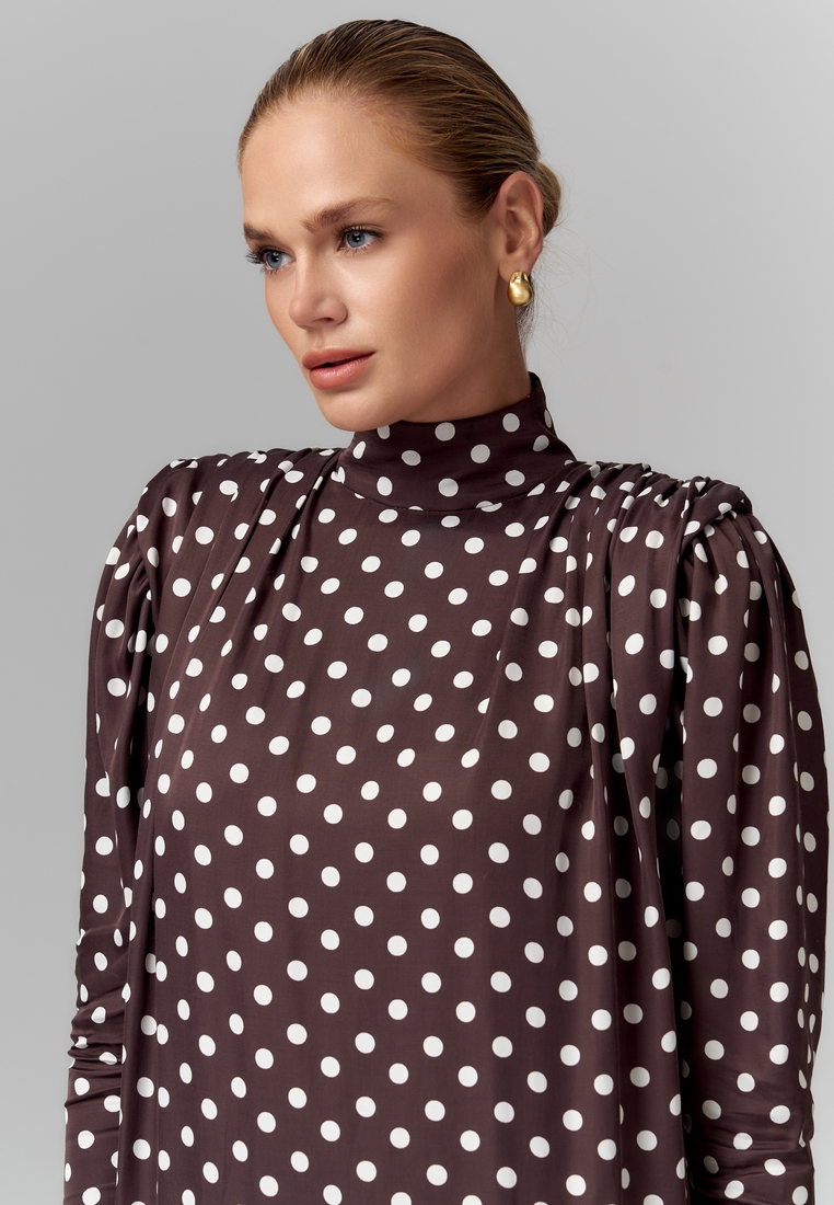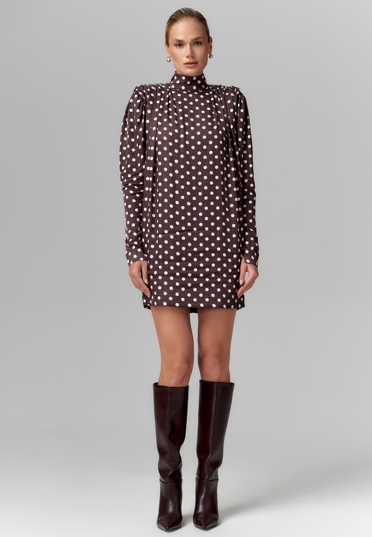 Короткое платье из плотной плательной вискозы насыщенного шоколадного оттенка с милым молочным горохом. Воротник-стойка и длинные рукава с аккуратными сборками на плечах создают элегантный, закрытый силуэт, а вставленные плечики добавляют модели выразительности. Игривый принт и комфортная длина сбалансируют строгость и придают образу лёгкую неформальность. Платье на подкладке.