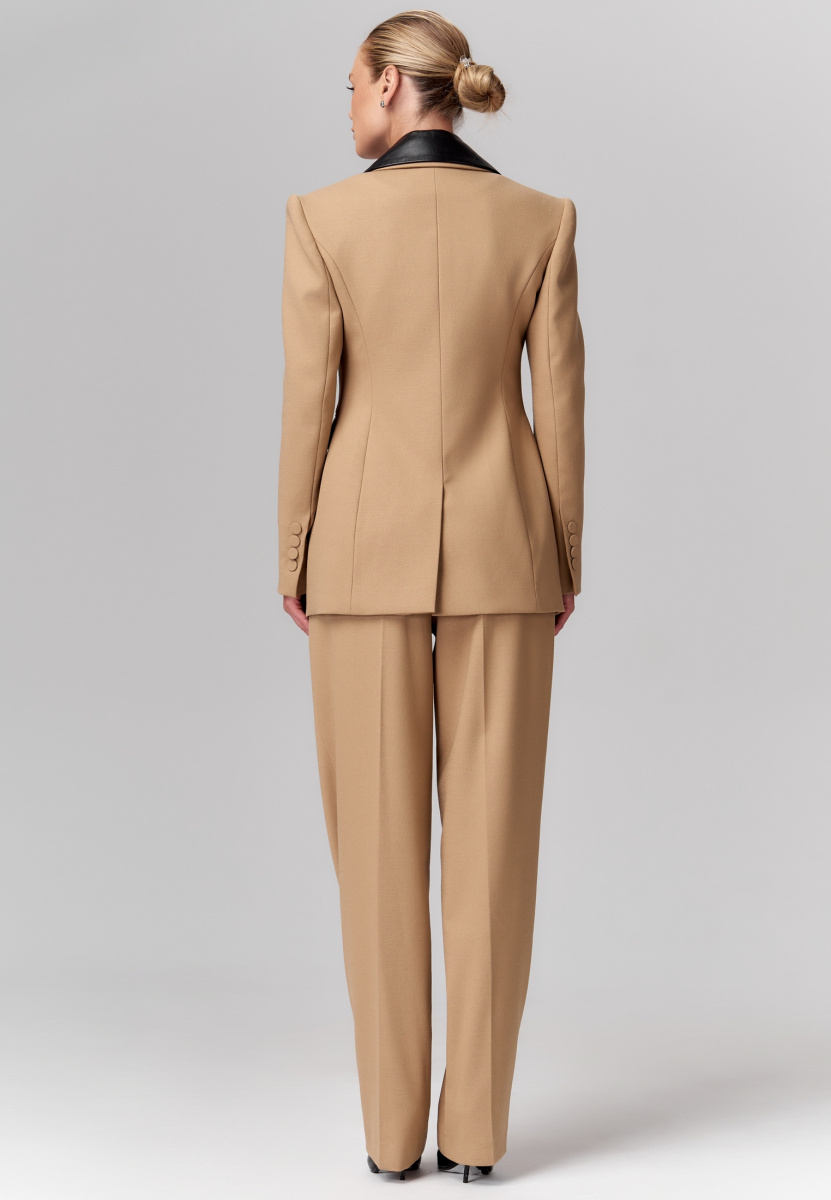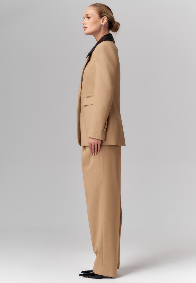 Спинка с рельефными и средним швами, нижняя часть со шлицей. Воротник пиджачного типа на отрезной стойке с прямыми углами лацканов.
