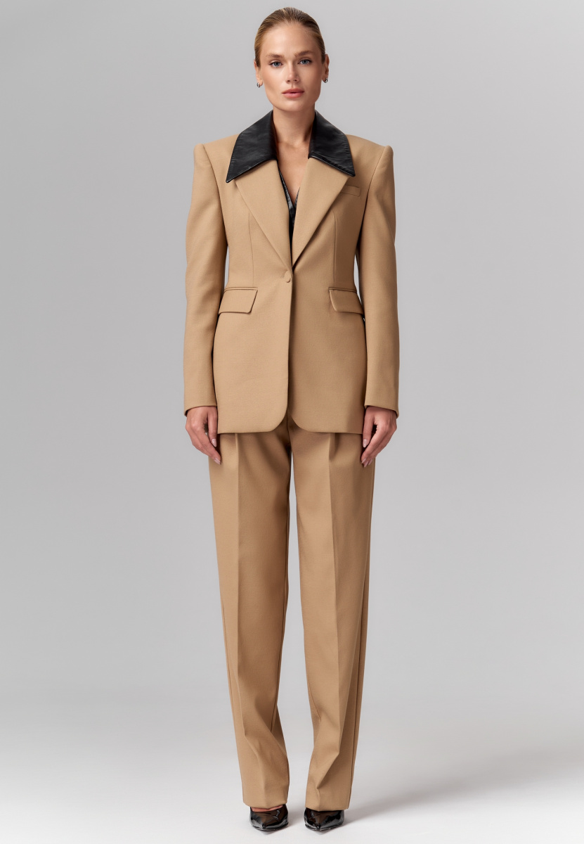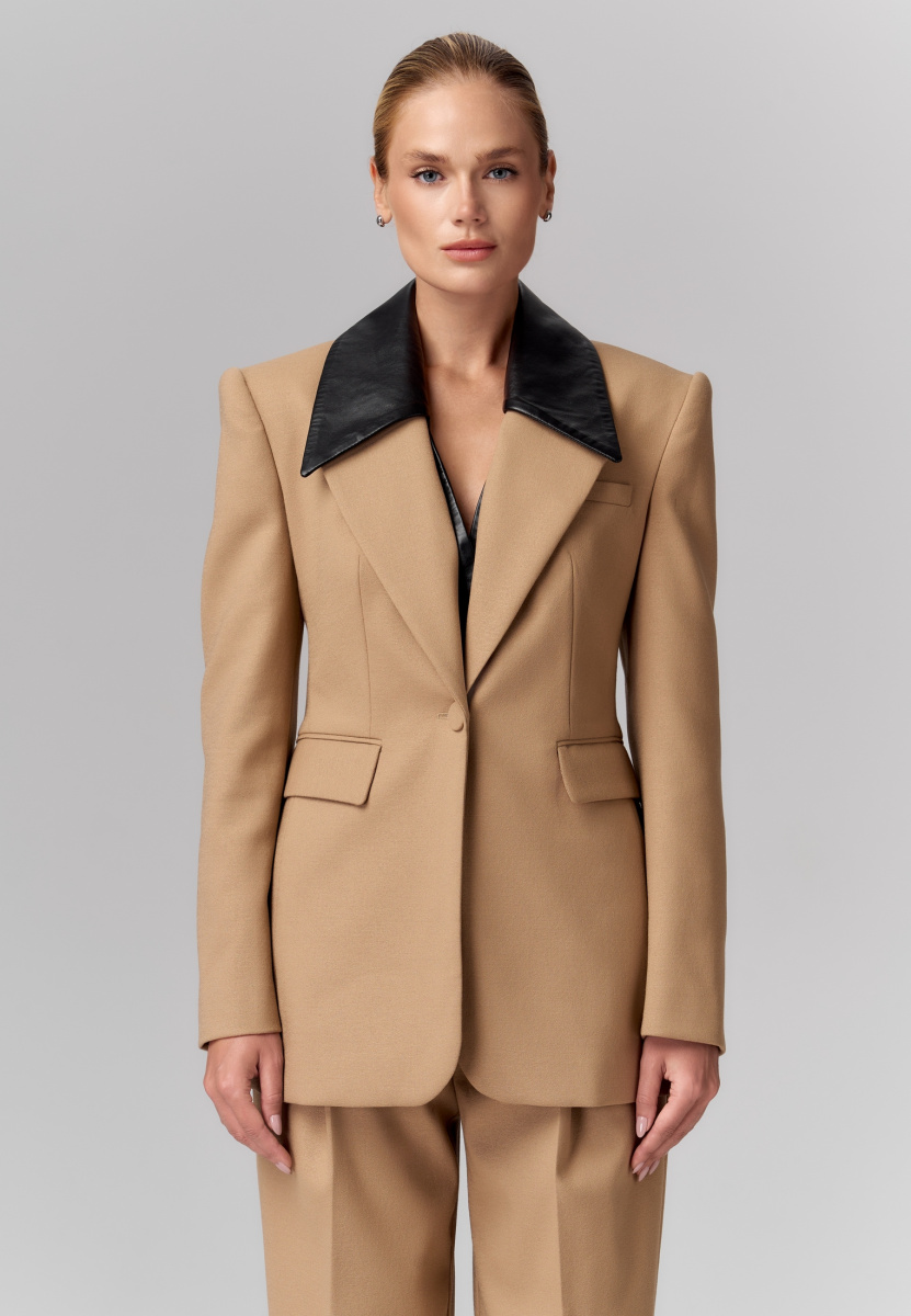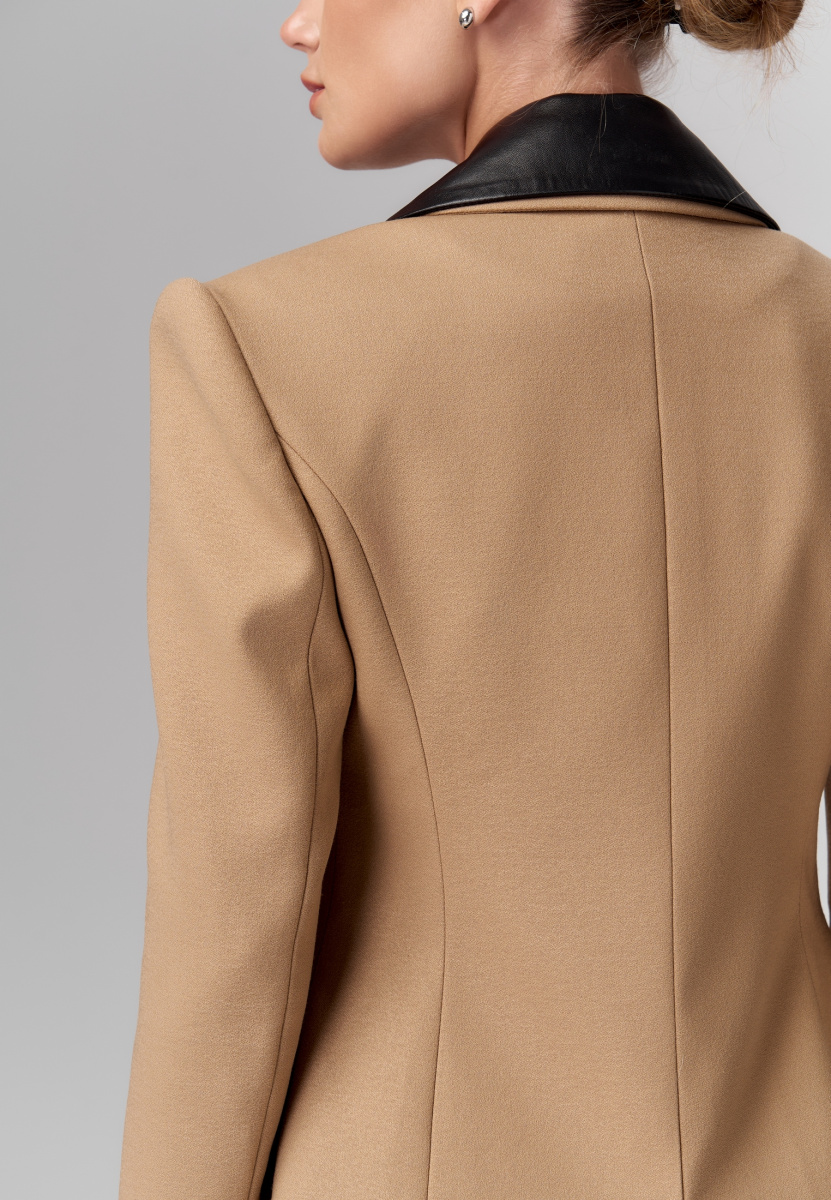 Жакет на подкладке со съёмной манишкой из натуральной кожи. Полуприлегающий силуэт, длина до бёдер, с втачными рукавами и однобортной застёжкой на одну петлю с пуговицей, обтянутой основной тканью.