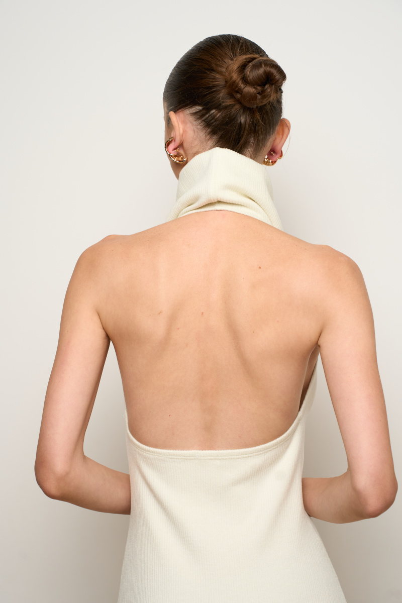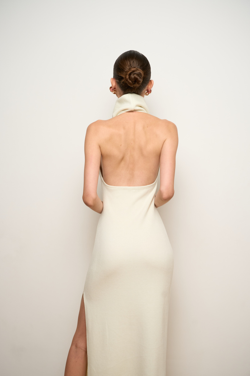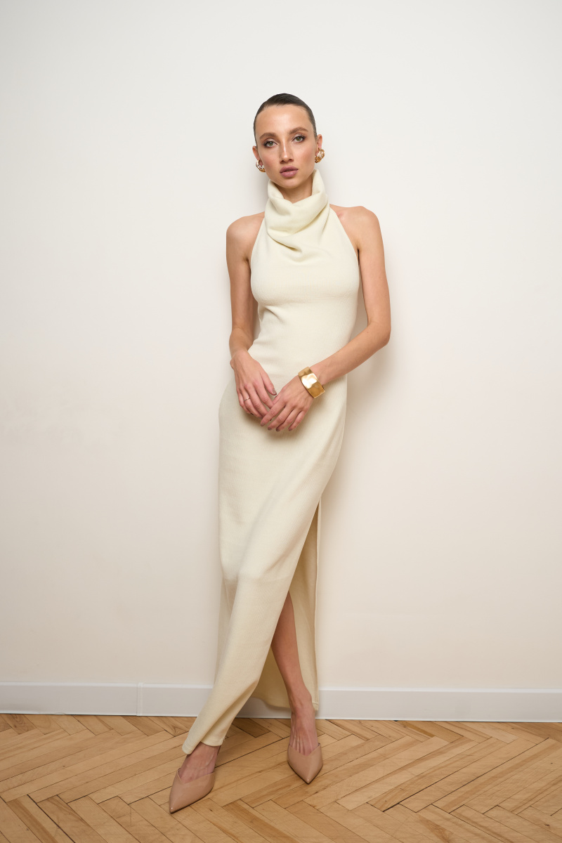 Это платье создано, чтобы вы выглядели безупречно. Воротник-стойка визуально вытягивает шею и осанку, придавая образу аристократичности. Сексуальный разрез на ноге позволяет двигаться с легкостью и добавляет игривую нотку. Открытая спина делает платье по-настоящему праздничным и неординарным. С ним вы гарантированно окажетесь в центре внимания.