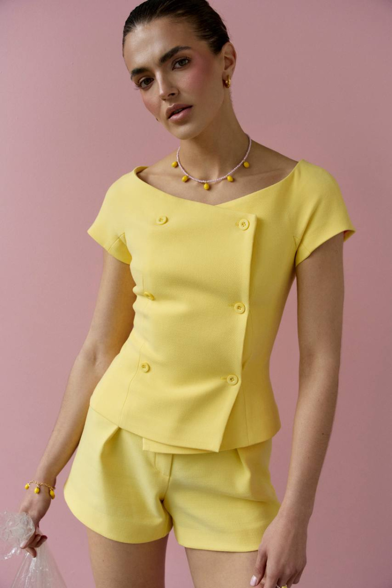 Большой город - место для ярких образов. Альтернатива классике - костюм в цвете Лимонный сорбет. Приталенный жакет и шорты свободного кроя. Осенью можно сочетать с сапогами трубами и пальто.