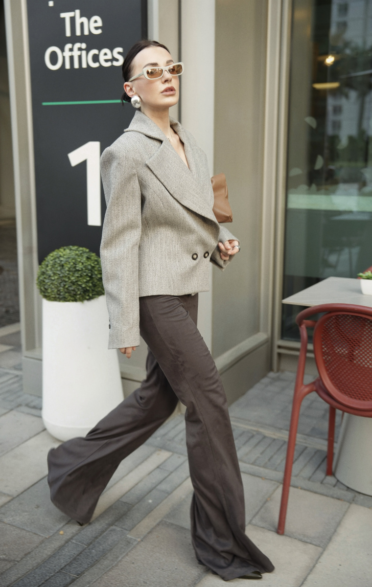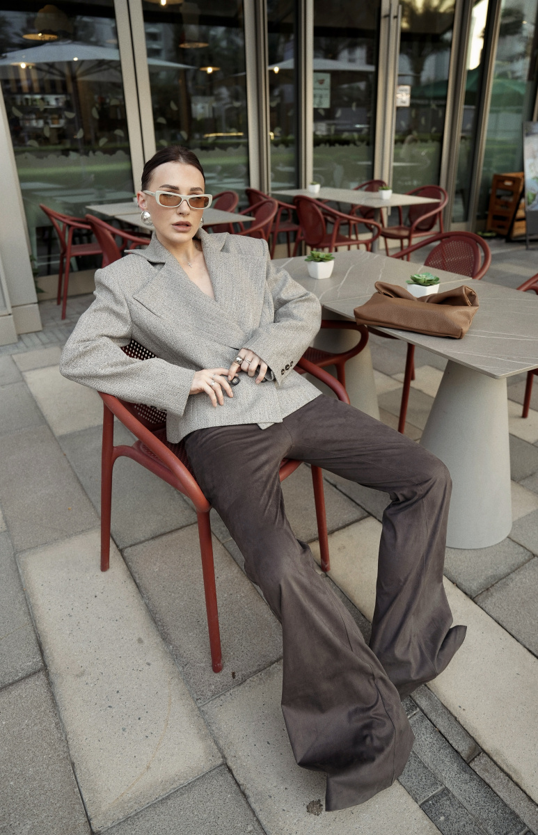 Брюки с идеальной посадкой, кроем и в стильном шоколадном оттенке. Модель клеш от колена идеально подчеркивает фигуру и создает образ женственным, акцентным и притягивающим взгляды. Материал замша очень приятный к телу и на ощупь.