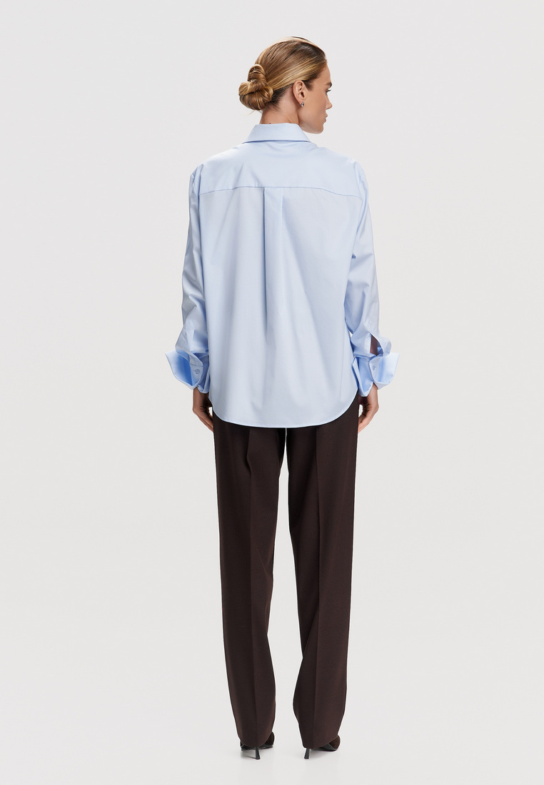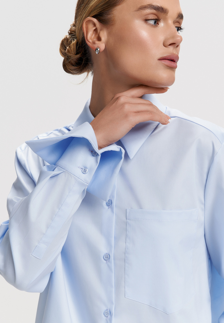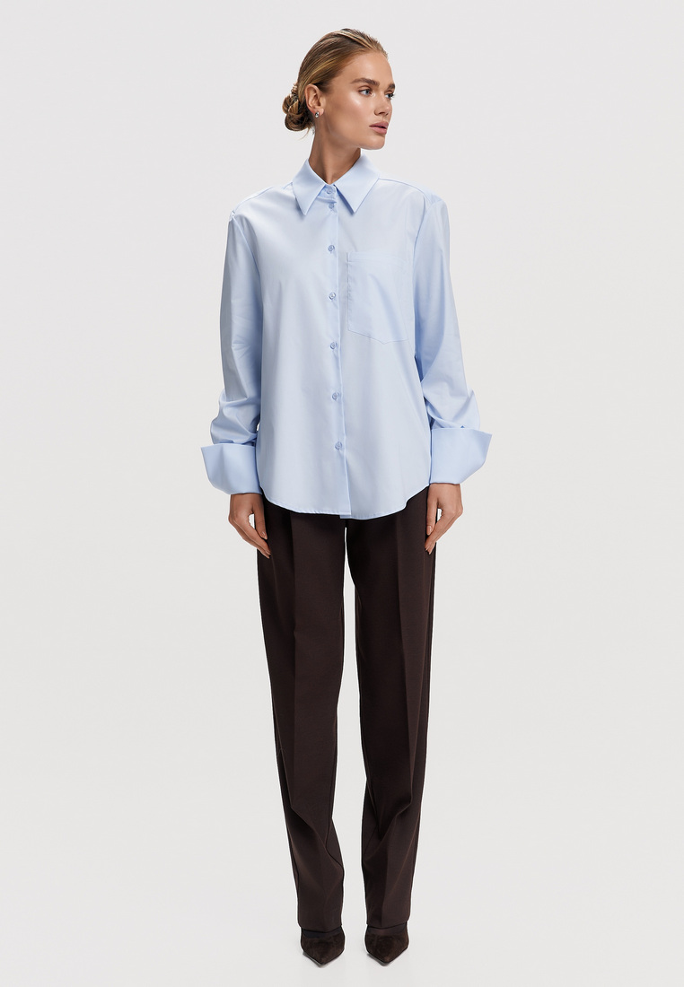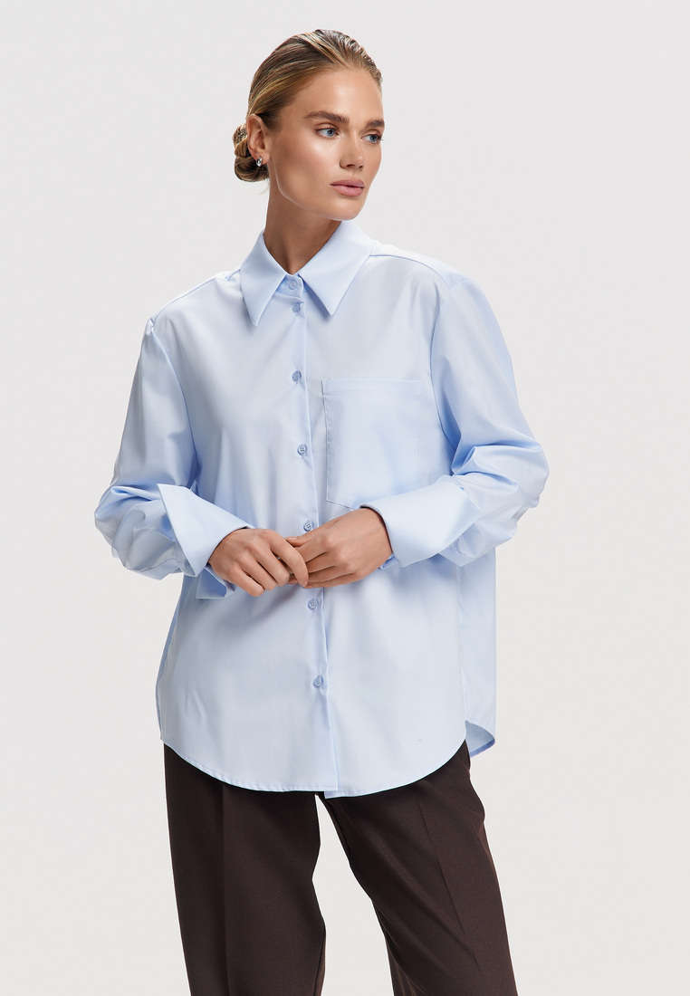 Блузка из хлопка нежно-голубого зефирного цвета в свободном стиле с классическим отложным воротником и длинными рукавами с высокими манжетами. Модель с накладным карманом и застегивается на пуговицы по всей длине. Идеальна для создания комфортного и стильного образа с элементами casual и делового стиля, отлично сочетается с брюками и юбками.