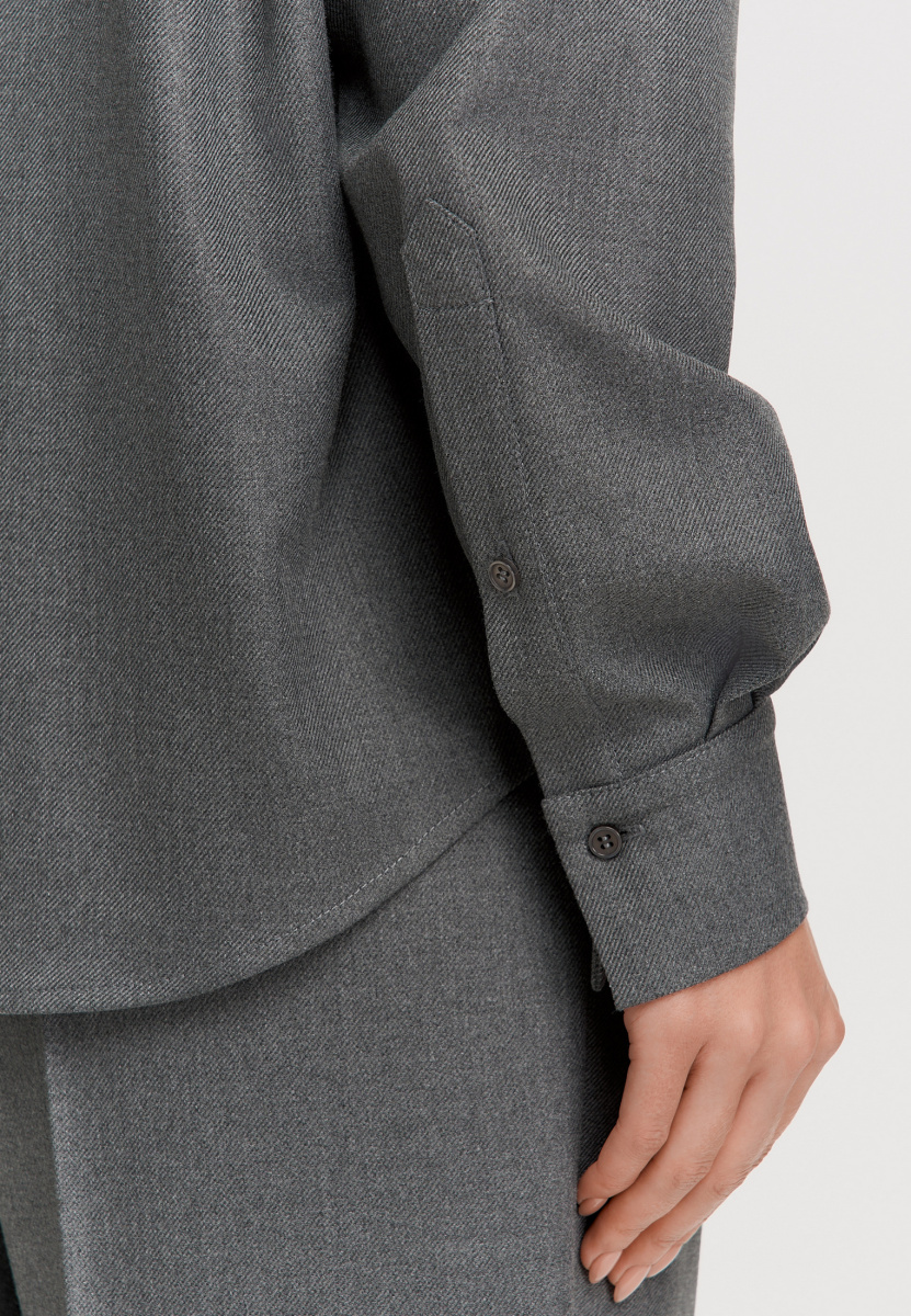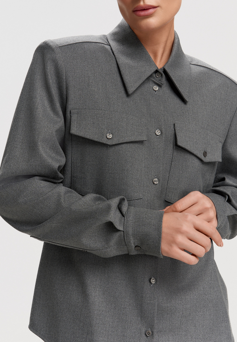 Рубашка из плотного полотна серого цвета свободного кроя, с широкими плечами и классическим отложным воротником. Длинные рукава с манжетами и центральная застёжка на пуговицы создают строгий, но современный силуэт. Накладные карманы с клапанами и цвет придают образу маскулинности.