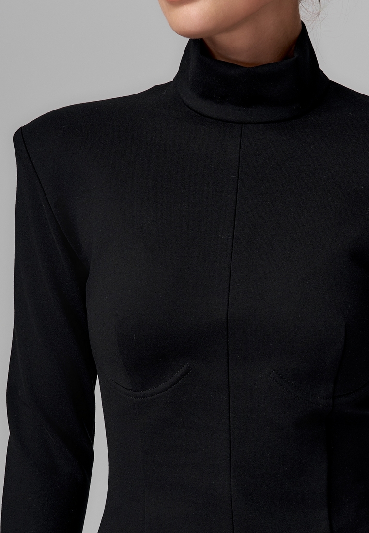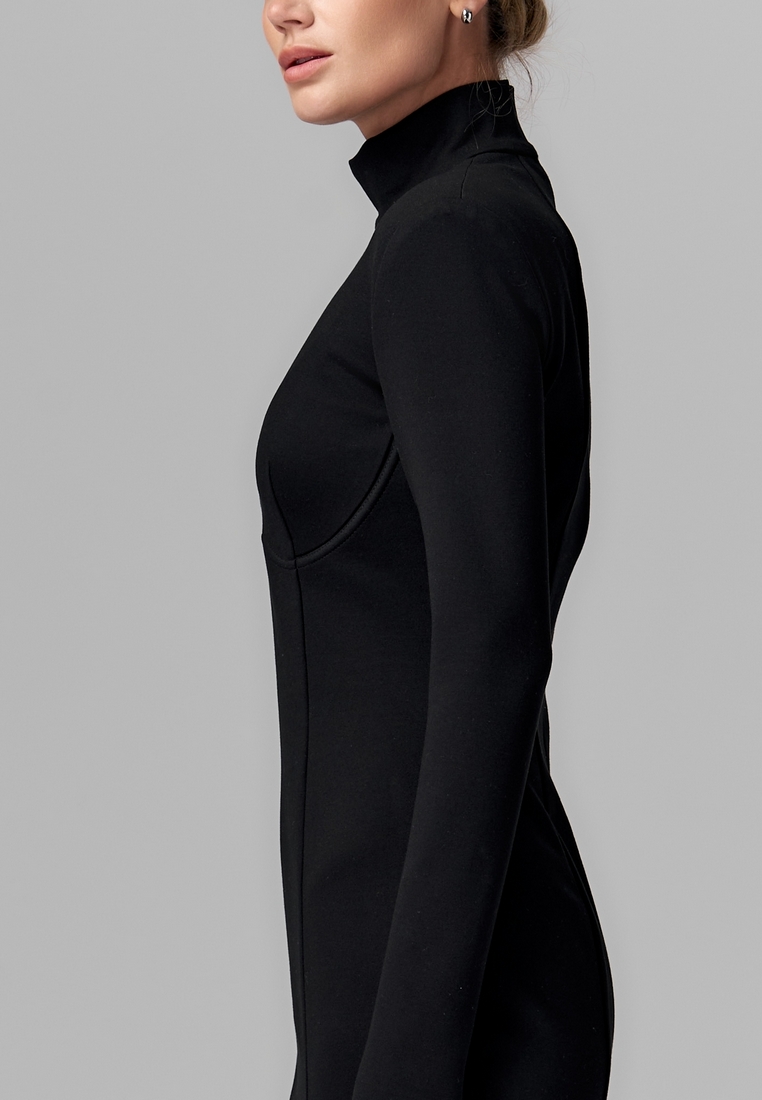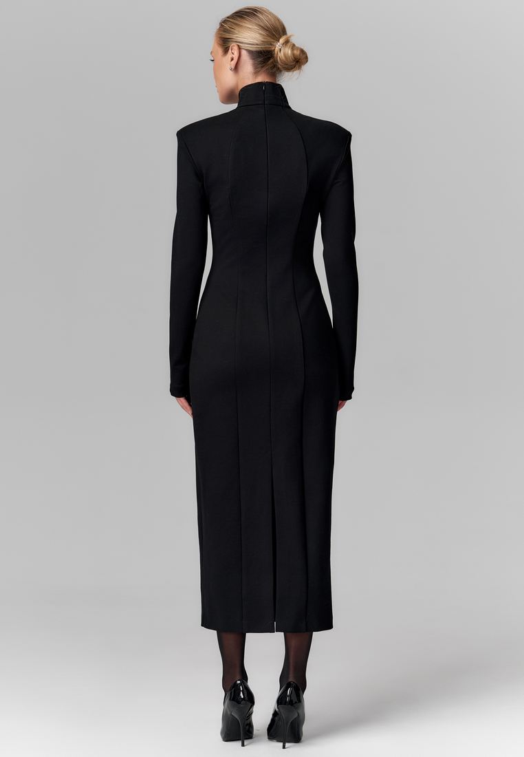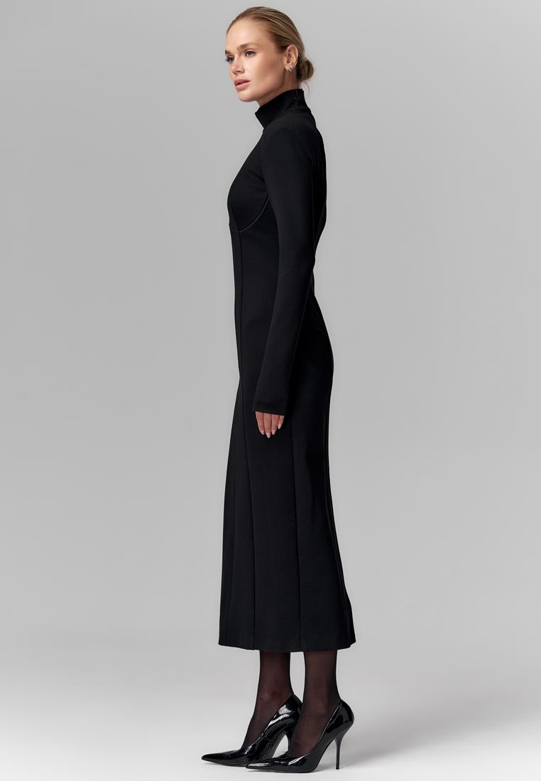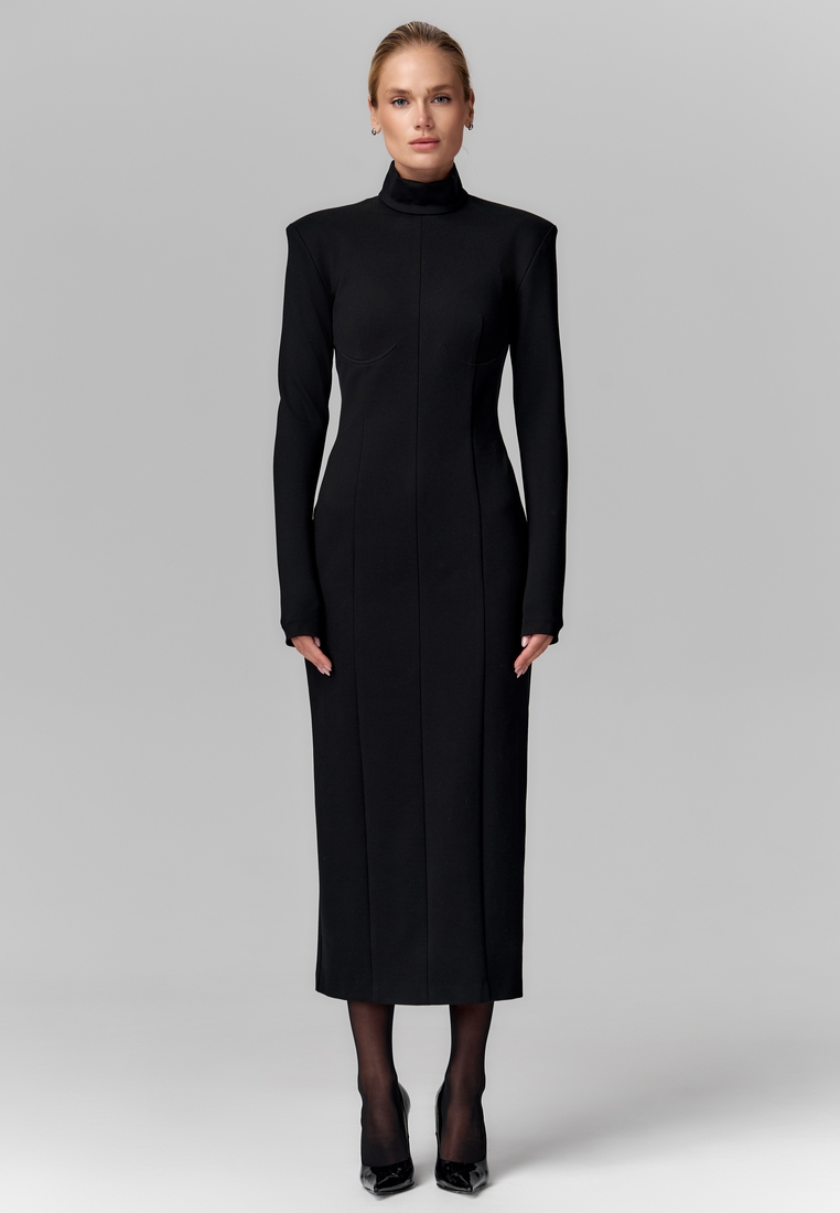 Платье из плотного трикотажа — это минимализм в стиле «второй кожи». Оно облегает фигуру, подчёркивая силуэт, при этом оставаясь удобным и тёплым благодаря комфортному и эластичному материалу. Высокий воротник-стойка добавляет элегантности, а длинные рукава и длина миди делают образ лаконичным и одновременно сдержанно утончённым. Такое платье отлично подойдёт и для офисных дней, и для вечерних выходов — просто добавьте яркие аксессуары!