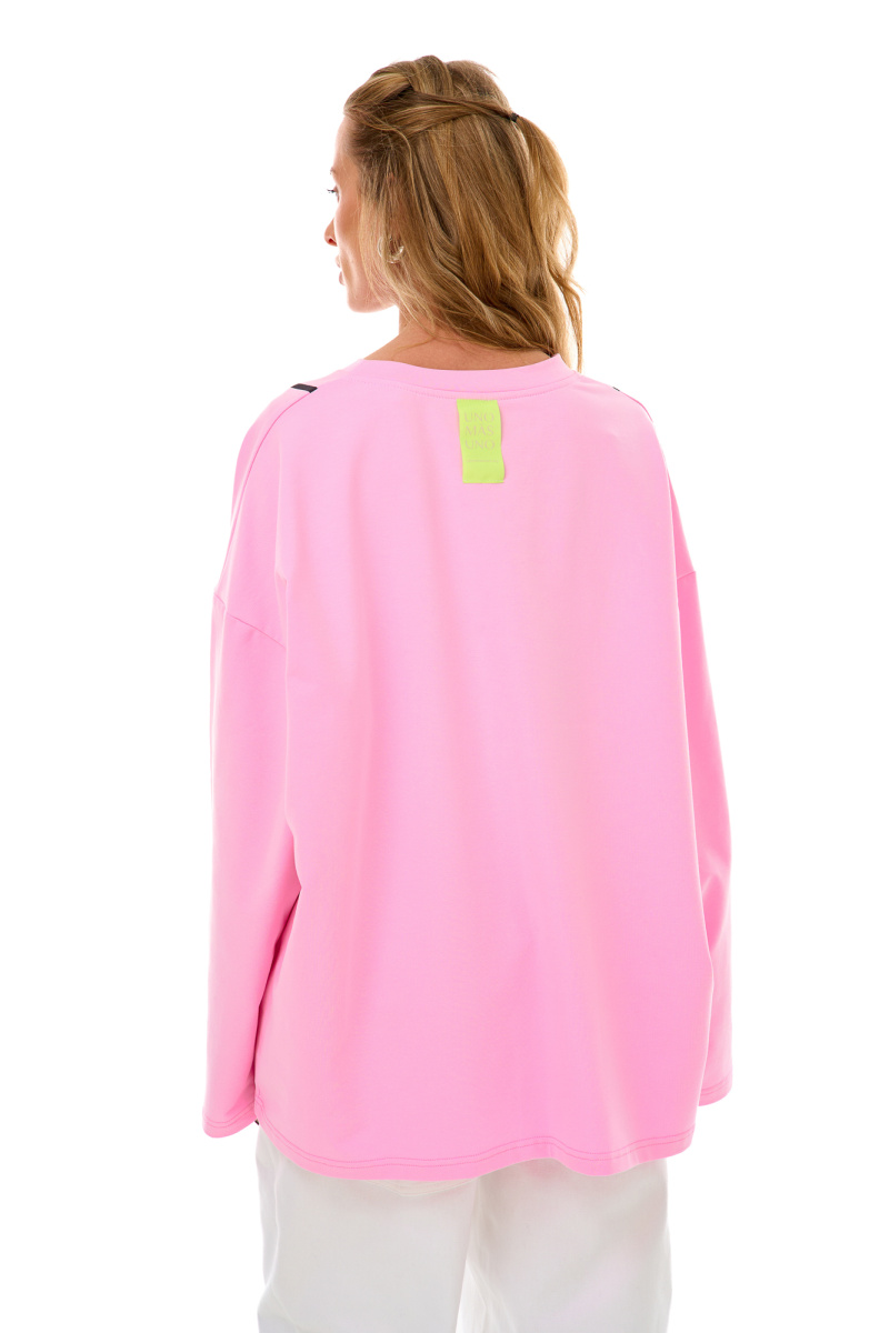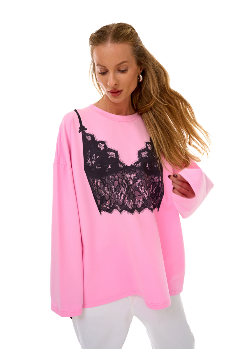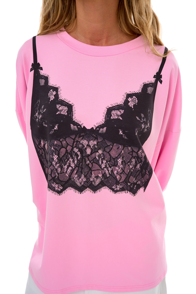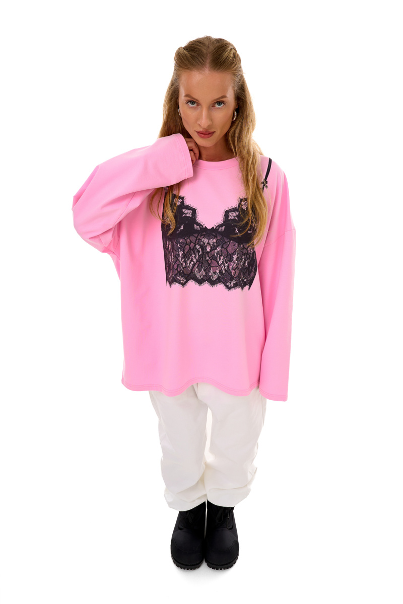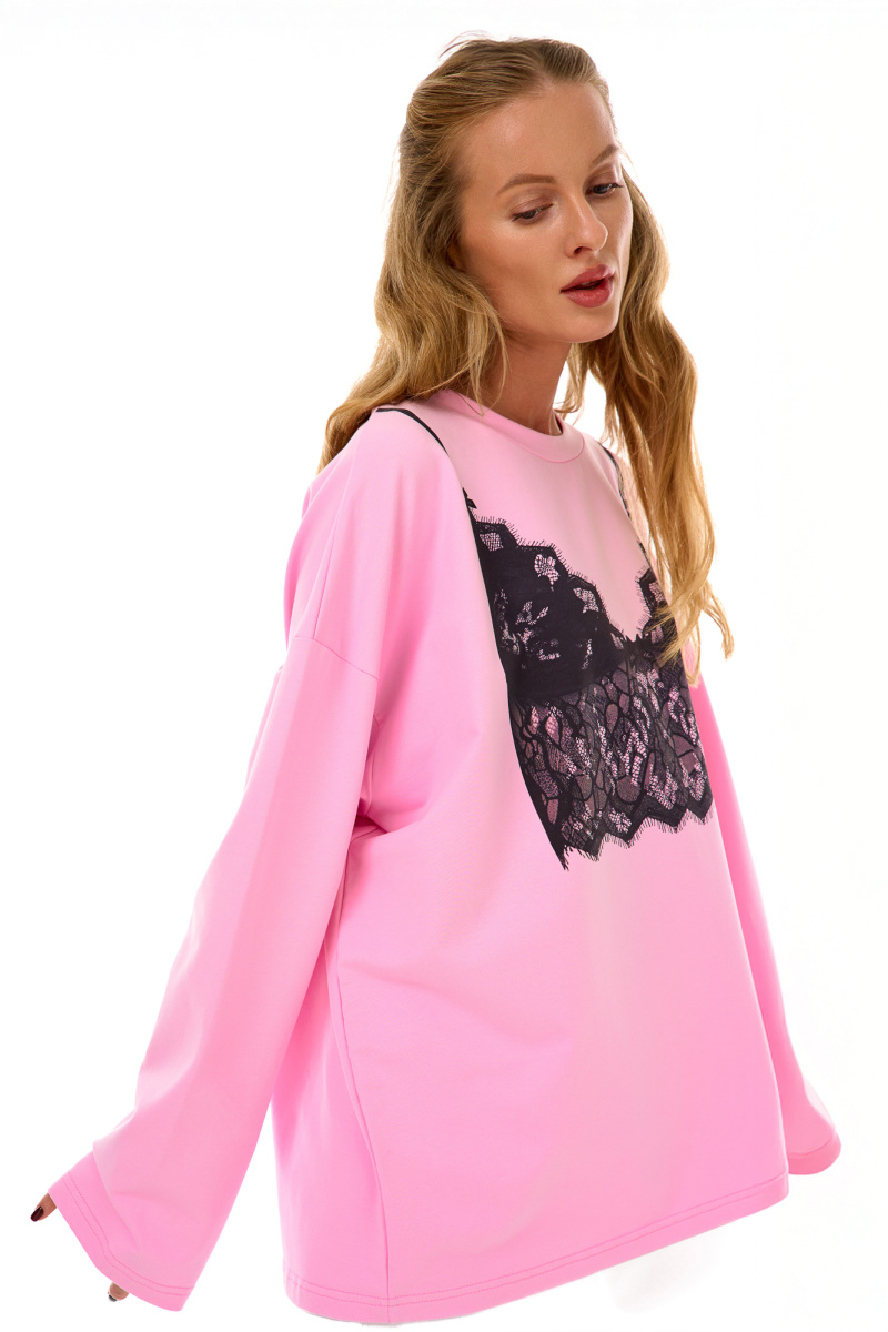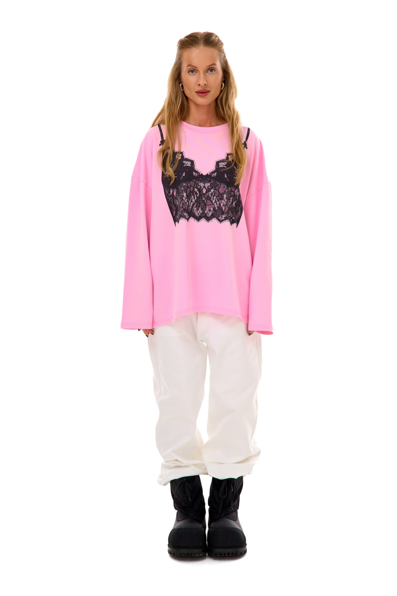 Лонгслив в нежно-розовом оттенке с принтом кружевного топа, где на бантиках написано UNO.