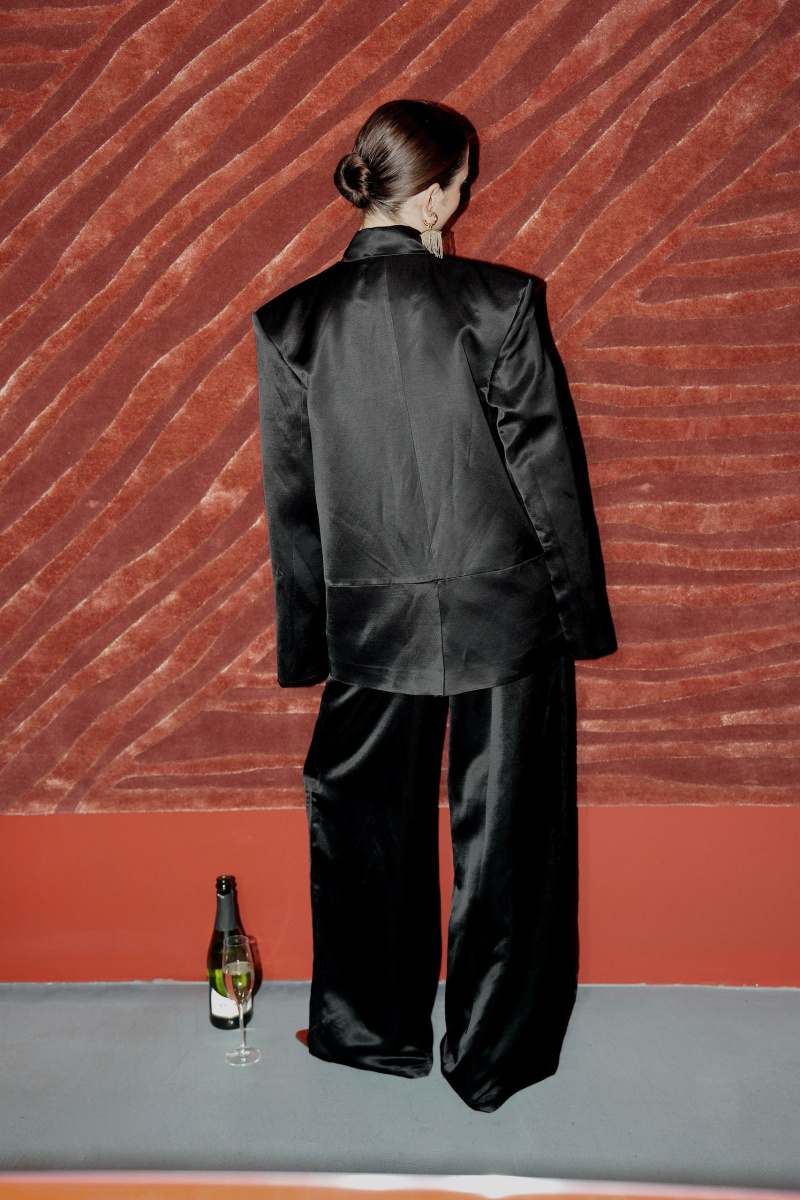 Строгость здесь не ушла, а приобрела актуальную форму в виде элегантного жакета-кейпа, а легкий блеск ткани говорит о вашем статусе без единого слова. Широкие брюки-палаццо на тонком поясе завершают образ, даря ему ту самую уверенность, с которой вы привыкли покорять любые пространства.