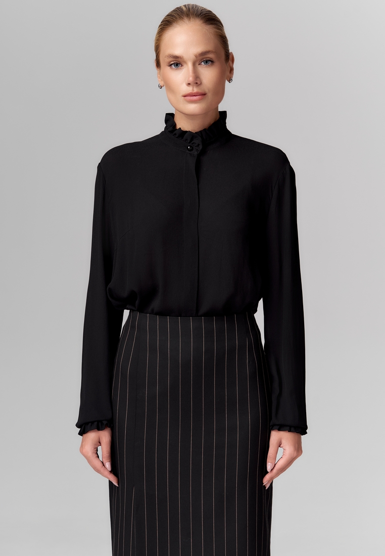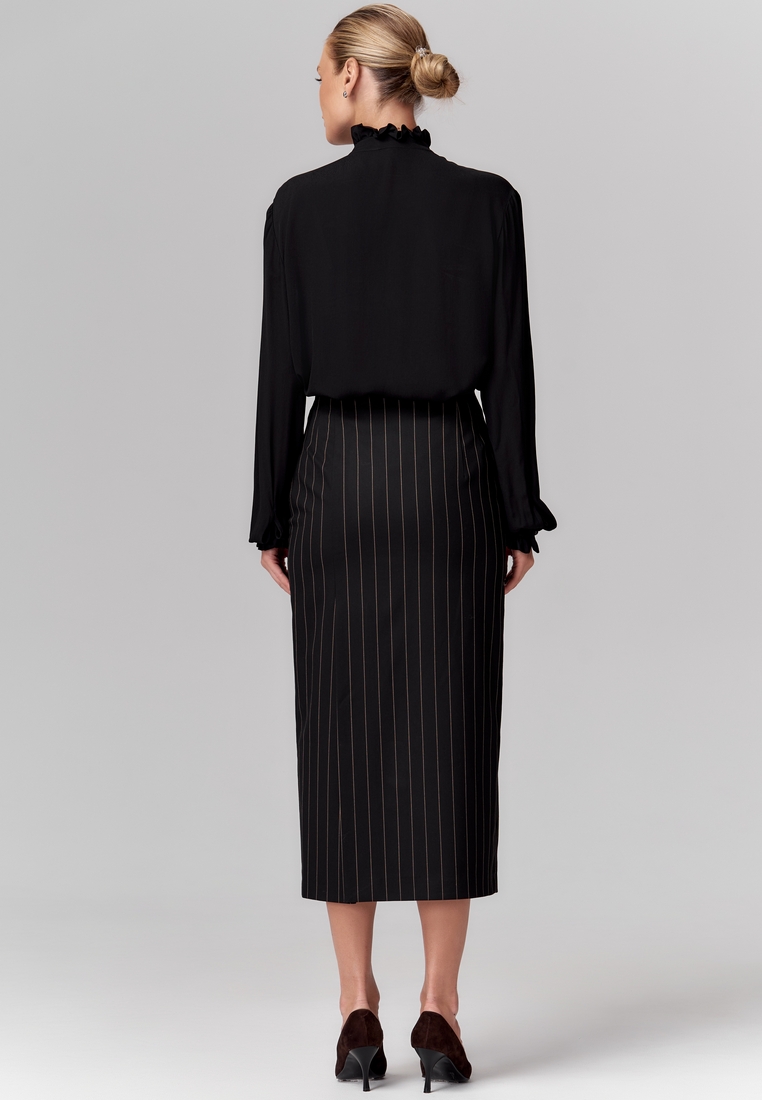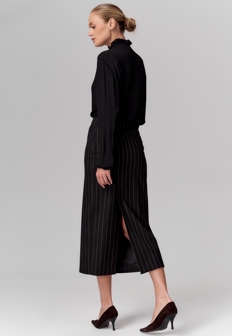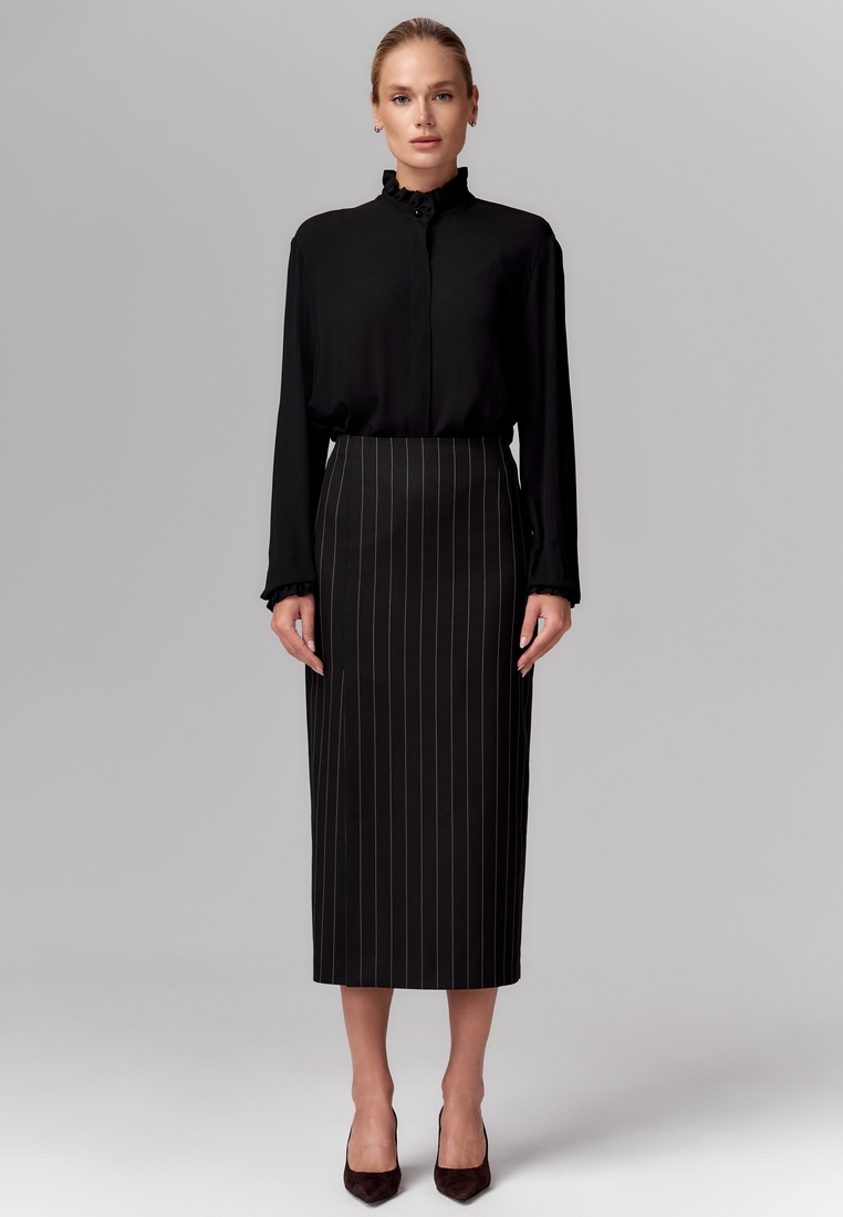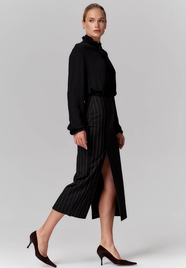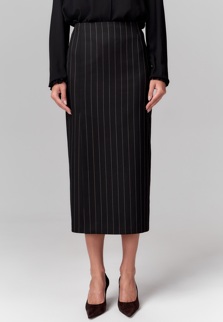 Юбка из поливискозы длины миди, прямая, чёрная с тонкими вертикальными полосками, с высокой талией, со шлицами спереди и сзади для лёгкости и динамики. На подкладке.