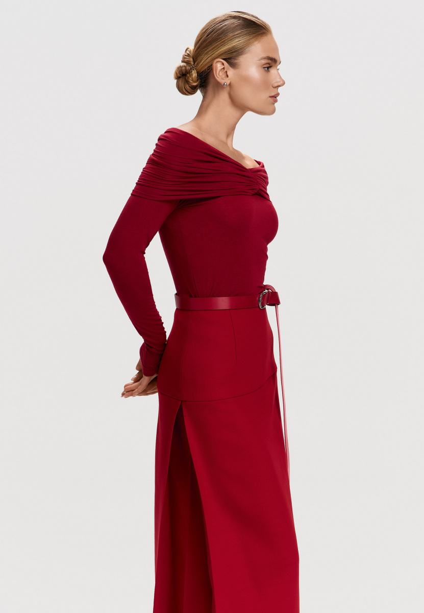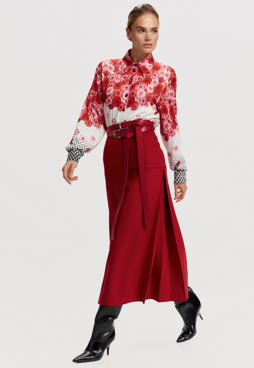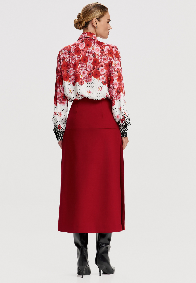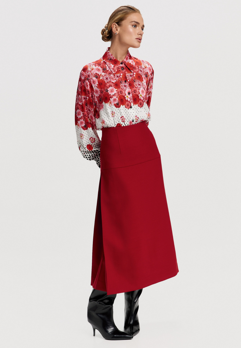 Юбка А-силуэта с двумя встречными складками по бокам добавляет свободу движений и современный акцент. Выполнена из премиального текстильного полотна из шерсти и вискозы цвета. Юбка длиной миди, отрезная по линии бёдер, на подкладке. Потайная молния в боковом шве.