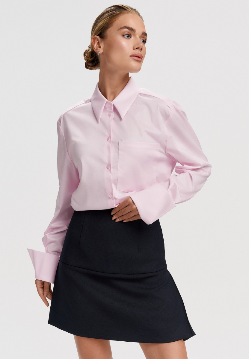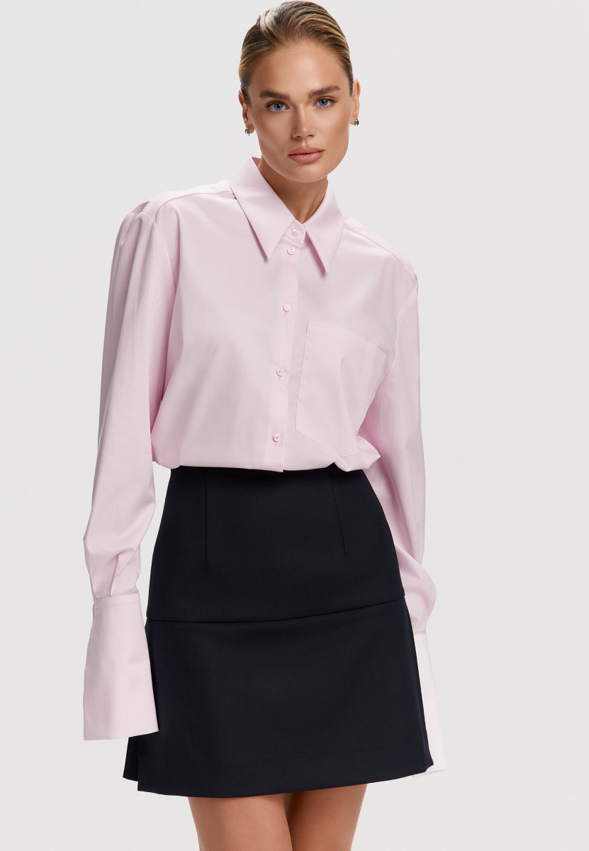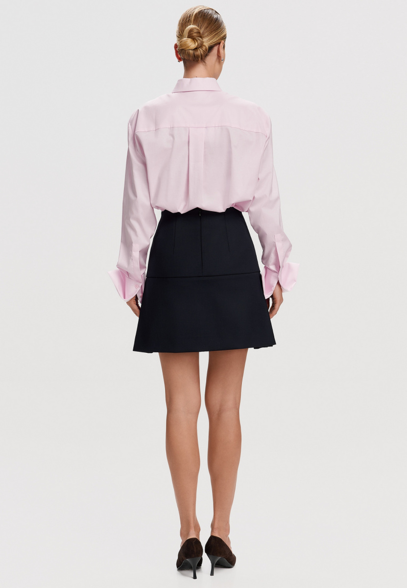 Юбка А-силуэта с двумя встречными складками по бокам добавляет свободу движений и современный акцент. Выполнена из премиального текстильного полотна из шерсти и вискозы цвета Black Navy. Юбка длиной мини, отрезная по линии бёдер, на подкладке. Потайная молния в боковом шве.