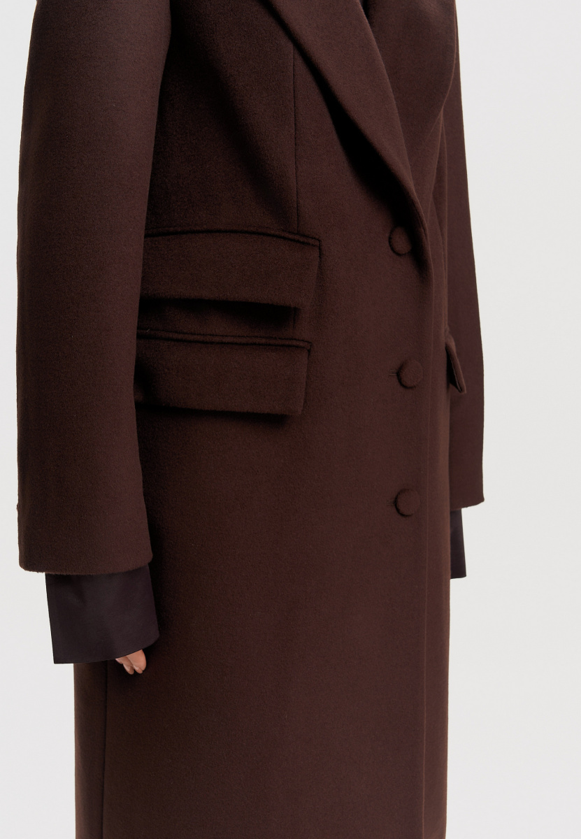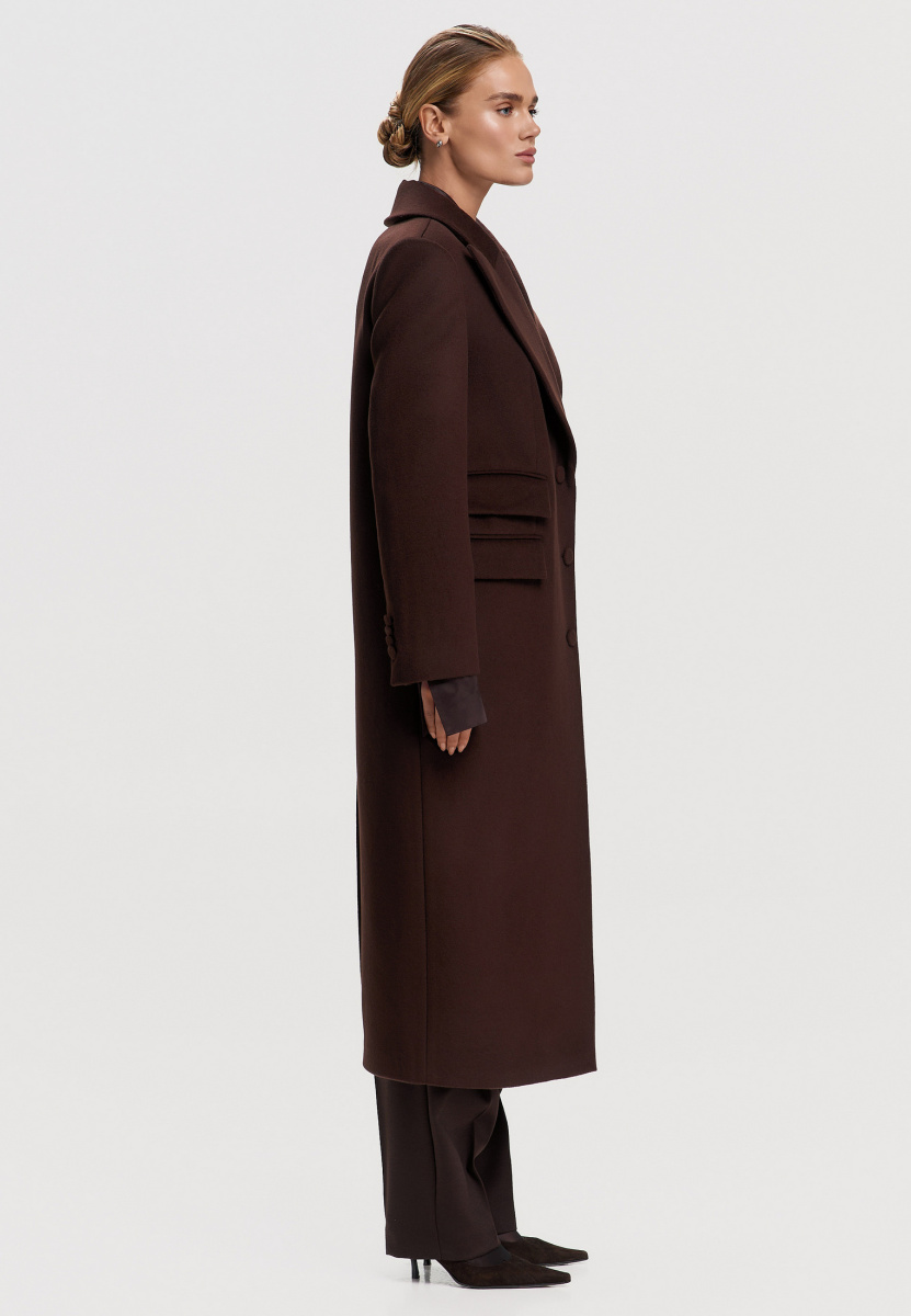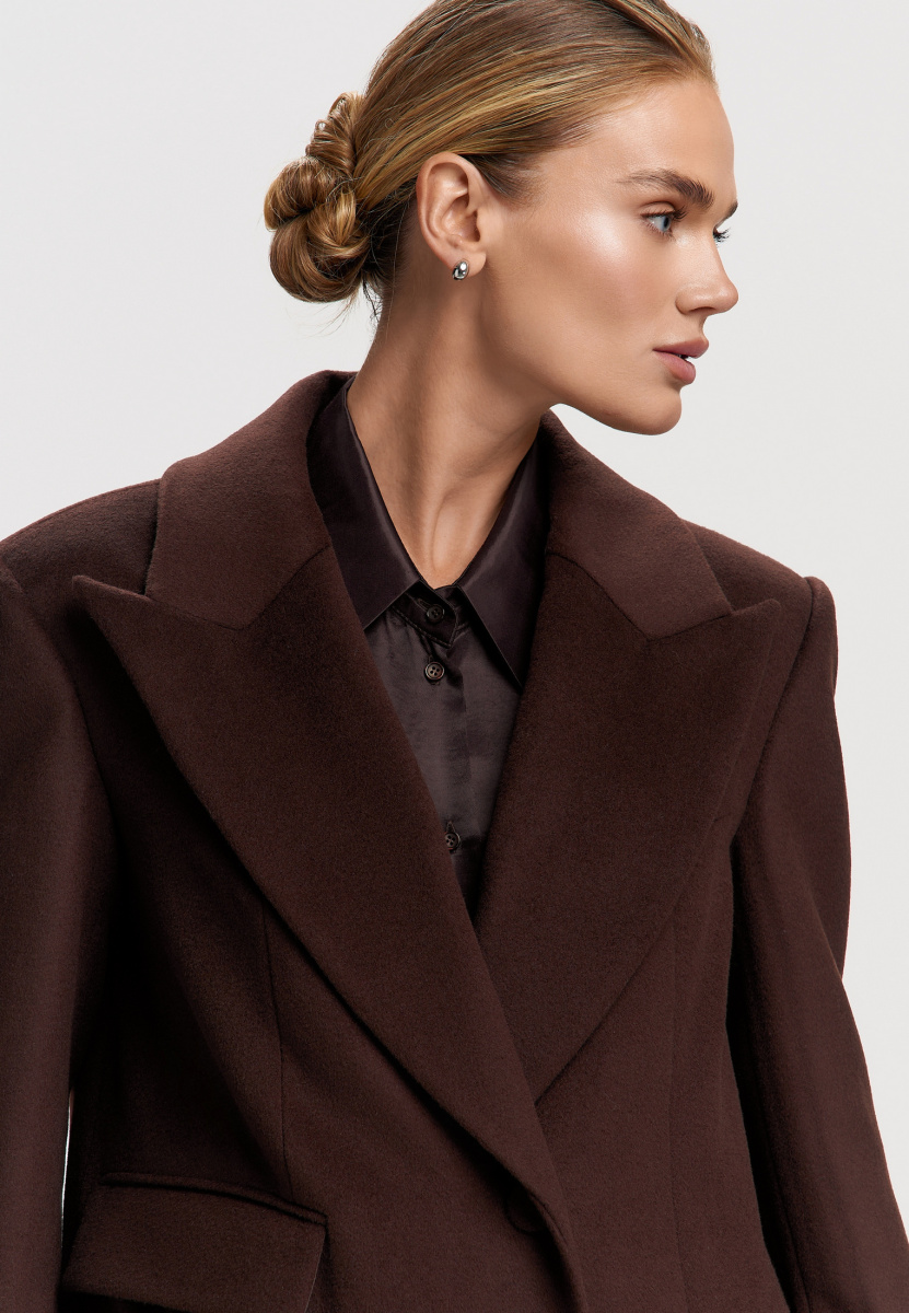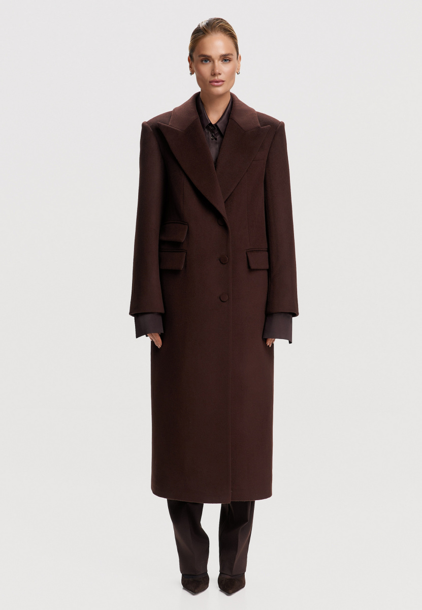 Демисезонное пальто прямого кроя из шерсти. На подкладке, длина — чуть выше щиколотки. Рукава втачные, центральная однобортная застёжка на три пуговицы, с лацканами, — классика, которая выглядит элегантно и удобно.