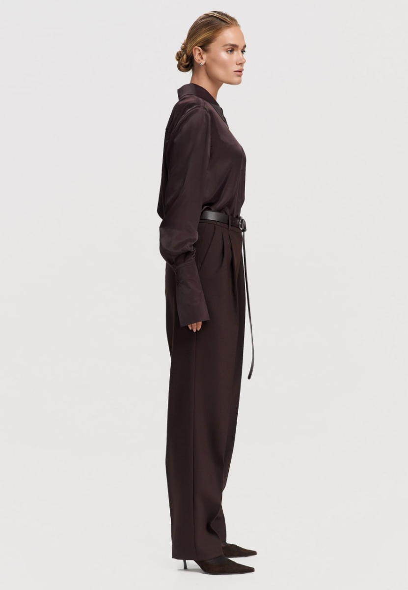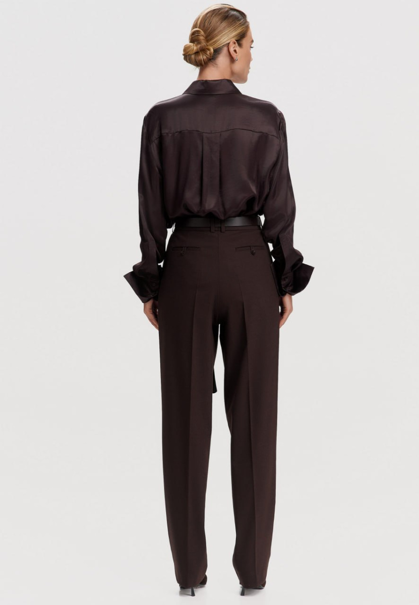 На задних частях брюк листочки с навесной петлей. Заутюжка «стрелки» сходит на нет на уровне высшей точки шагового шва.