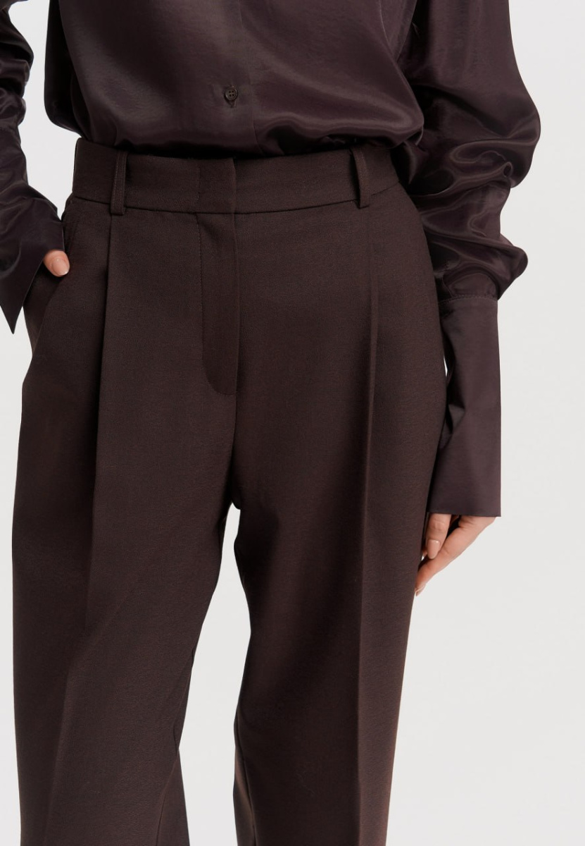По переду брюк два кармана с отрезными бочками, с двумя складками на каждой стороне брюк, с заутюженной линией «стрелки», переходящей в центральную складку.