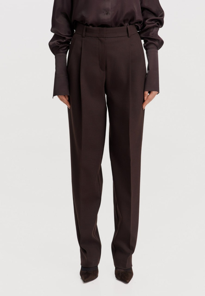 По переду брюк два кармана с отрезными бочками, с двумя складками на каждой стороне брюк, с заутюженной линией «стрелки», переходящей в центральную складку.