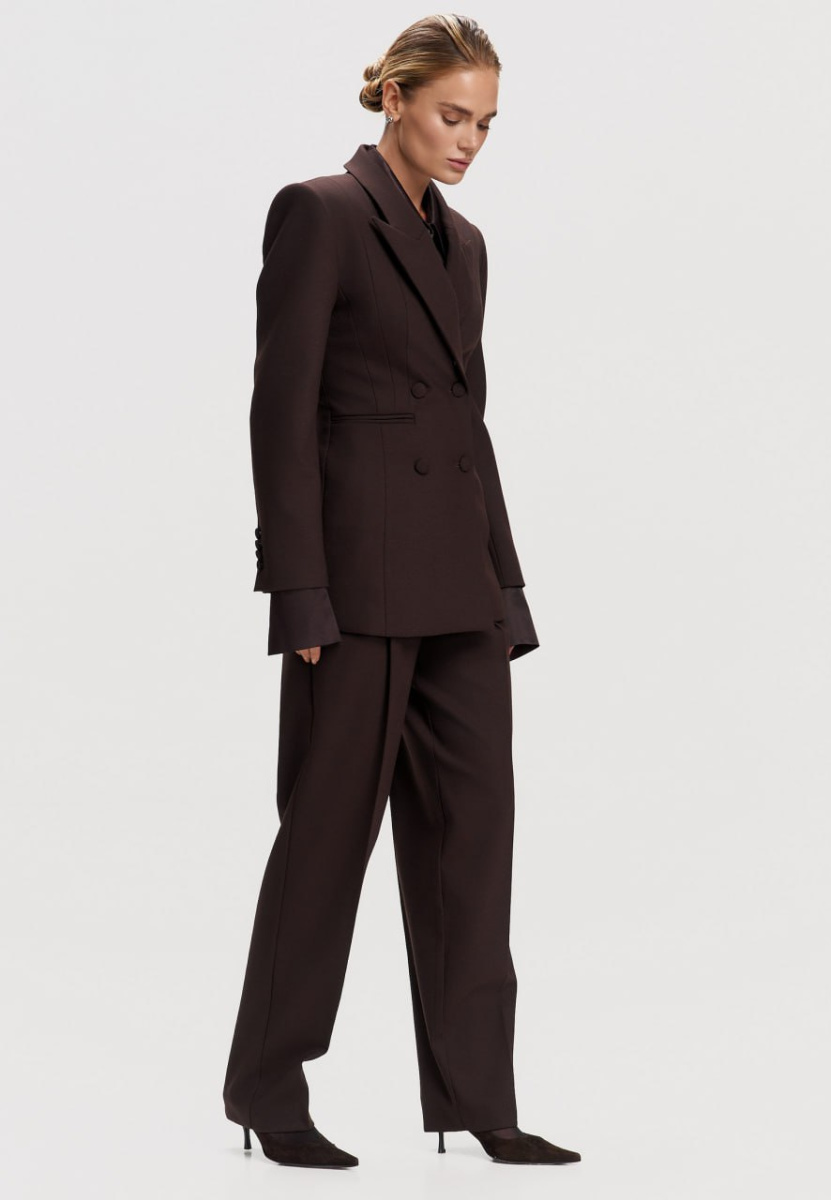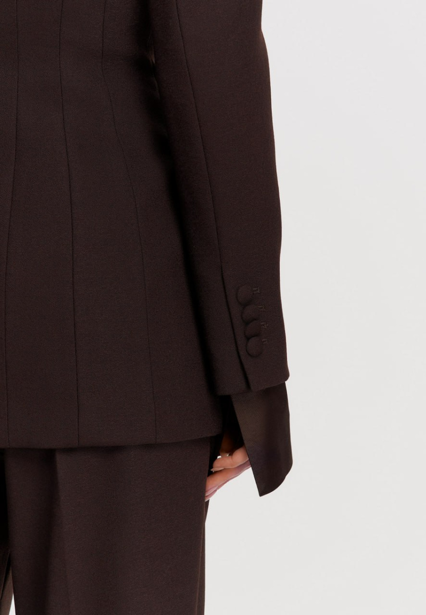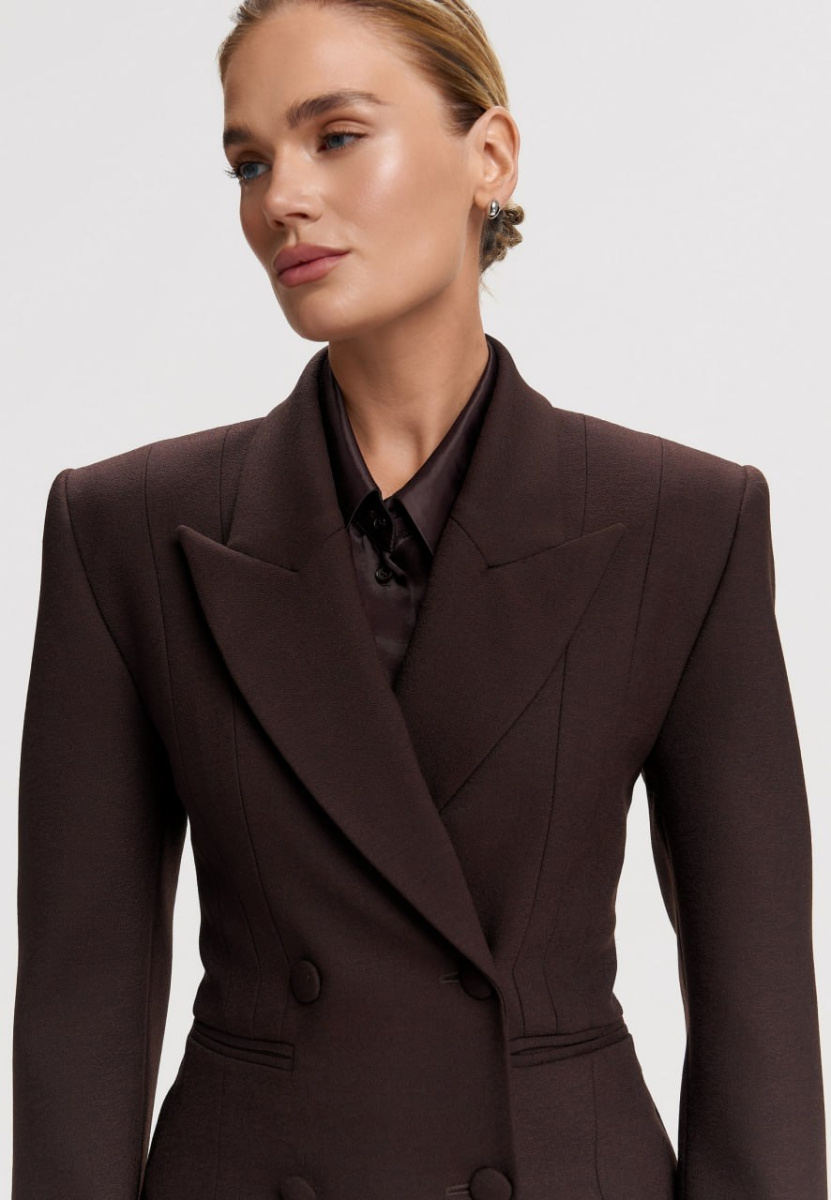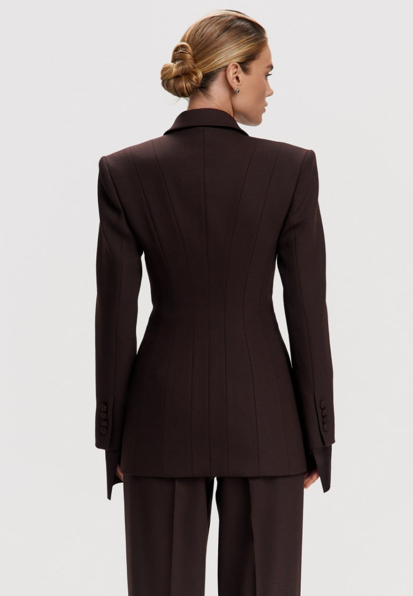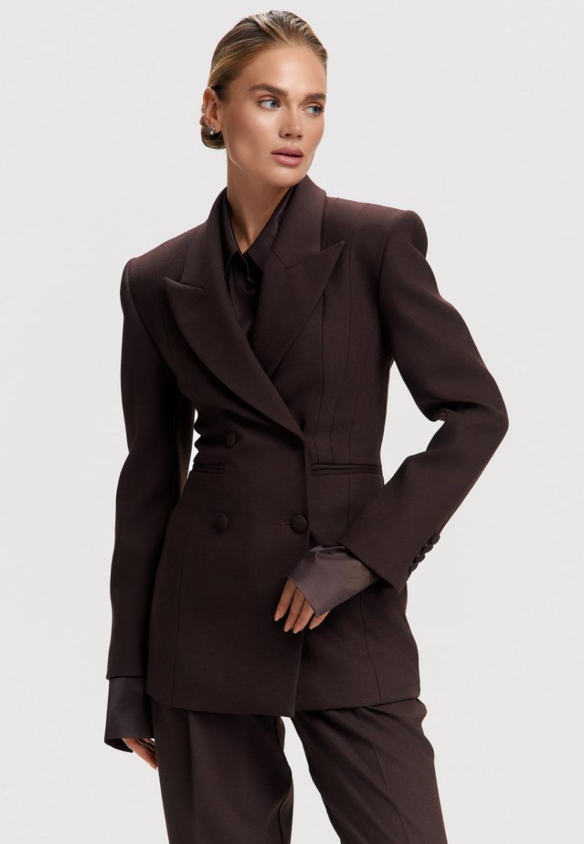 Жакет полушерстяной, на подкладке, шоколадного цвета, прилегающего силуэта длиной до линии бёдер, с втачными рукавами. Двубортная застёжка на две видимые петли с обтянутыми основной тканью пуговицами и одну потайную.