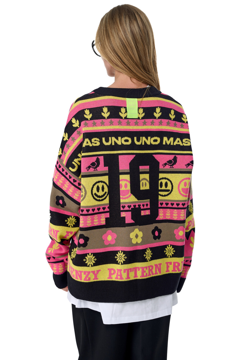 конечно же, в джемпере зашиты "пасхалки" - белорусские символы богатства и зарождающейся любви. Надпись Frenzy Pattern - безумный рисунок и номер 19 на спине (год основания бренда).