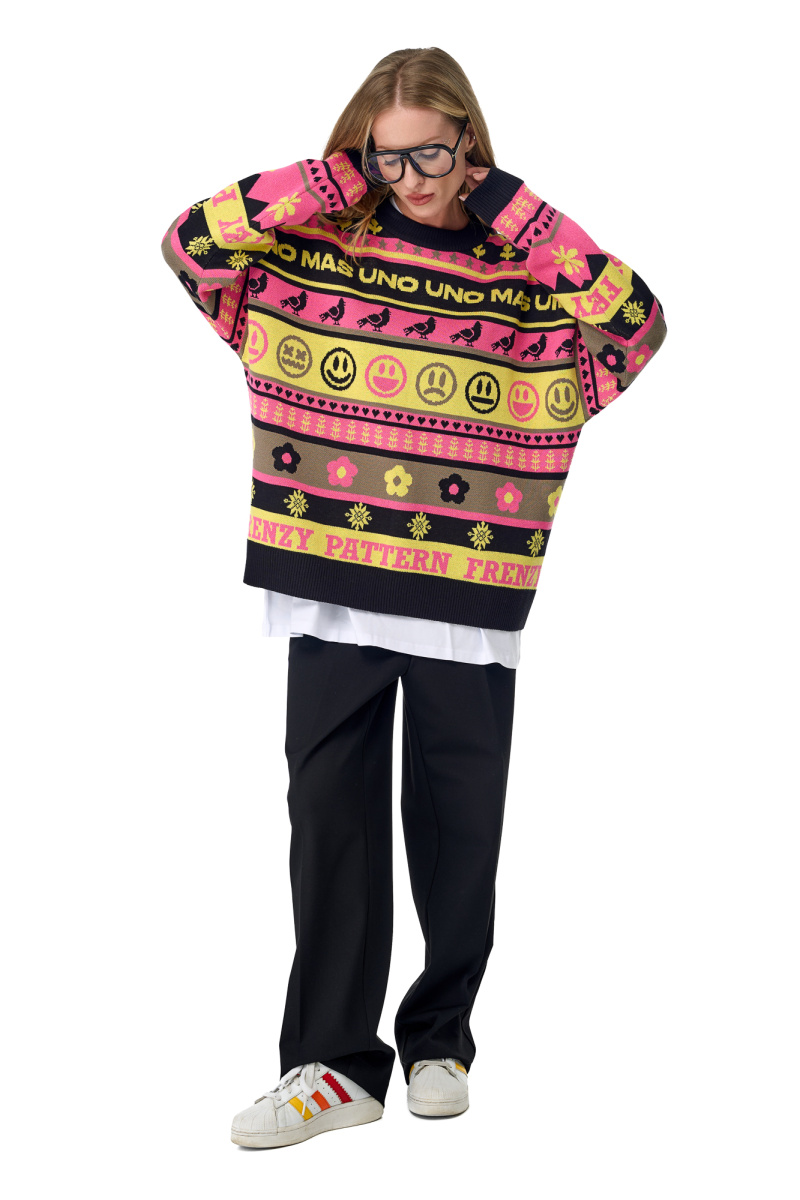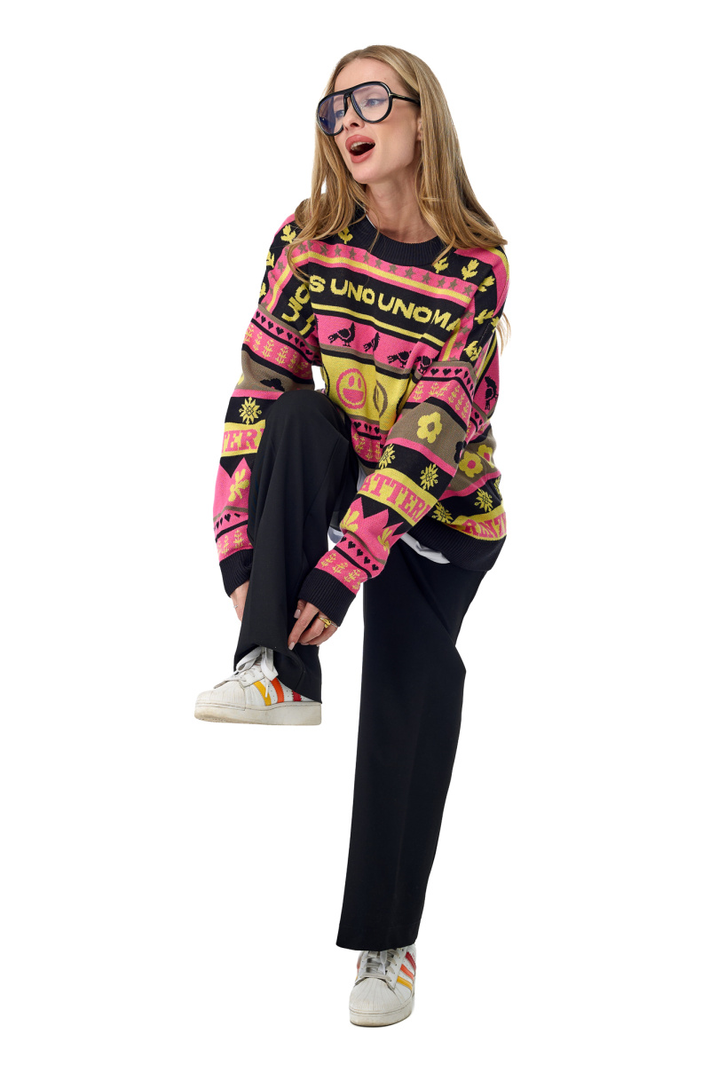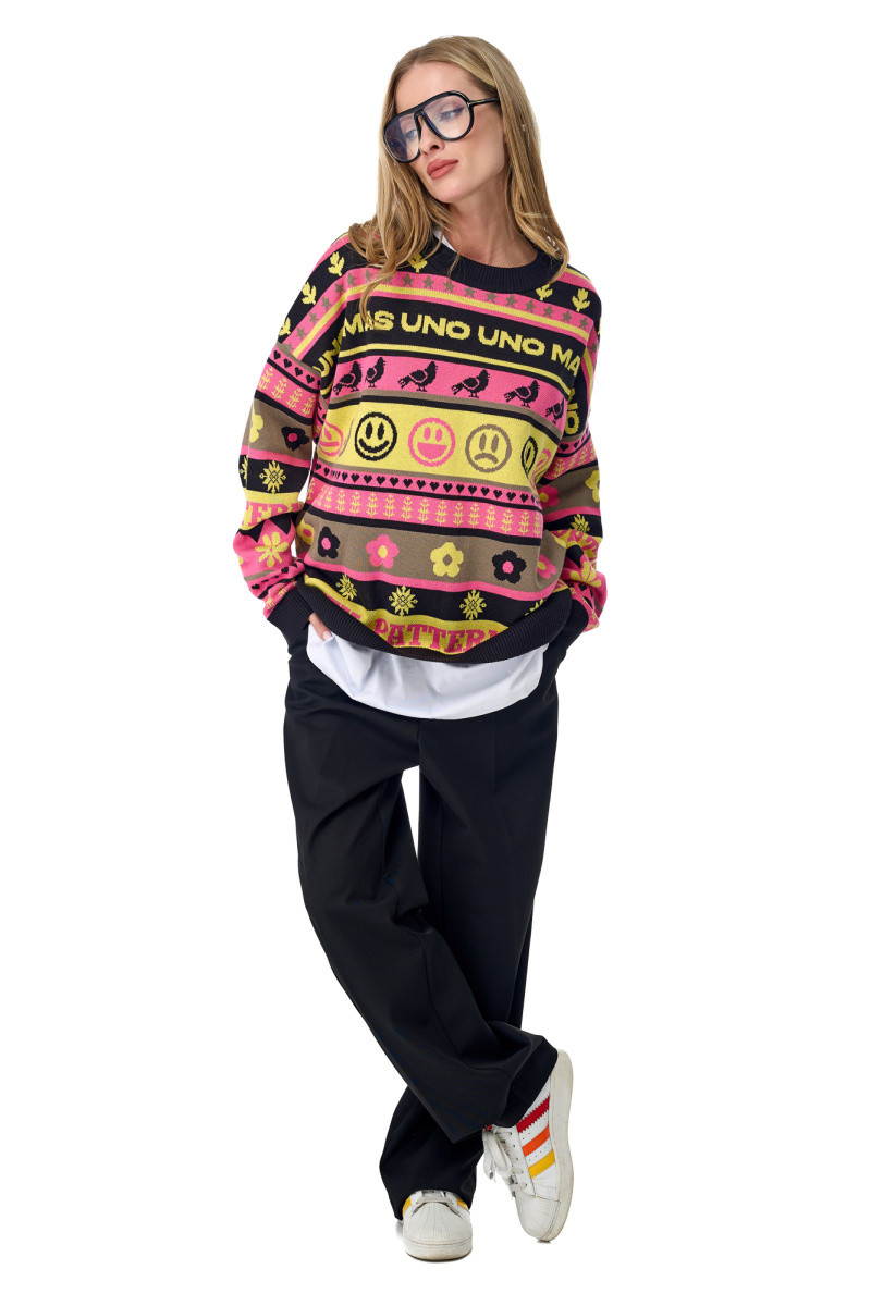 Джемпер подходит для сложных комбинаций, а также для простых луков, ведь он настолько яркий и цепляющий взгляд, что можно не придумывать дополнения.