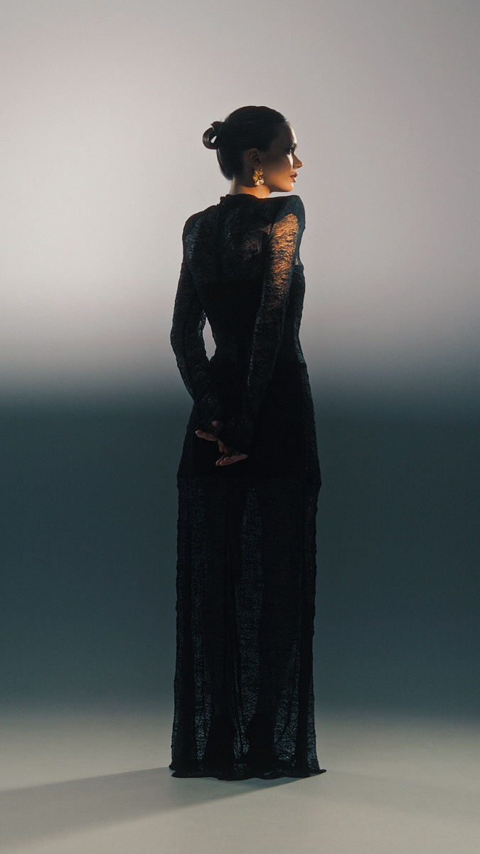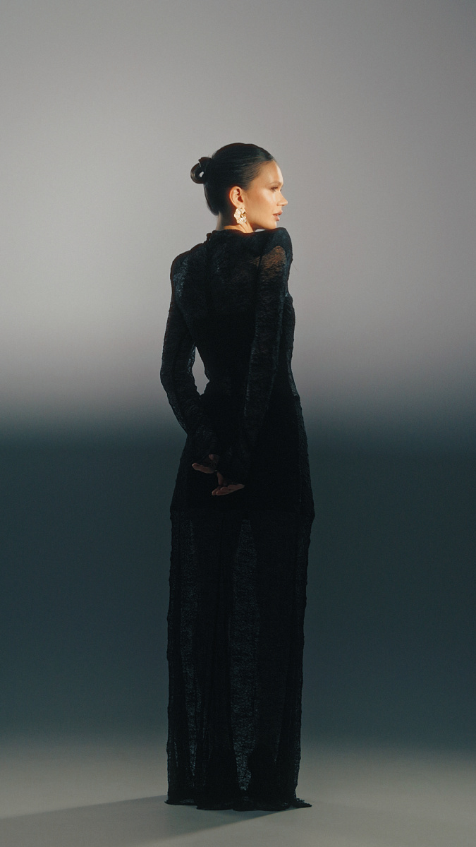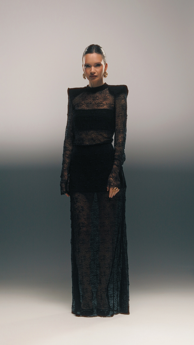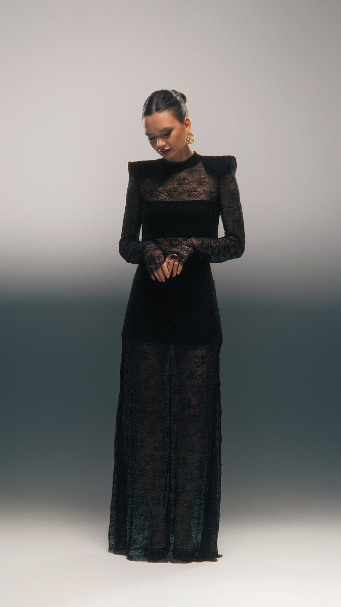 Длинное вечернее платье из черного кружева. Силуэт с акцентом на плечах выглядит женственно, но при этом властно. Идеально для новогоднего выхода. DARK HORSE не стремится быть ярче всех, но навсегда останется в памяти.