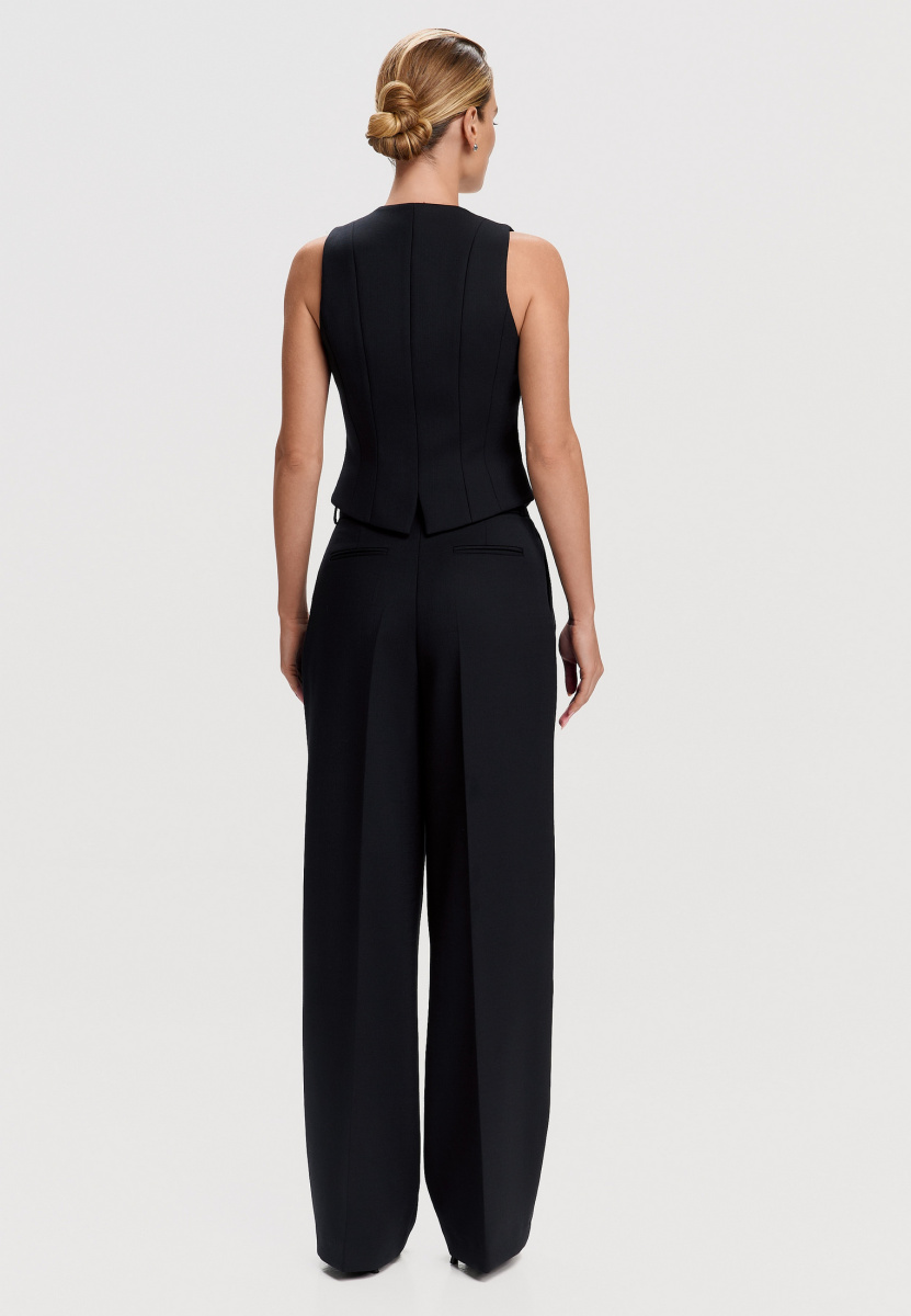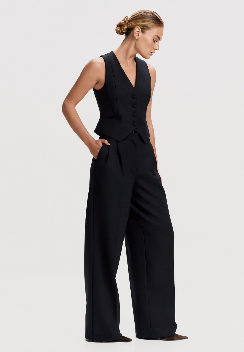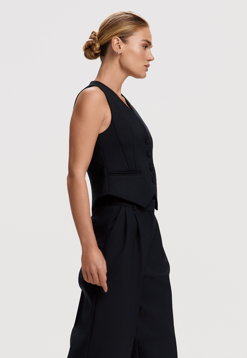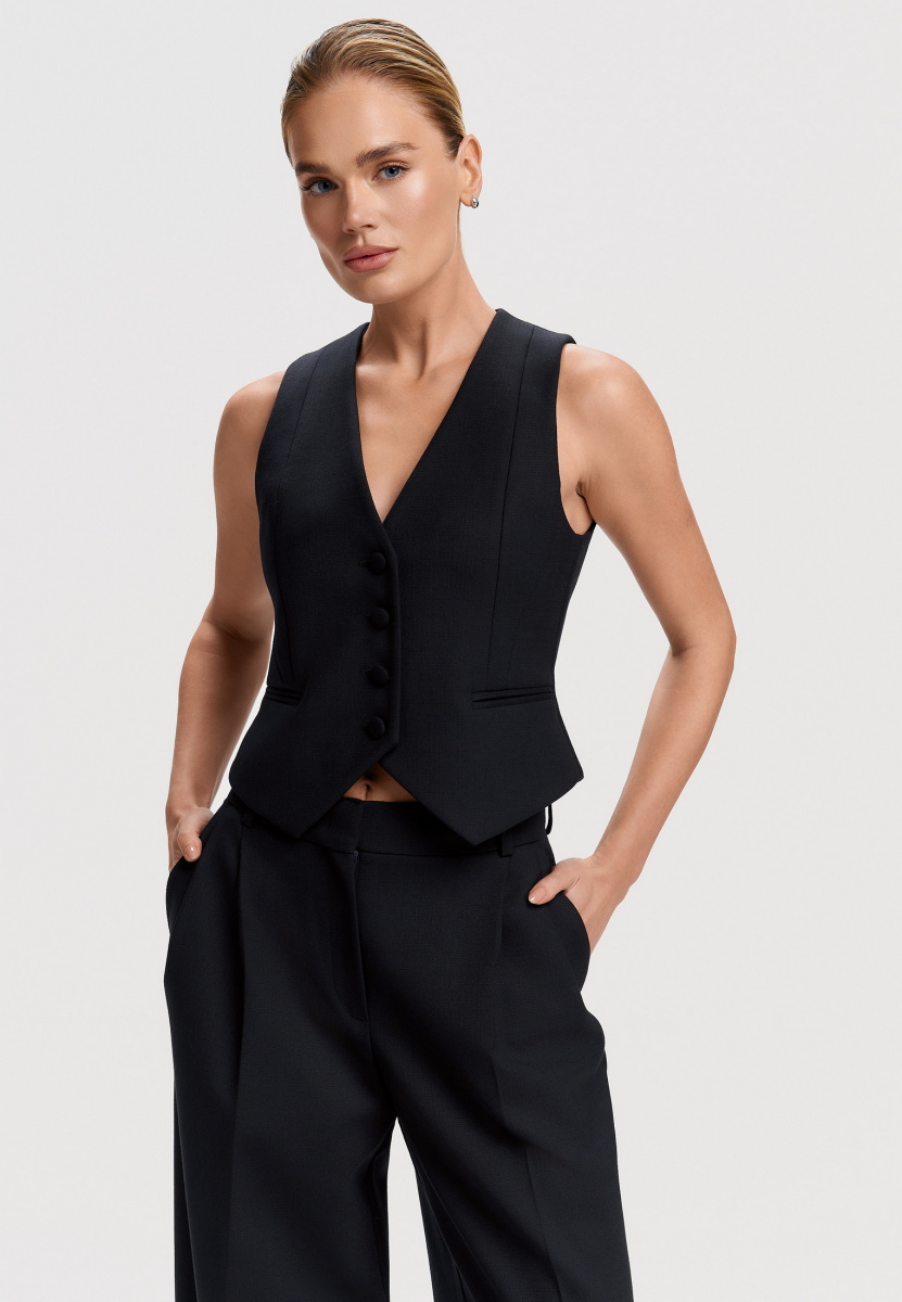 Жилет на подкладке с V-образным вырезом, со сквозной центральной застёжкой. Жилет прилегающего силуэта, с фигурным низом, длиной ниже линии талии