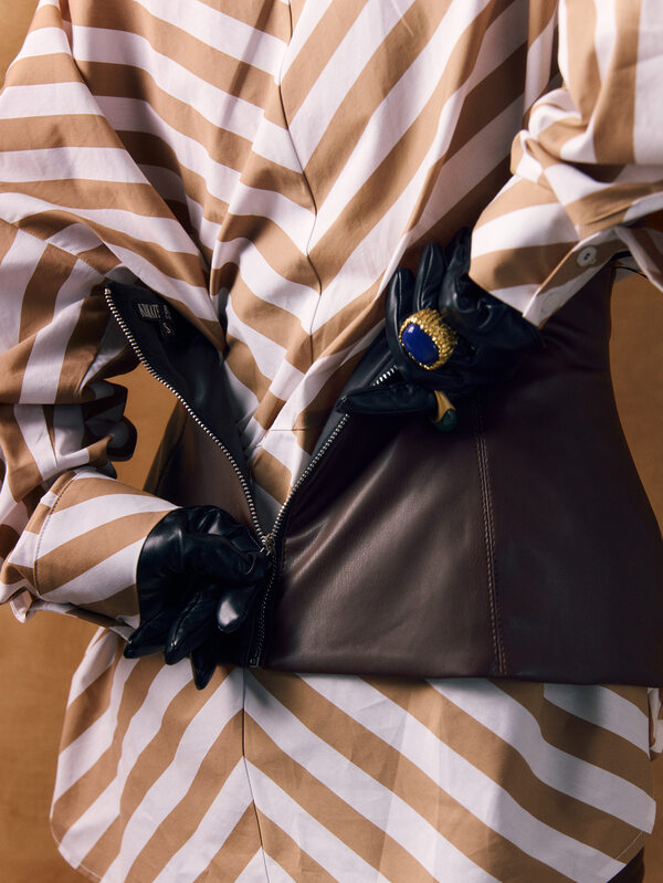 Пояс-корсаж из эко-кожи эффектно структурирует силуэт, добавляя ему визуальную завершенность. Застежка на молнию.
