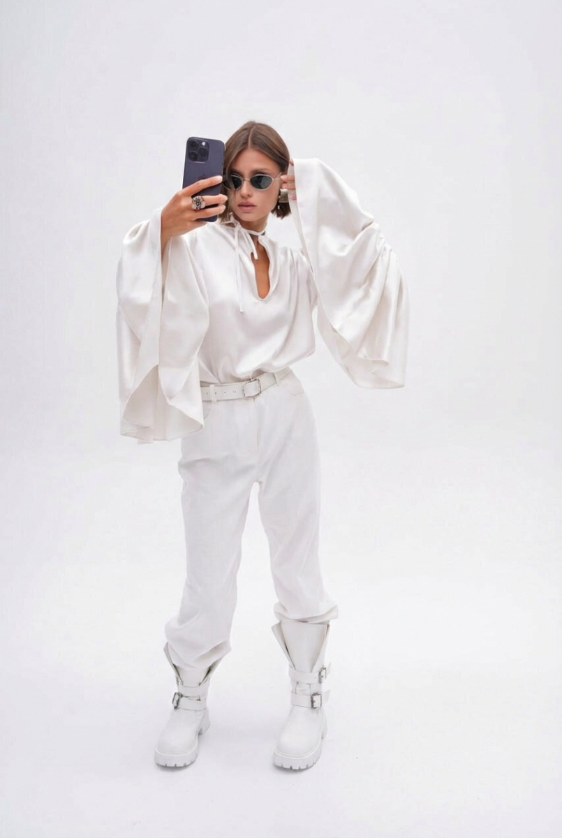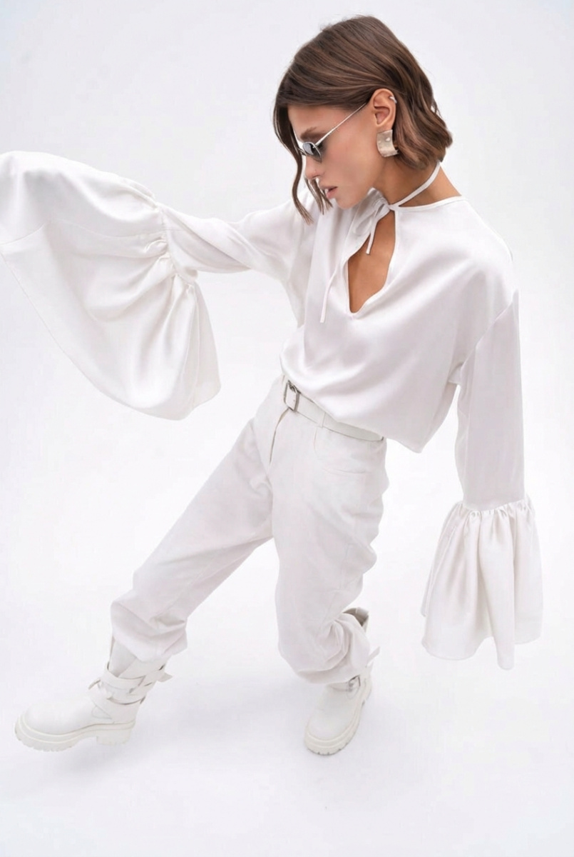 Скользящая обволакивающая блуза из вискозного тонкого атласа. Прямой крой и свободная посадка. В комплекте пояс-шарф