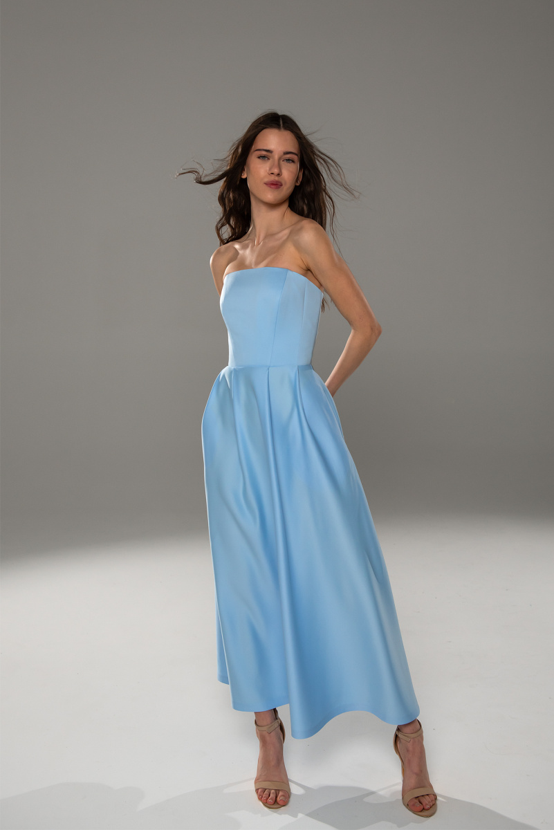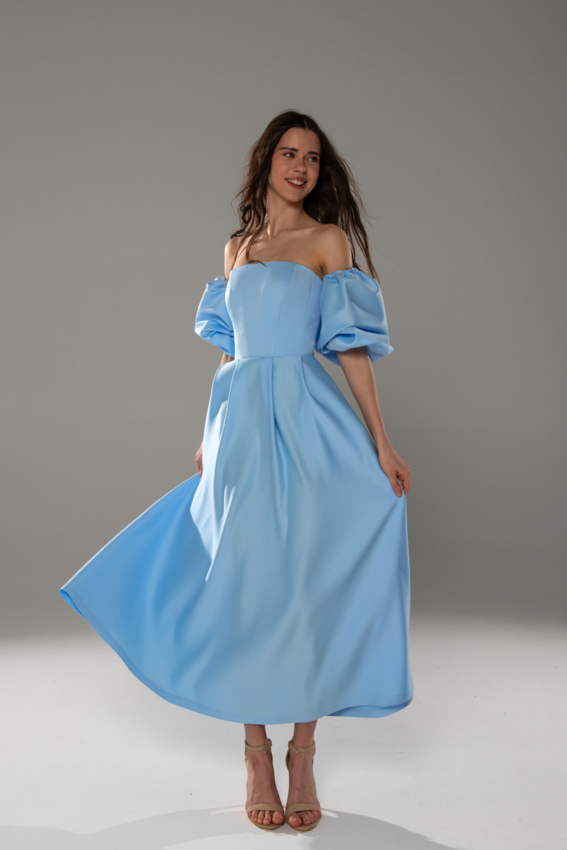 Элегантное макси‑платье из плотного атласа нежно‑голубого, черного и бежевого цвета. Приталенный корсет с открытыми плечами и дополнительными объемными рукавами‑фонариками, расклешенная юбка с плавной драпировкой создают роскошный образ. Стильный фасон для выпускного, свадьбы или вечернего выхода.