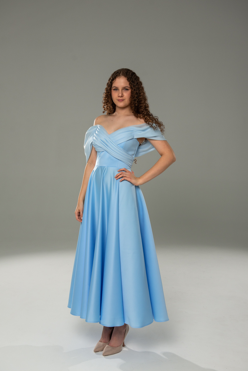 Элегантное макси‑платье из плотного атласа нежно‑голубого, черного и бежевого цвета. Приталенный корсет с открытыми плечами и дополнительными объемными рукавами‑фонариками, расклешенная юбка с плавной драпировкой создают роскошный образ. Стильный фасон для выпускного, свадьбы или вечернего выхода.