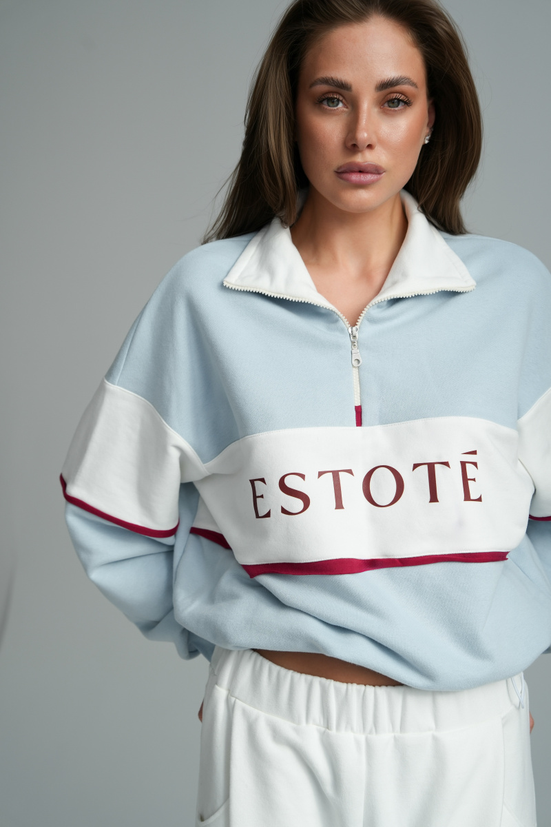 Свитшот из мягкого трикотажного полотна, свободного силуэта, рукава на монжетах, низ оформлен кулиской, воротник стойка на молнии. Выполнен из ткани двух цветов, по центру нанесена печать, подрезы оформлены декоративным кантом. Представлен в едином размере, в свободной и комфортной посадке. Хорошо комбинируется в разных стилевых сочетаниях.