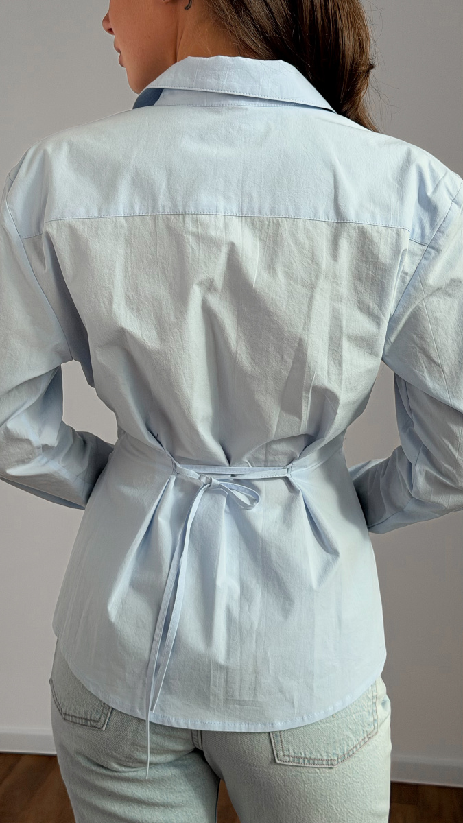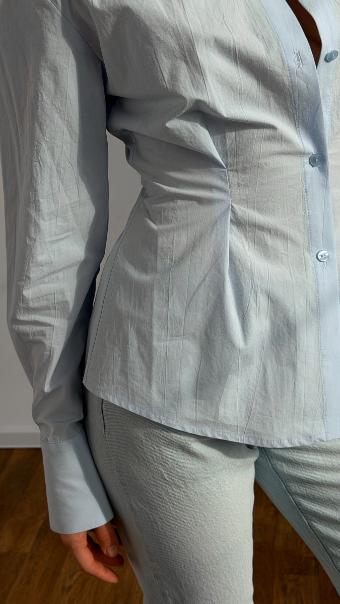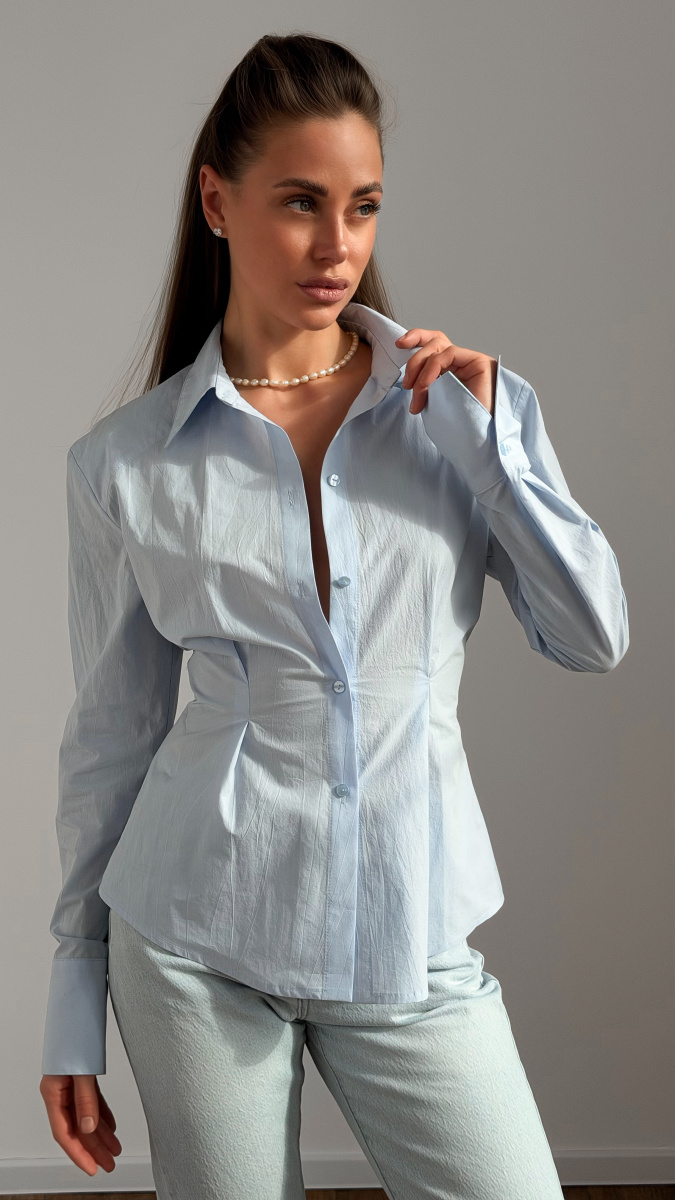 Универсальная рубашка, которая отлично вписывается в повседневный деловой, а также нарядный стиль. Создает идеальный силуэт с расширенными плечами и узкой талией. Плечо расширенное с подплечником, спереди на талии складки, которые создают приталенный силуэт, приталенность регулируется сзади шнуром.