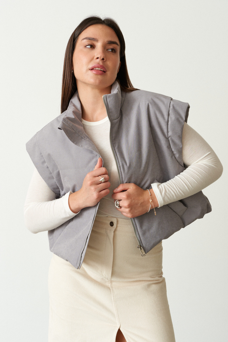 Размер жилетки единый. Параметры модели: рост 174 см, обхват груди 87 см, обхват талии 71 см, обхват бедер 101 см.