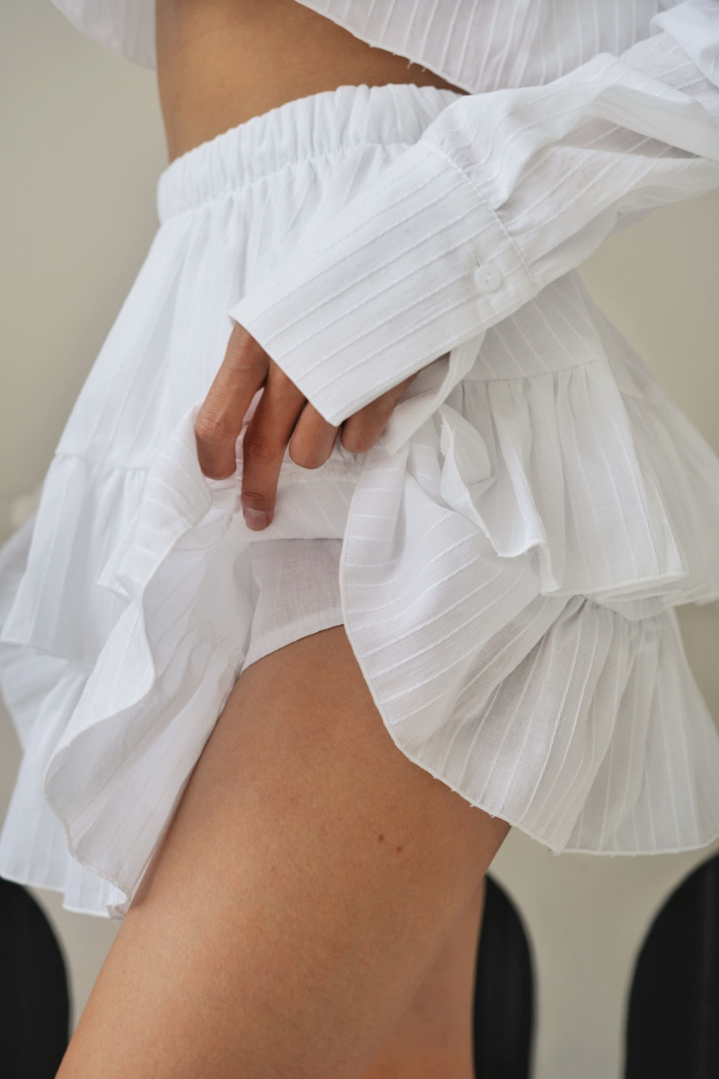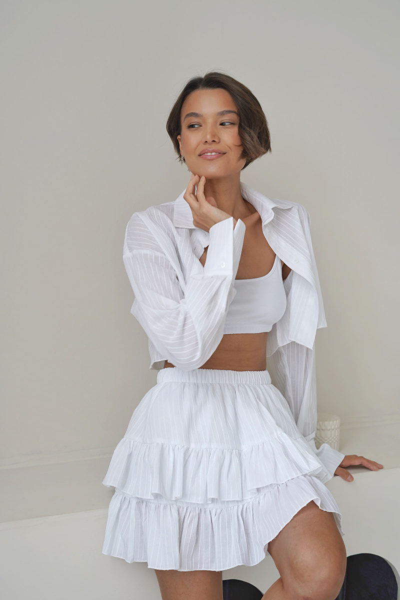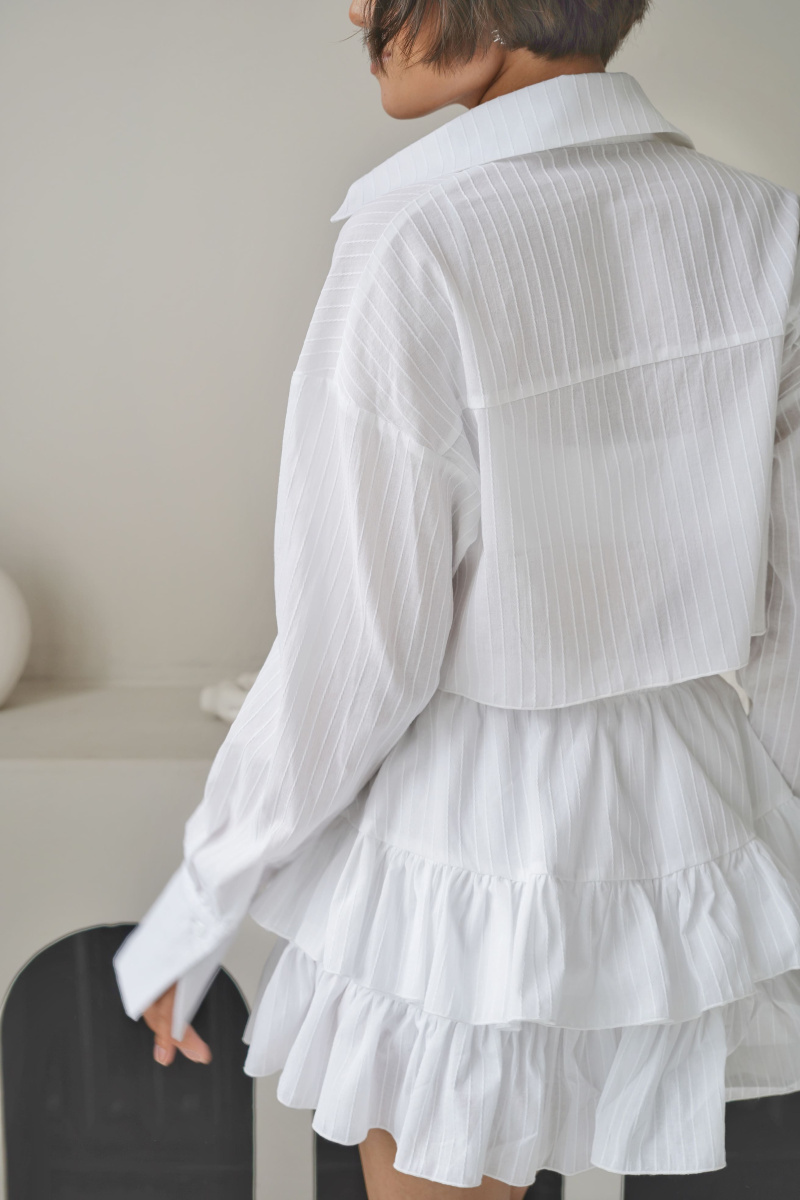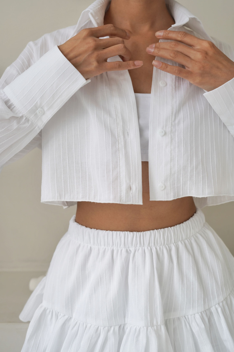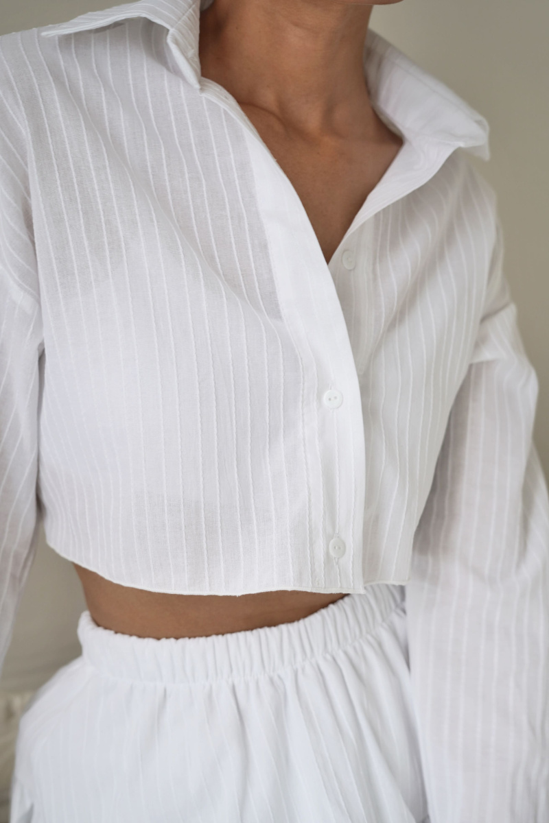 Укороченная рубашка из хлопка, с воротником-стойкой, широкими манжетами, со спущенной линией плеча, выполнена из фактурной ткани в полоску.