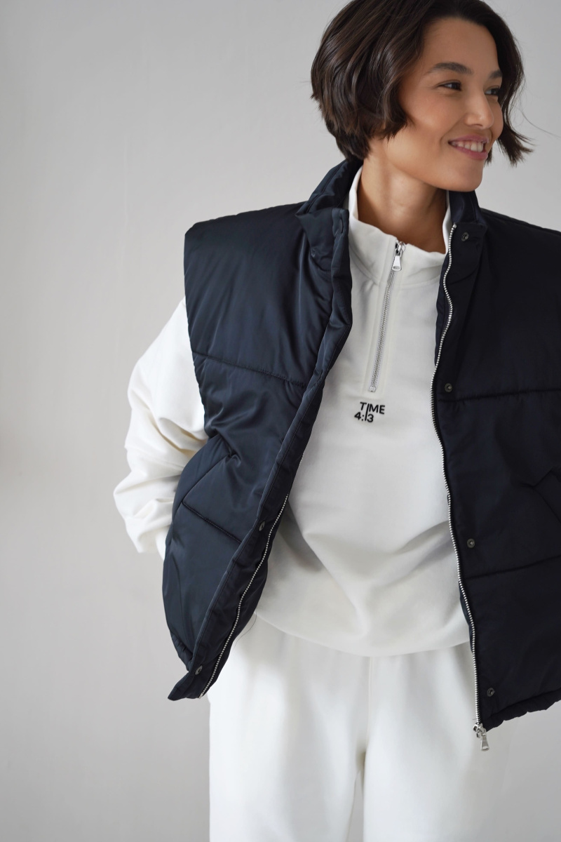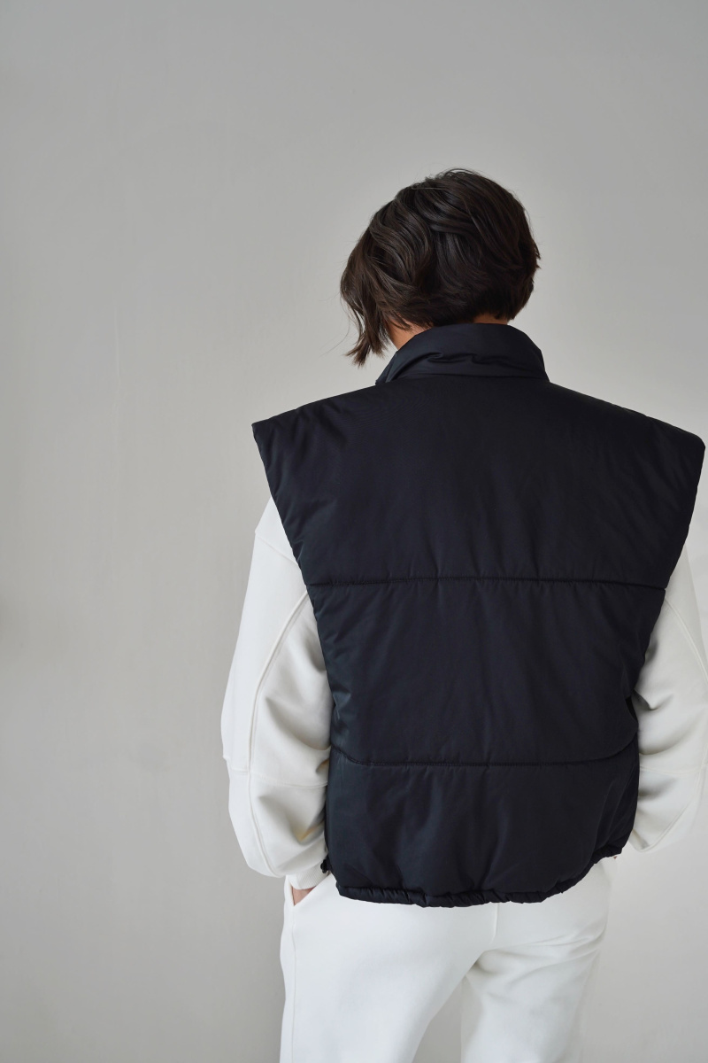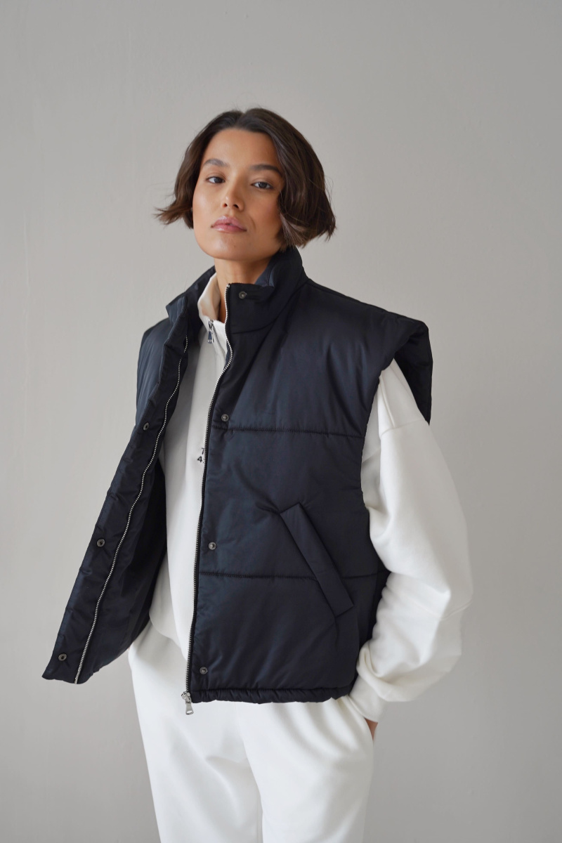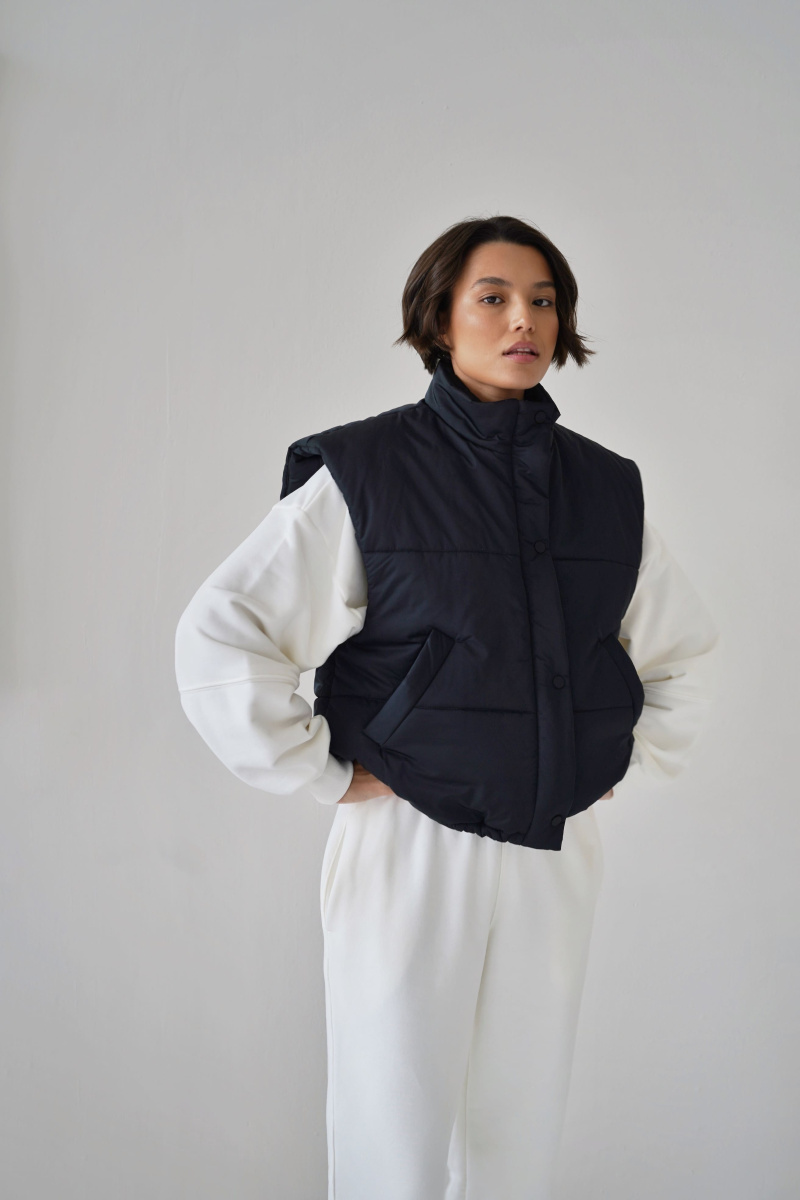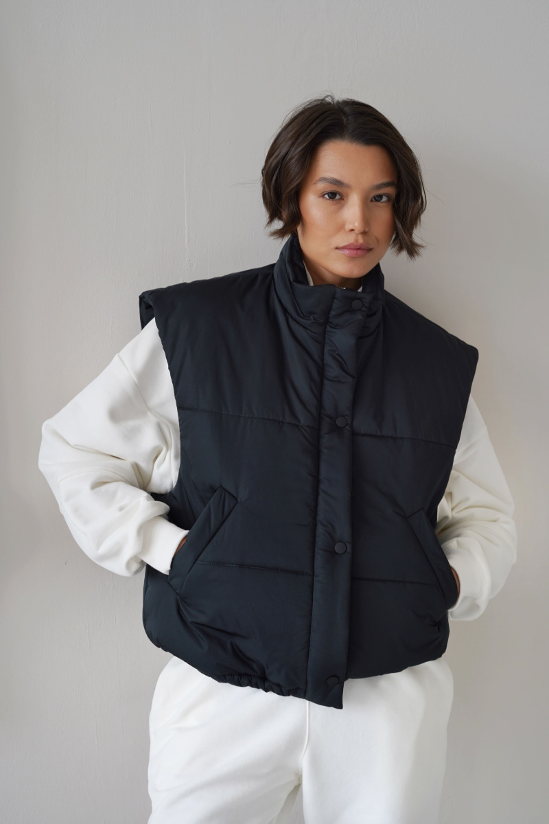 Жилетка выполнена из водоотталкивающей ткани на молнии, а также с не продуваемой планкой на кнопках, по низу затягивается кулисками, наполнитель: каландрированный синтепон 200г/м.