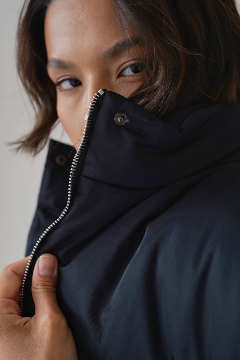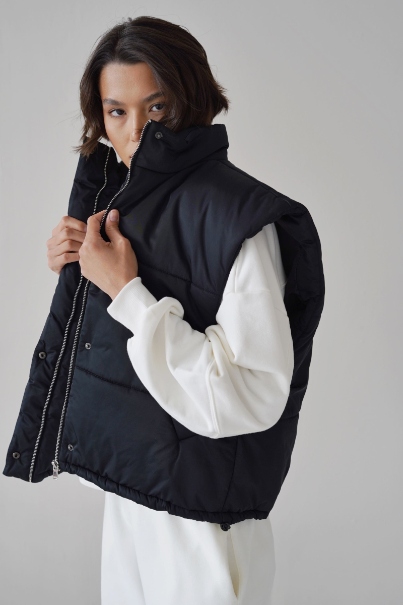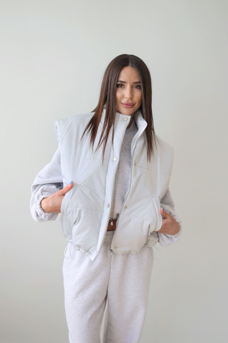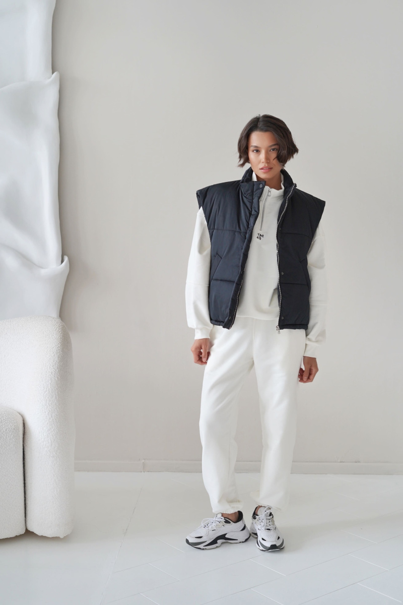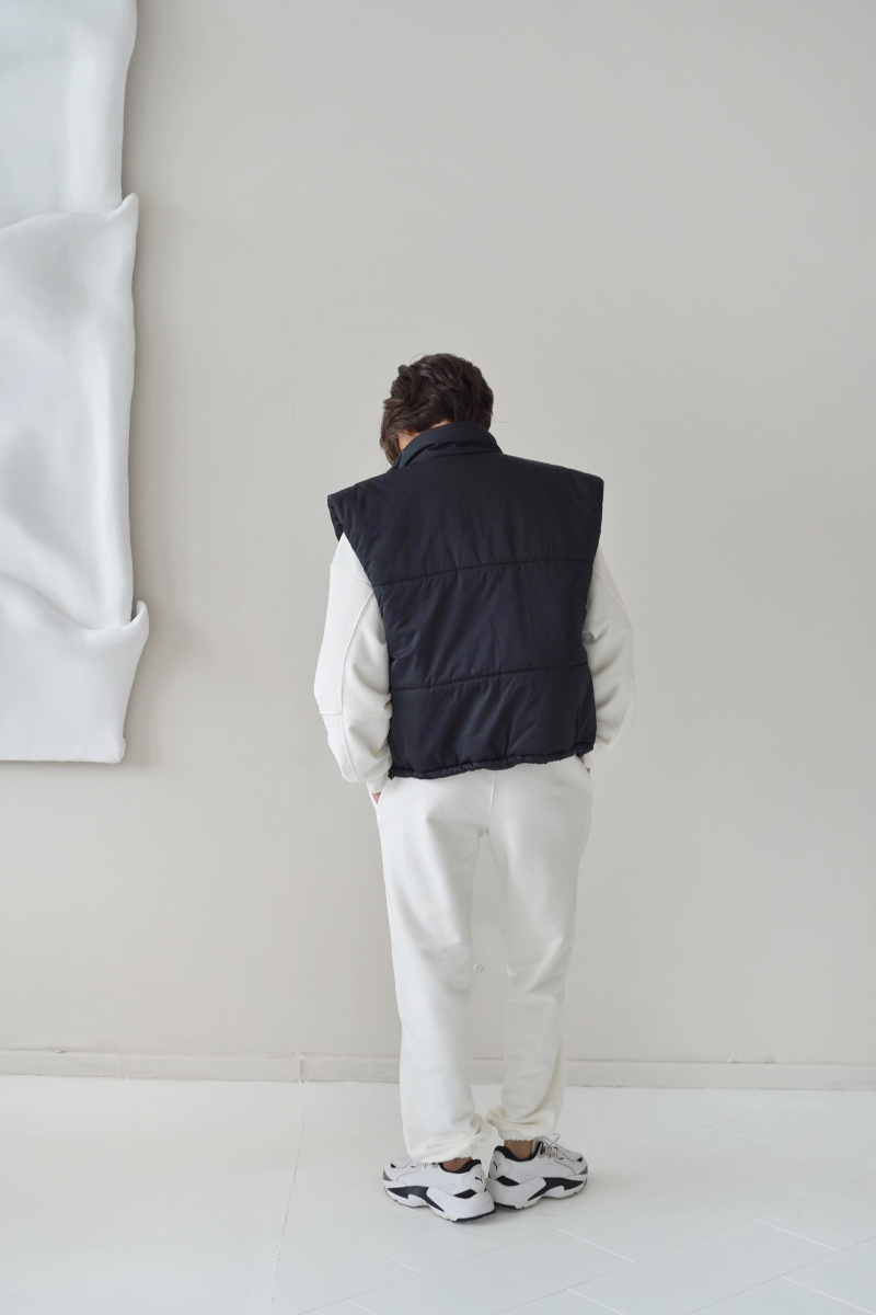 Жилетка выполнена из водоотталкивающей ткани на молнии, а также с не продуваемой планкой на кнопках, по низу затягивается кулисками, наполнитель: каландрированный синтепон 200г/м.