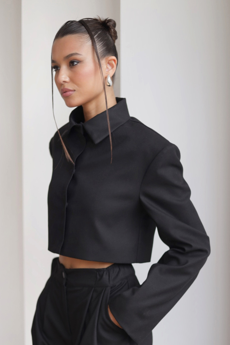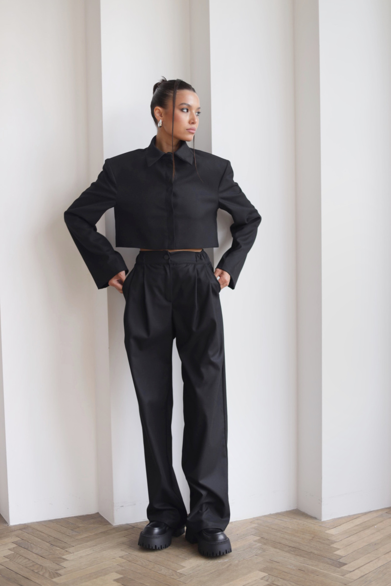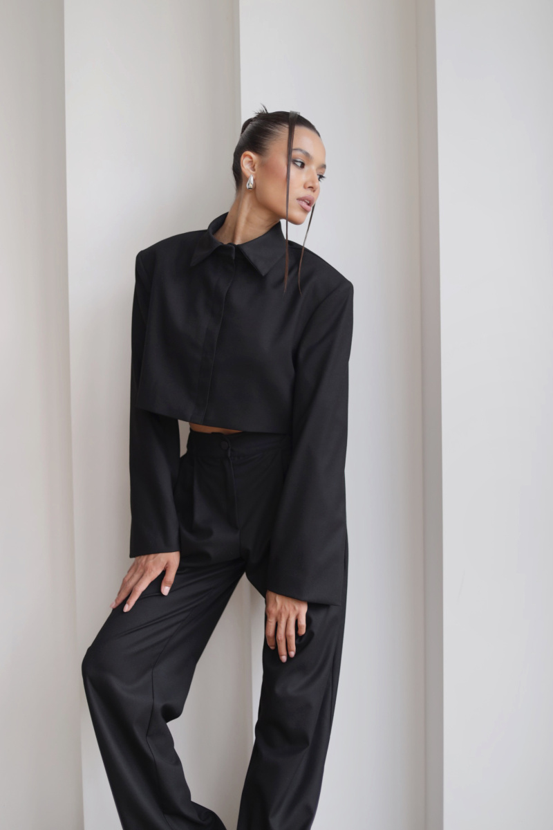 Укороченный жакет рубашечного типа из костюмной ткани на кнопках с воротником-стойкой, линия плеча расширена за счет подплечников.