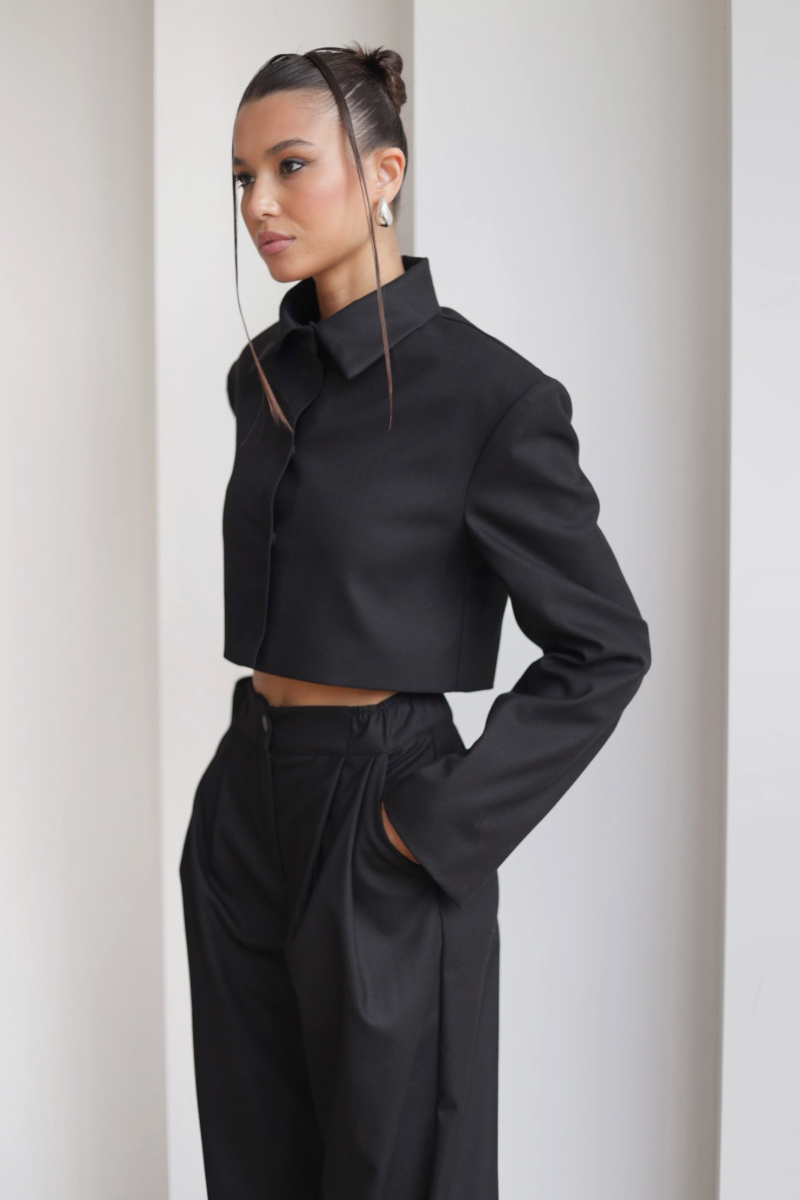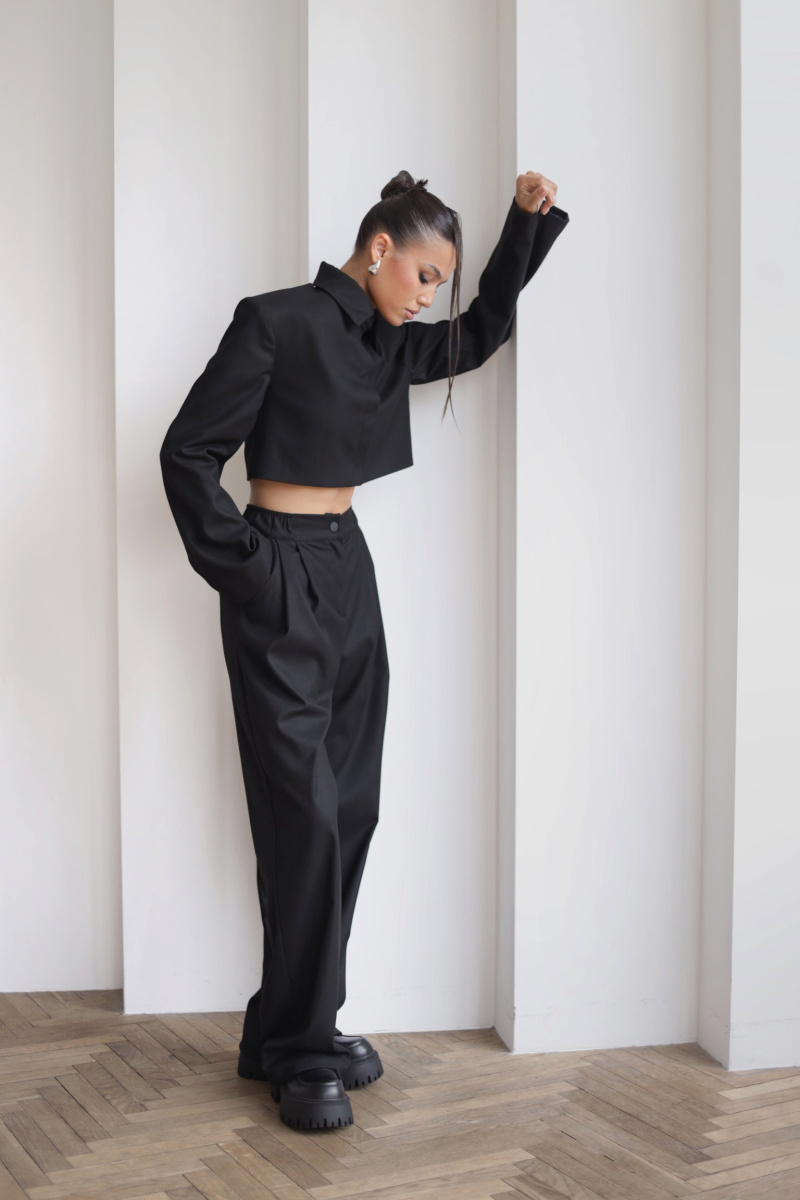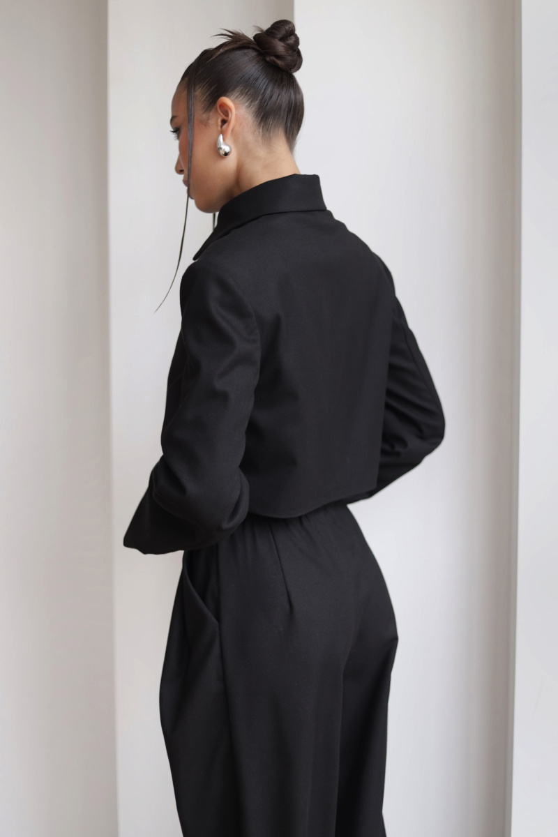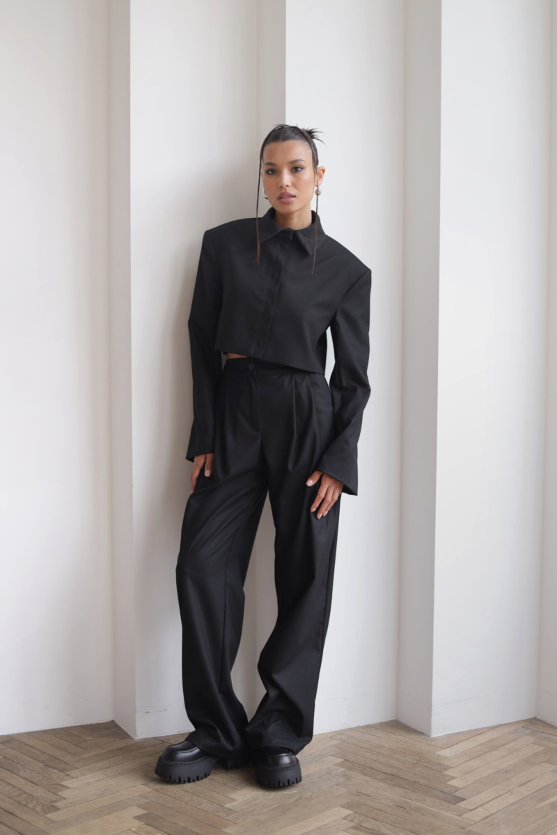 Укороченный жакет рубашечного типа из костюмной ткани на кнопках с воротником-стойкой, линия плеча расширена за счет подплечников.