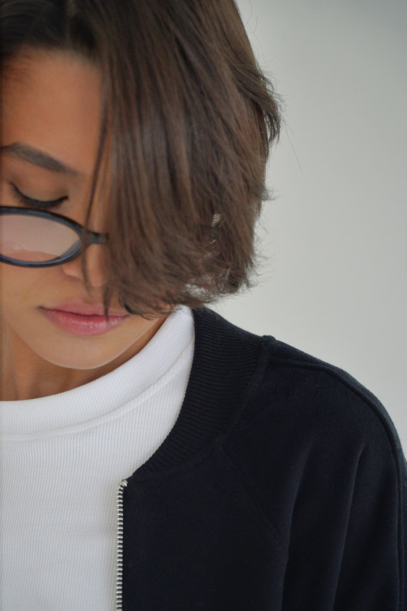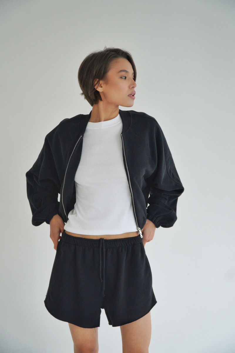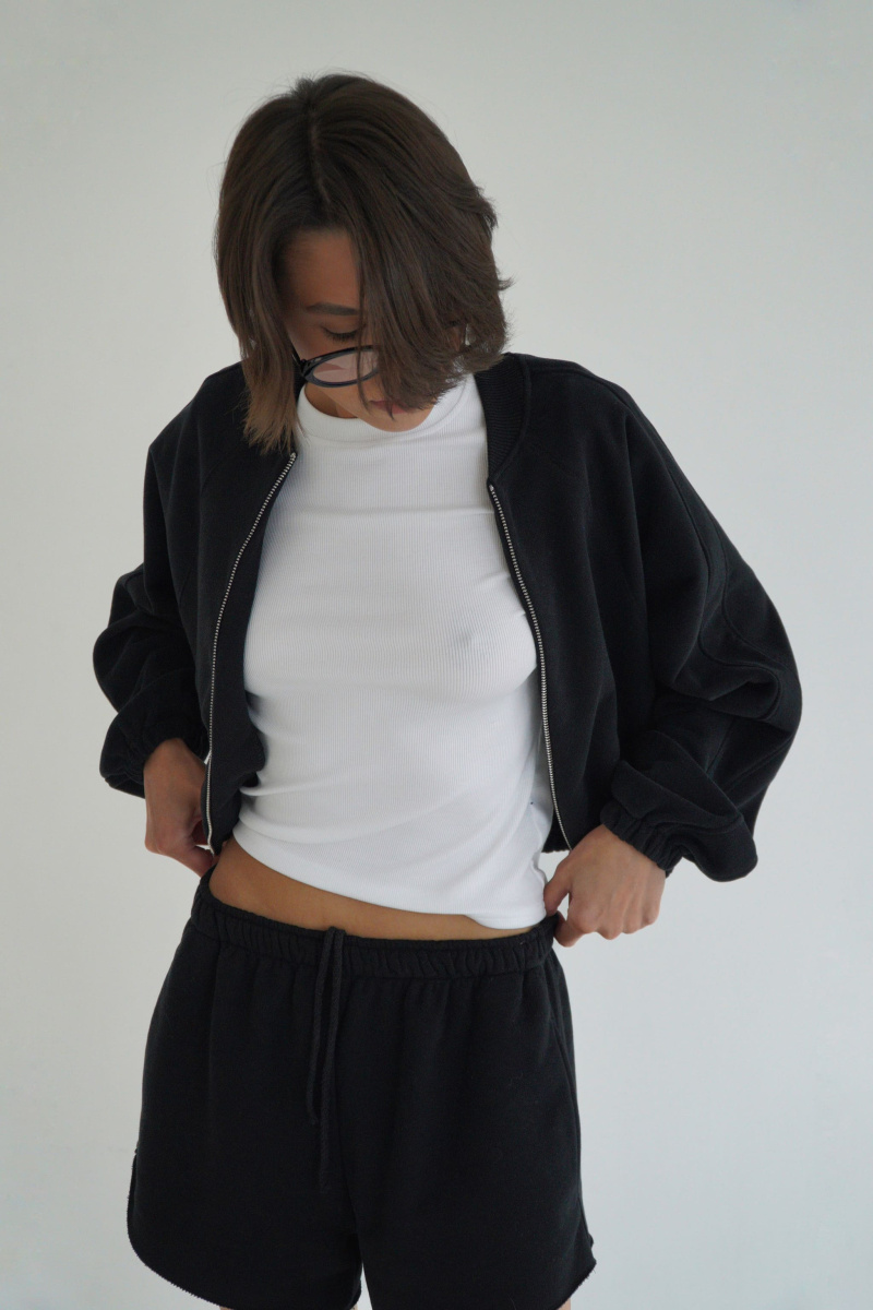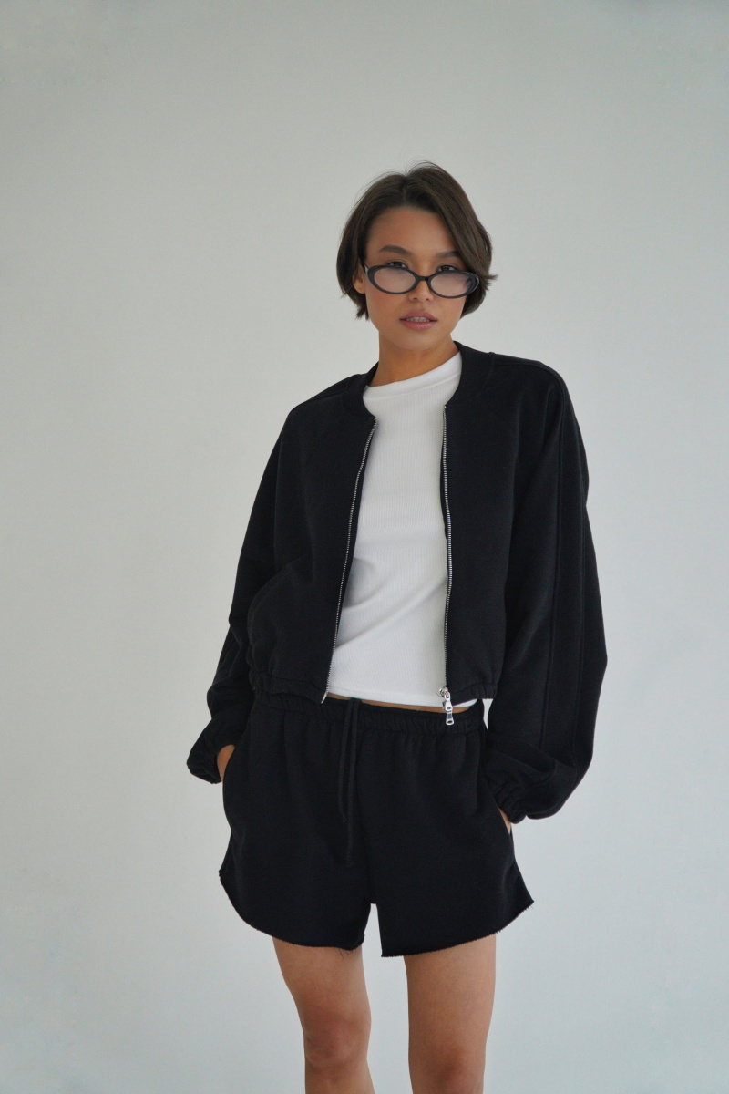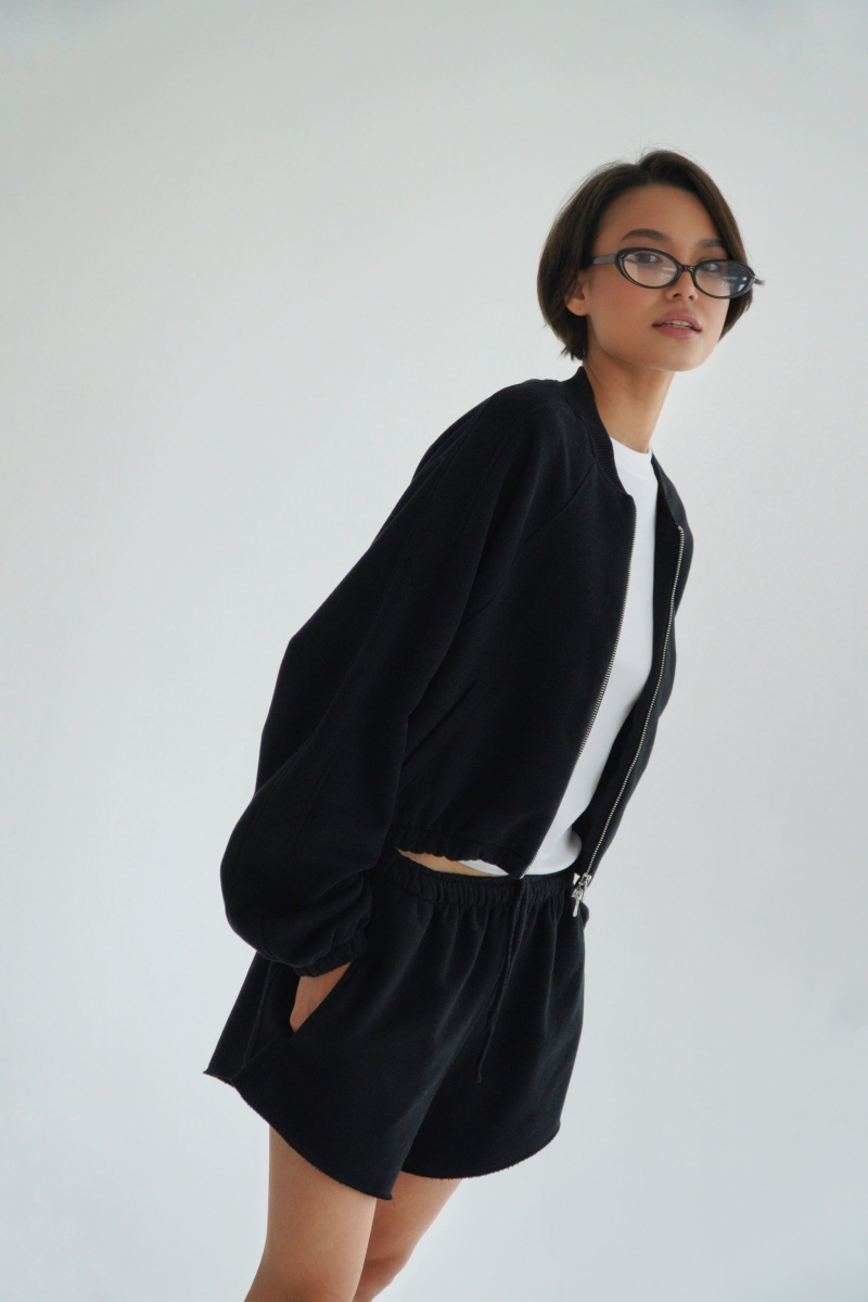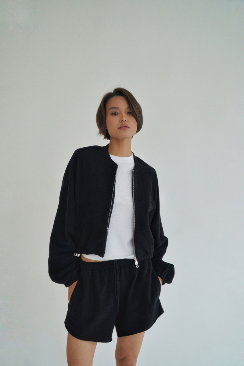 Укороченный бомбер с металличексой фурнитурой из футера трехнитки с велюровым эффектом, с рукавом кроя реглан, выпуклым логотипом сверху на спинке, регулируется кулисками по низу, с декоративными отстрочками по линии рукава, двумя прорезными карманами.