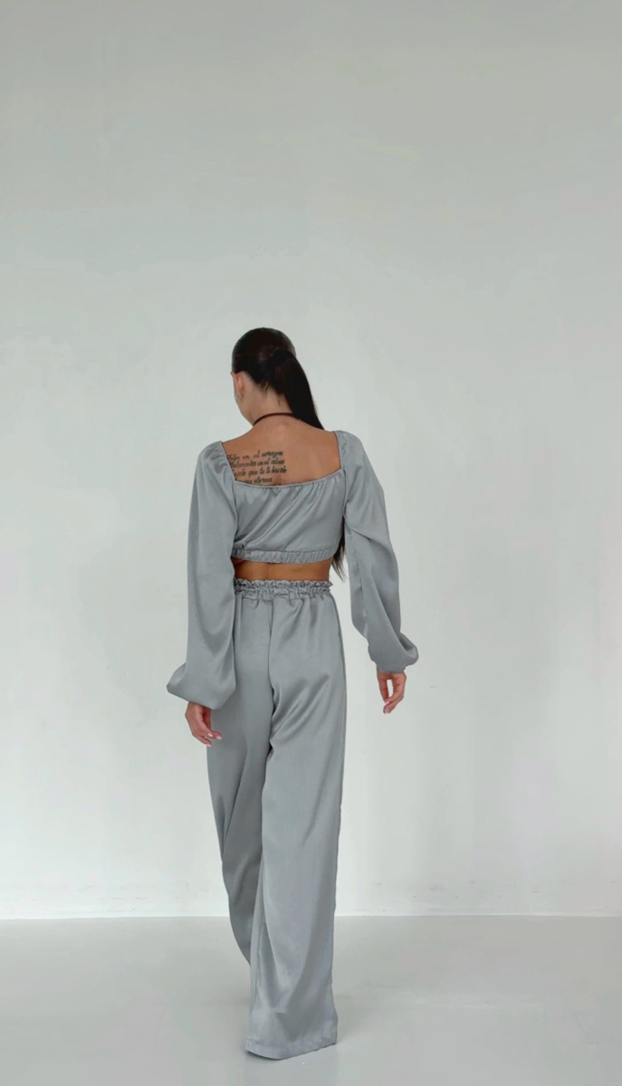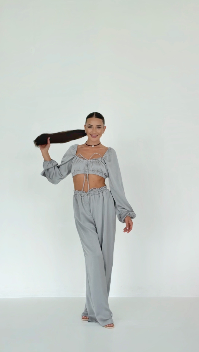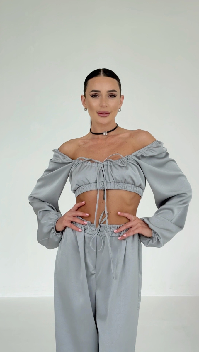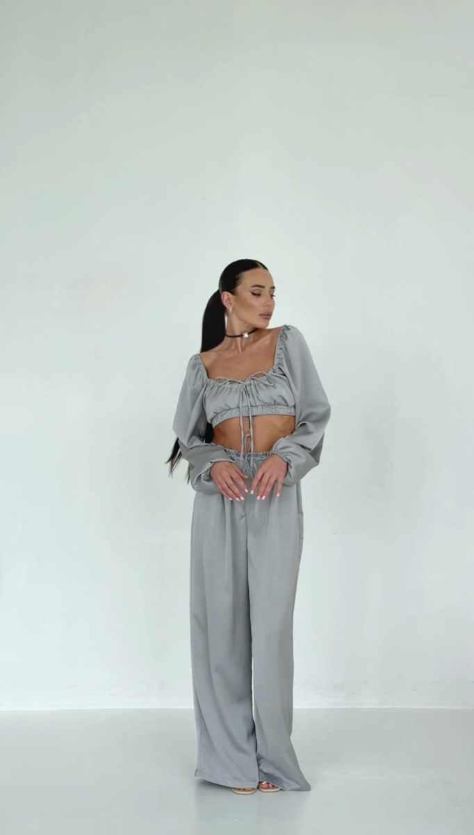 Брюки палаццо на высокой посадке из жатой ткани с отстроченной резинкой со сборкой и шнурком, выполнены с имитацией ширинки, без карманов.