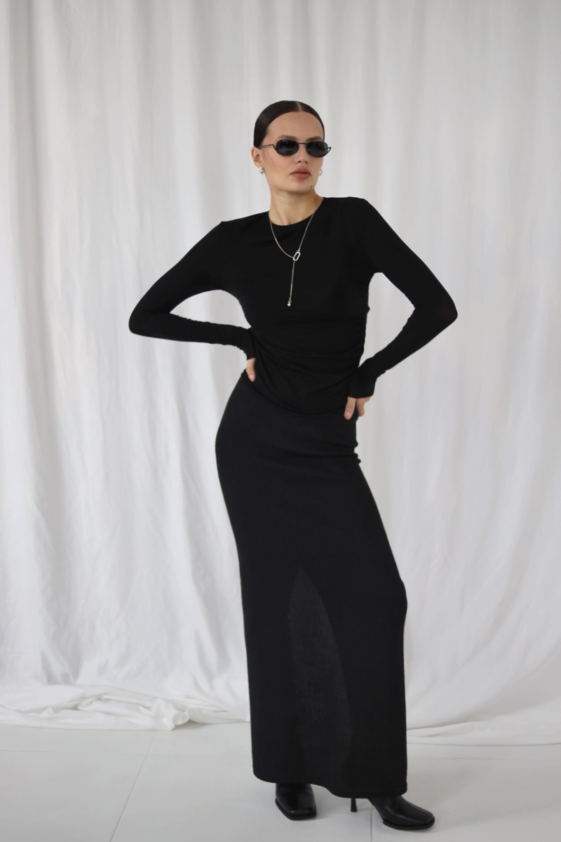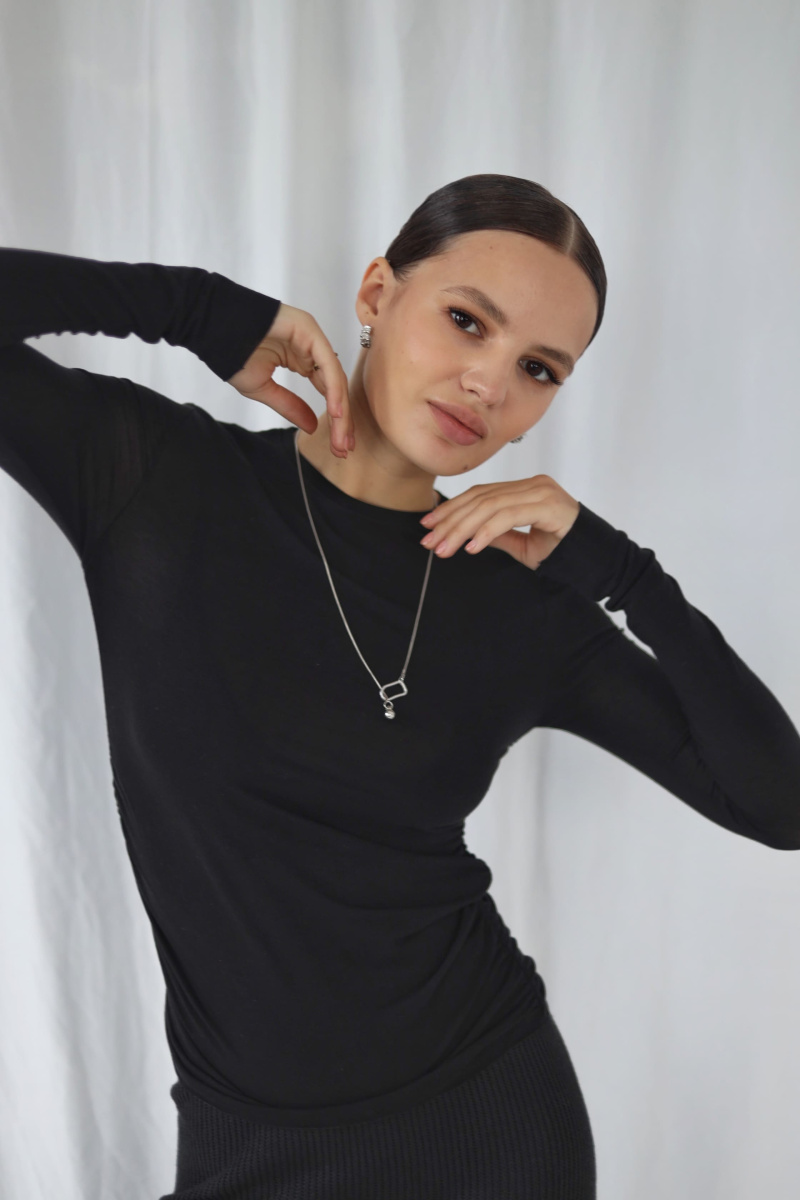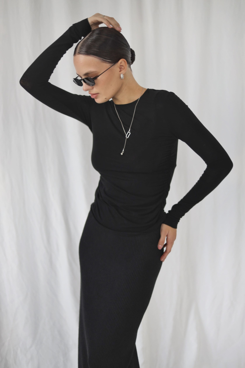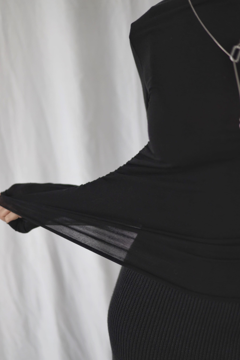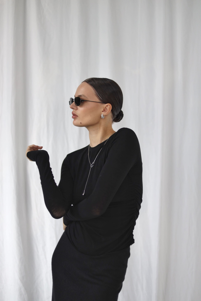 Базовый лонгслив из нежной полупрозрачной ткани со сборками по боковым швам.