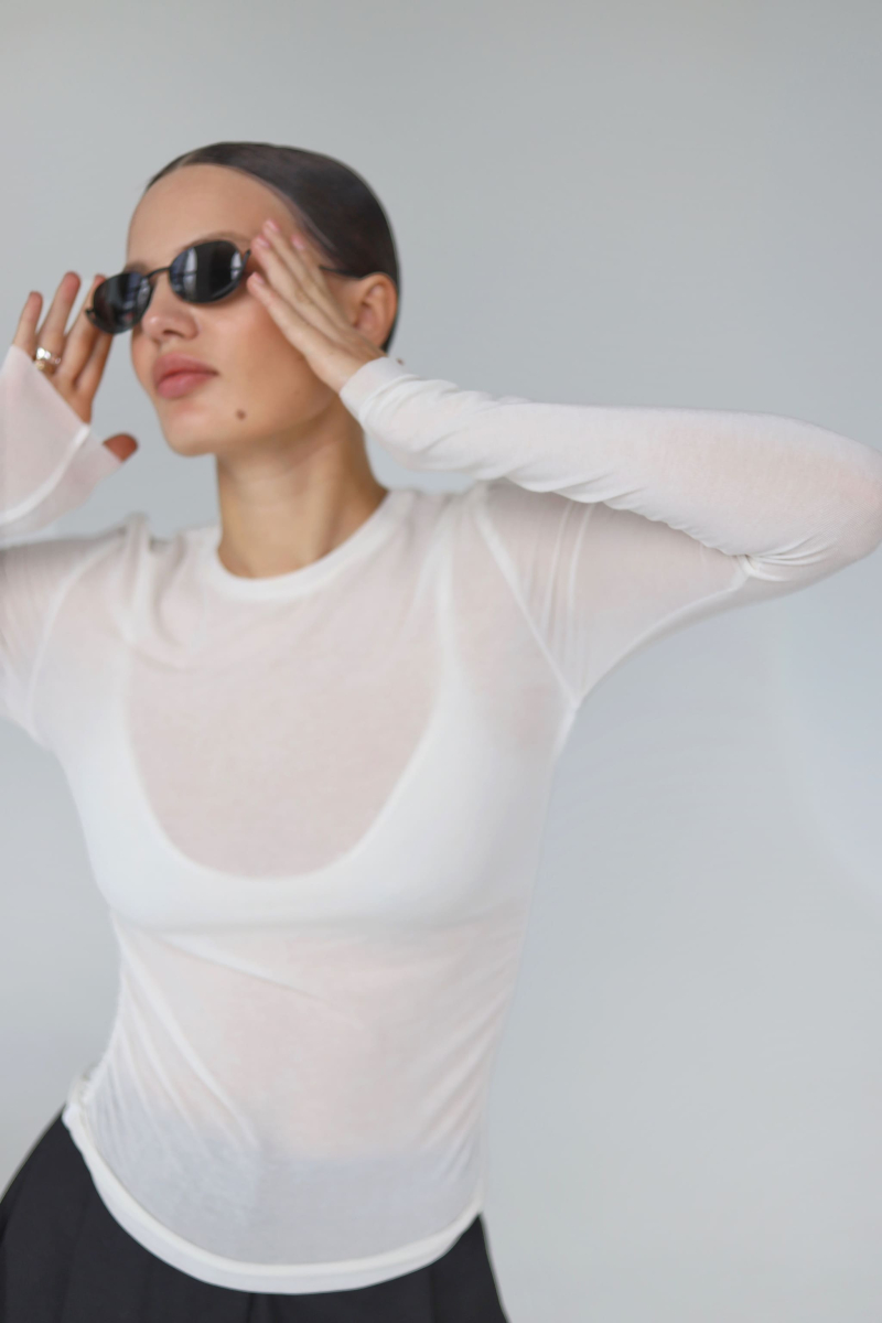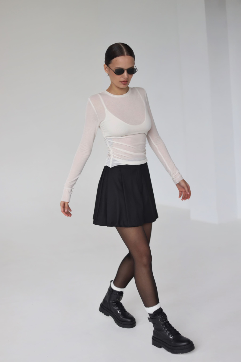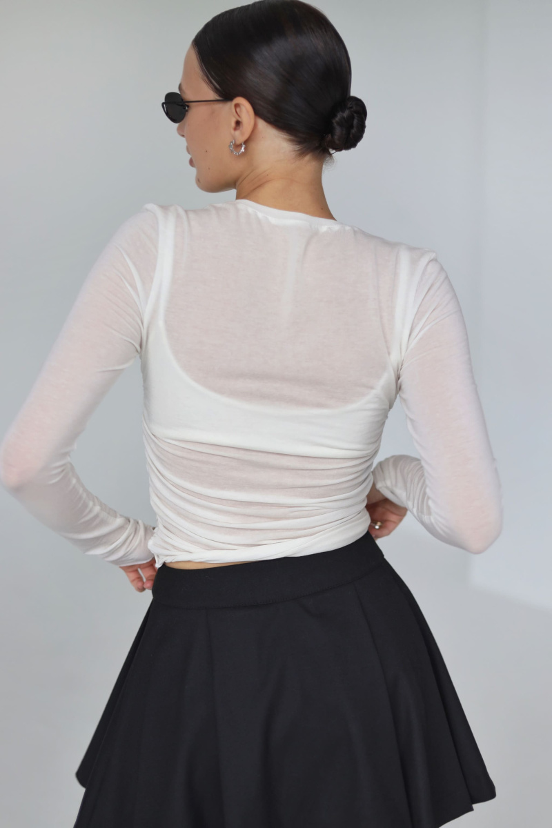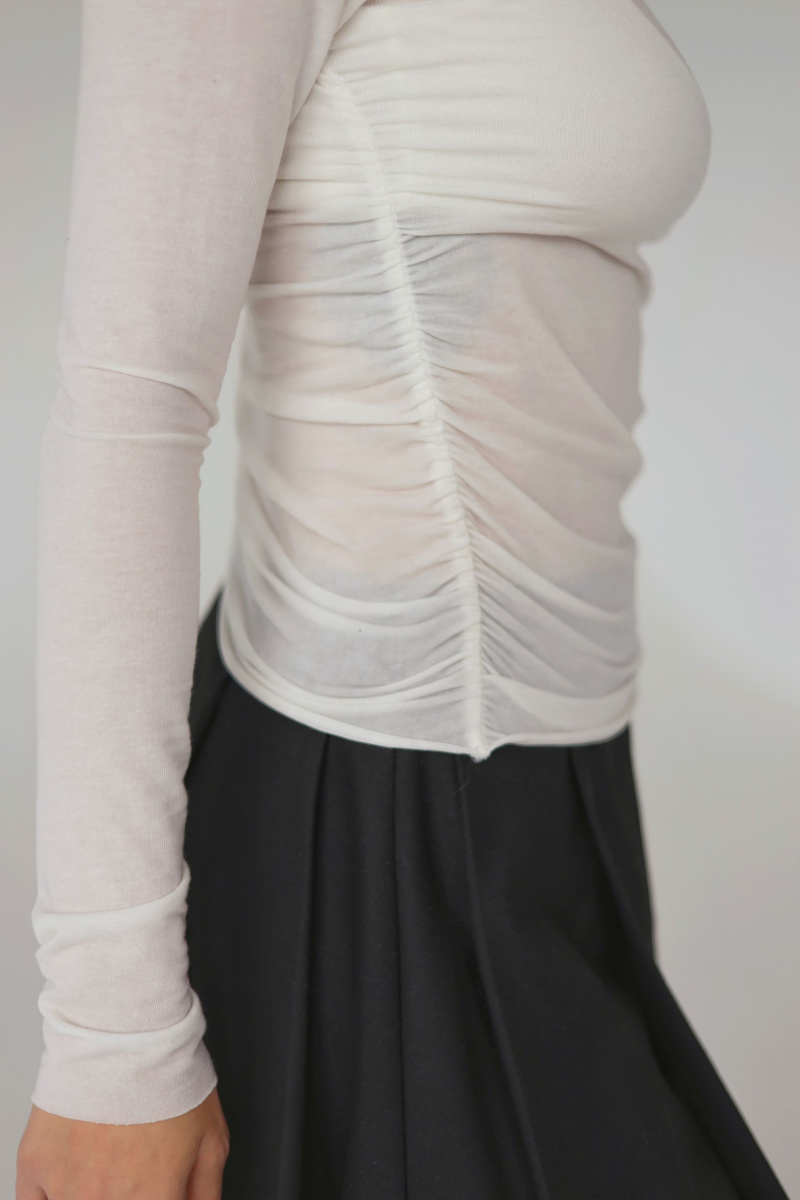 Базовый лонгслив из нежной полупрозрачной ткани со сборками по боковым швам.